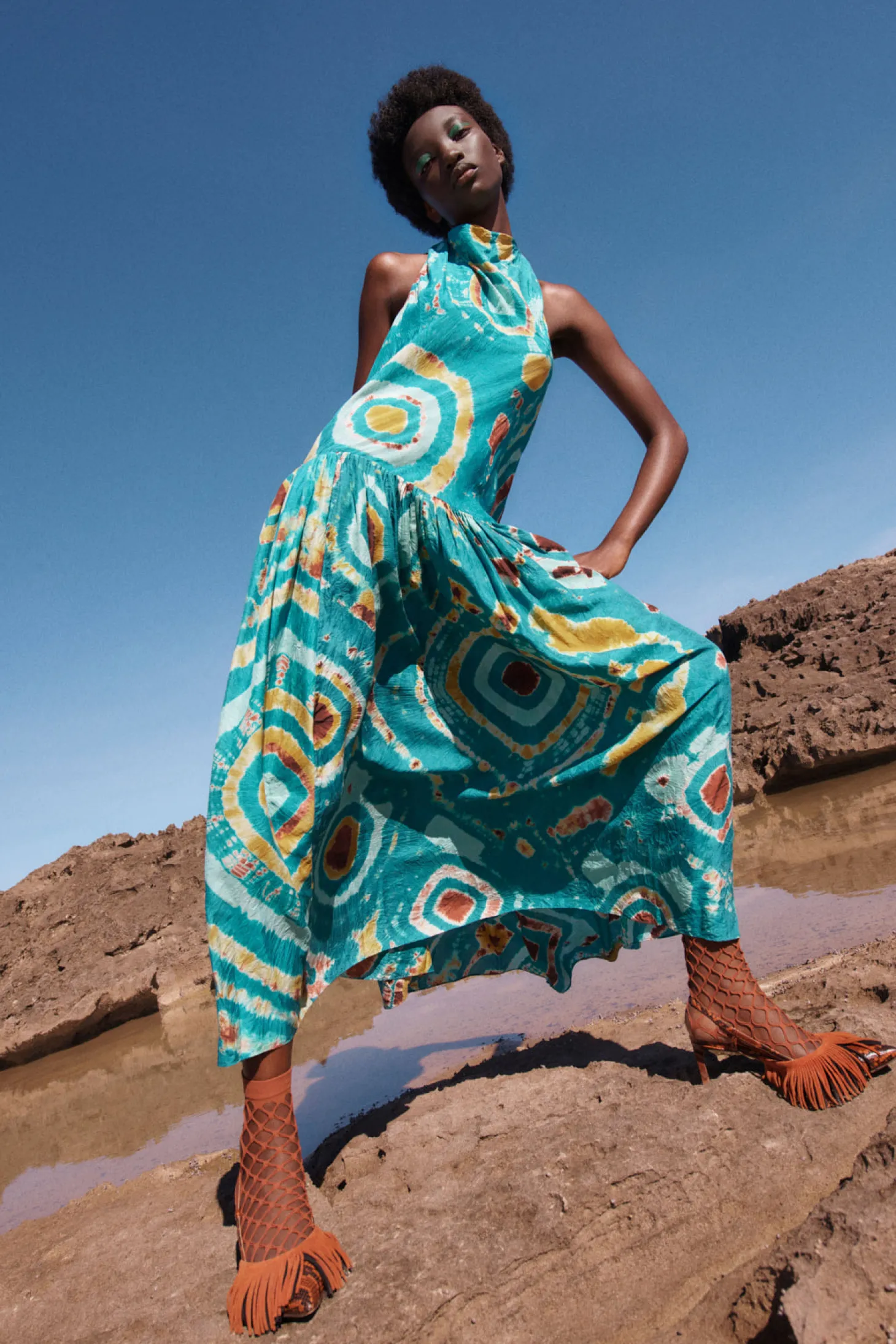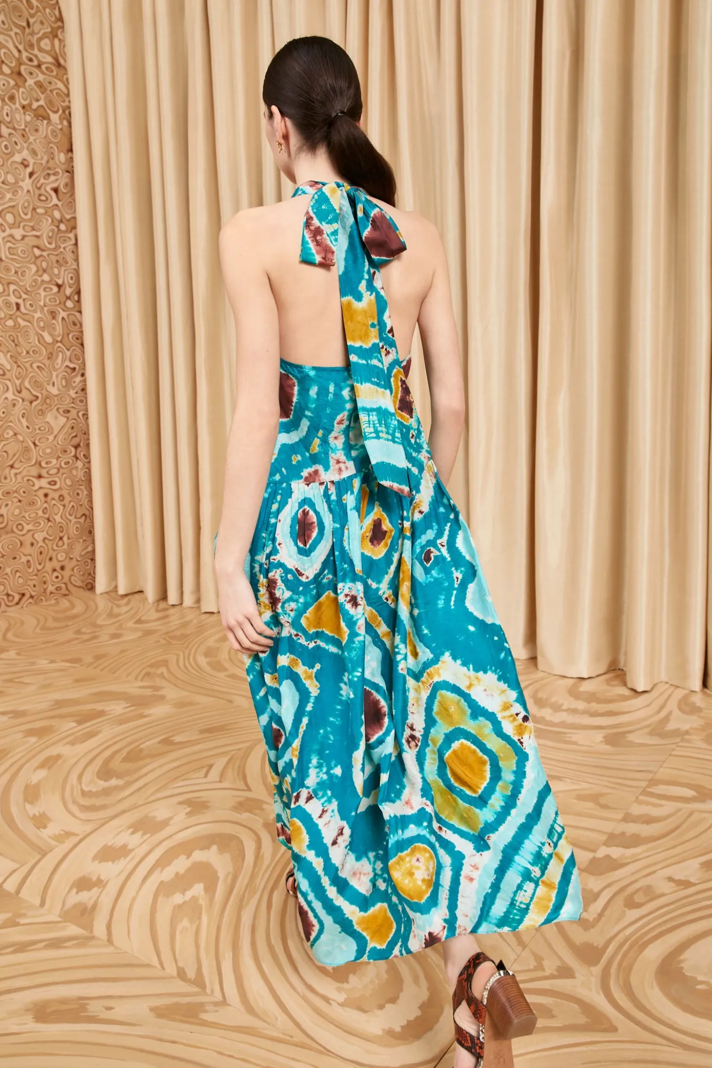 The Assa Dress is impeccably hand-dyed by our artisan partners—a women’s cooperative located in Bangalore on a rehabilitated coconut nursery that’s dedicated to consciously crafted textiles. Made from lightweight silk habotai, female artisans carefully hand-tie and dye the fabric, creating a one-of-a-kind fusion of jewel tones with blue, yellow, and red. This midi silhouette features a cowl neckline and a softly gathered skirt. It fastens with ties and a button closure at the halter neck.