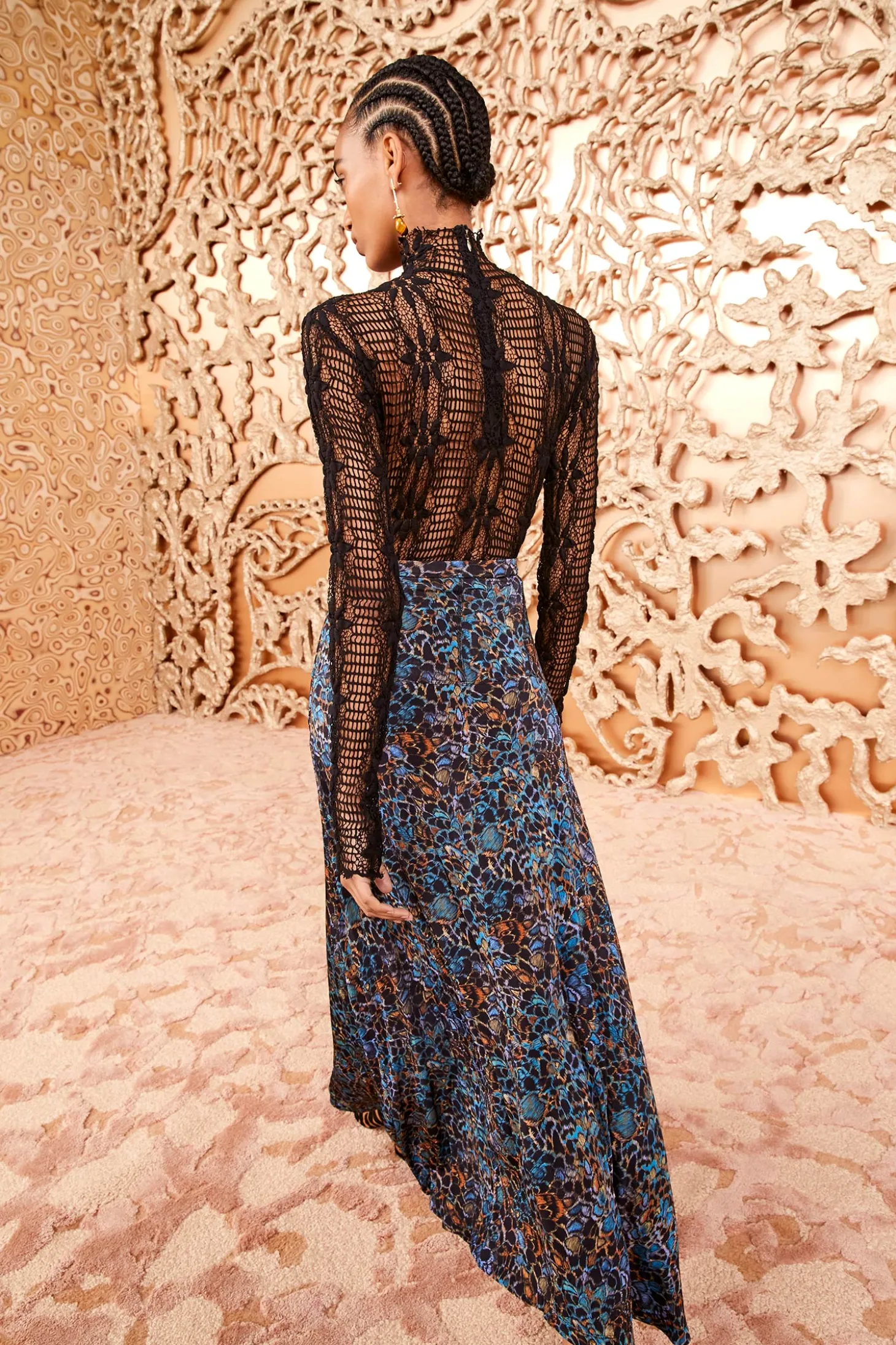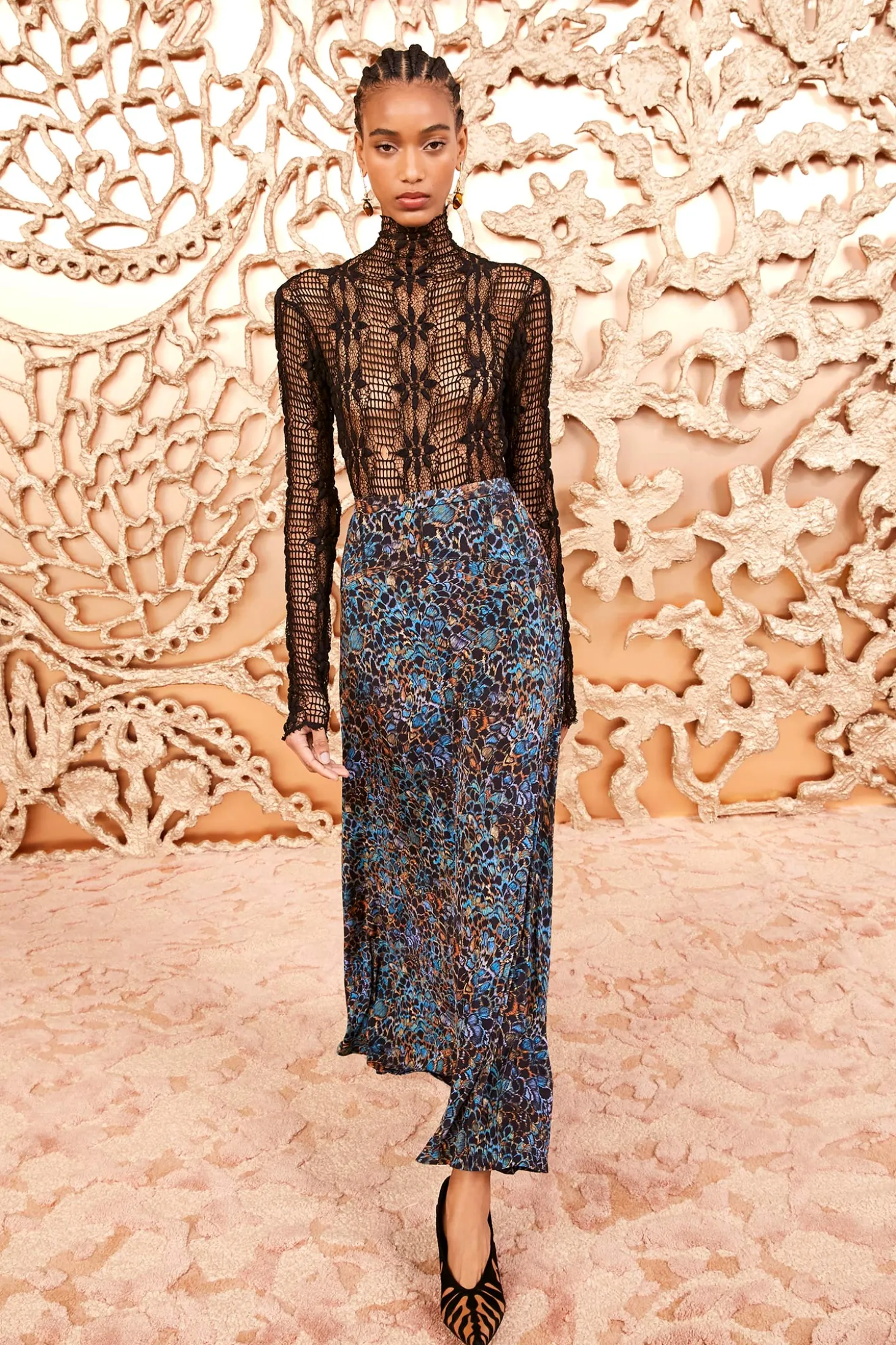 Made from our lightweight and stretchy tricot jersey, this Paola Skirt is awash in our feather print alive with swirling blue, orange, and black hues. It has a high, fixed waist and skims the form before grazing right above the ankle. This beauty fastens with a side-seam zipper.