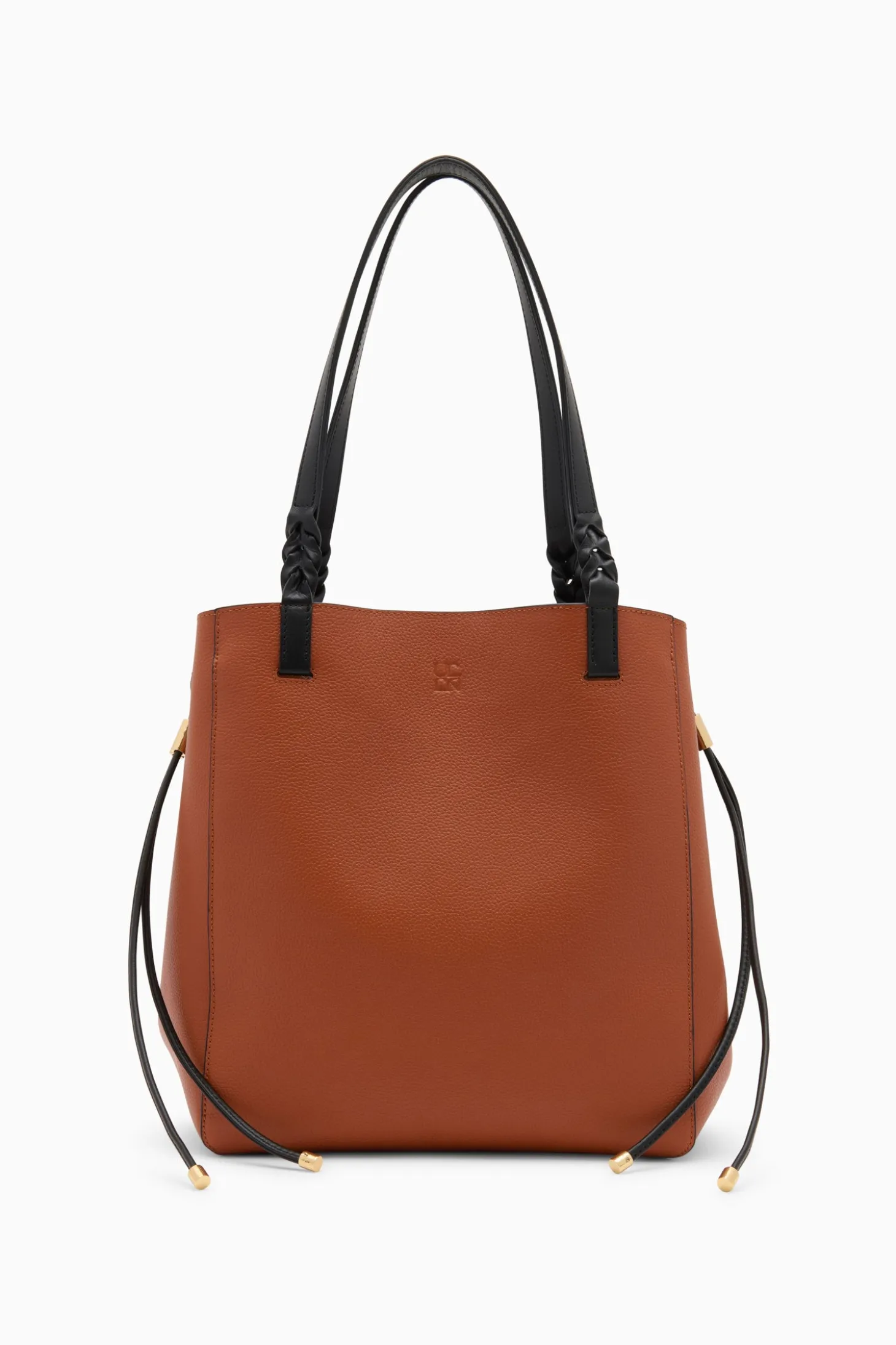 Our signature Alma Tote is the perfect everyday size—spacious but still compact and elegant. Crafted from brown pebbled leather, it features exquisite braided detailing at the black handles and side drawstrings that can cinch or expand the silhouette. This style easily slips over your shoulder, and it has a suede-lined interior with a convenient zipped pocket.