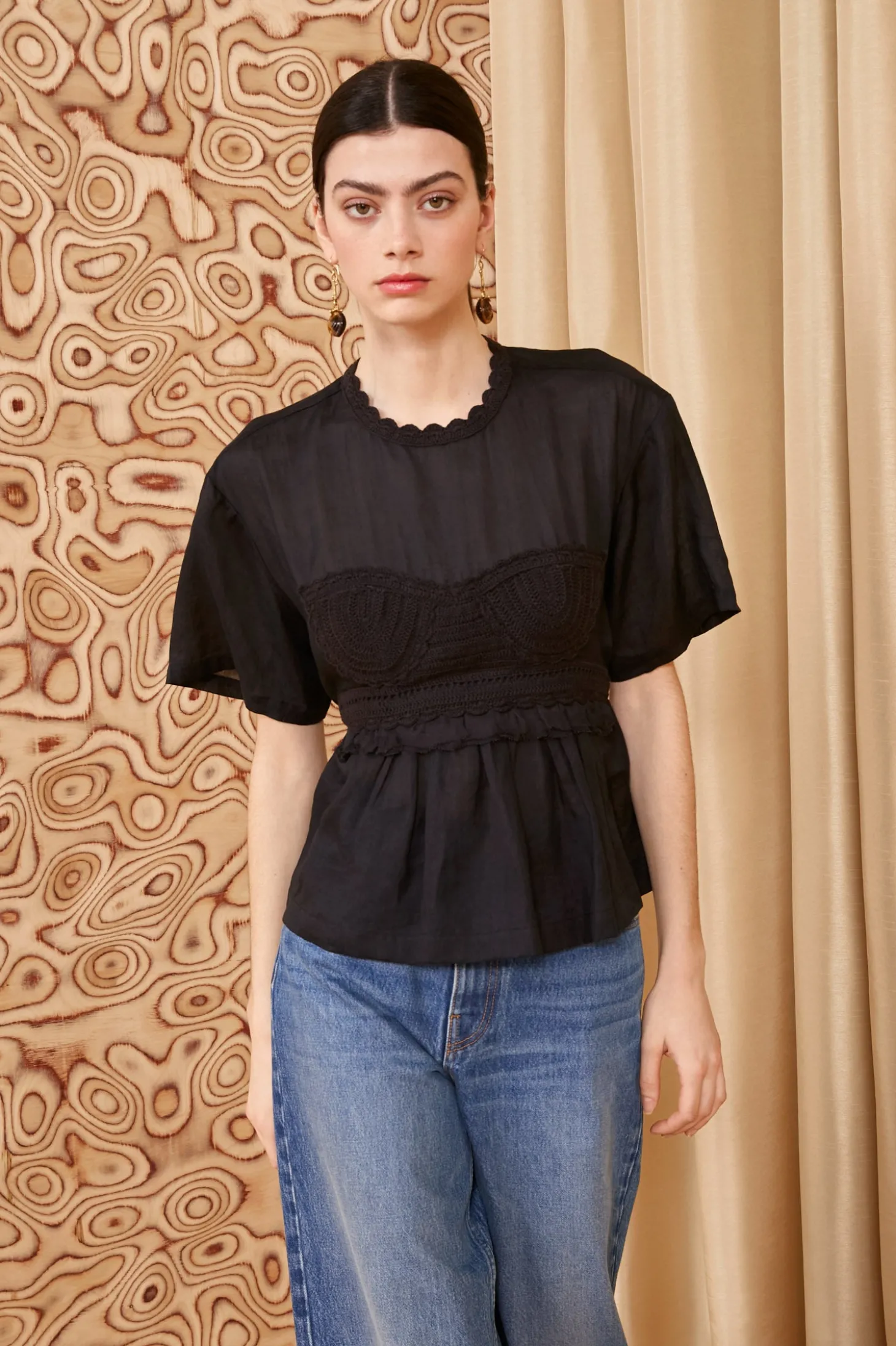 The Cari Top is a modern and feminine T-shirt crafted from ramie, an eco-friendly fabric made from plant fibers that’s soft and lightweight. Arriving in versatile black, this loose-fitting style is appliquéd with hand-crocheted cotton that’s carefully engineered to outline the form for a perfect fit. The waist ties can be tied to cinch the silhouette, or left swaying for a unique tassel-like effect. It fastens with a buttoned keyhole at the back.