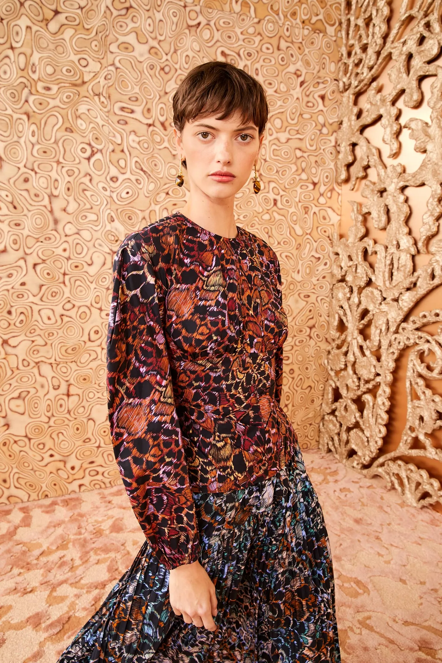 Featured in Look 5 of our Autumn/Winter ‘24 runway show, the Celie Blouse arrives in our signature cotton poplin adorned with a swirling feather pattern highlighted by jewel tones that bring vibrancy and dimension to the print. It has a round neckline and billowing sleeves balanced by a fitted waist for a flattering fit. This beauty fastens with a center-back zipper.