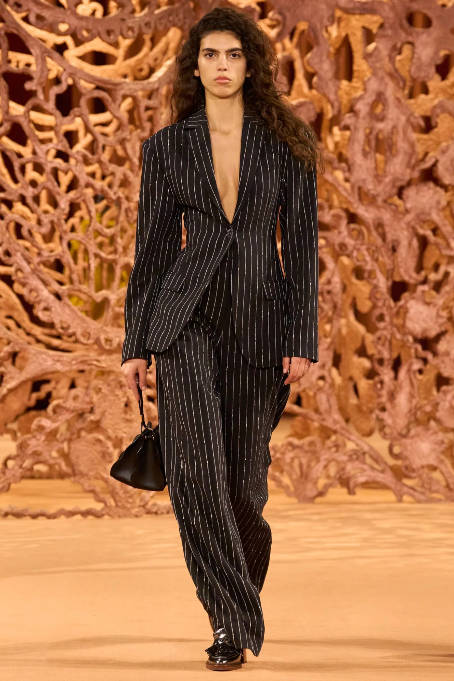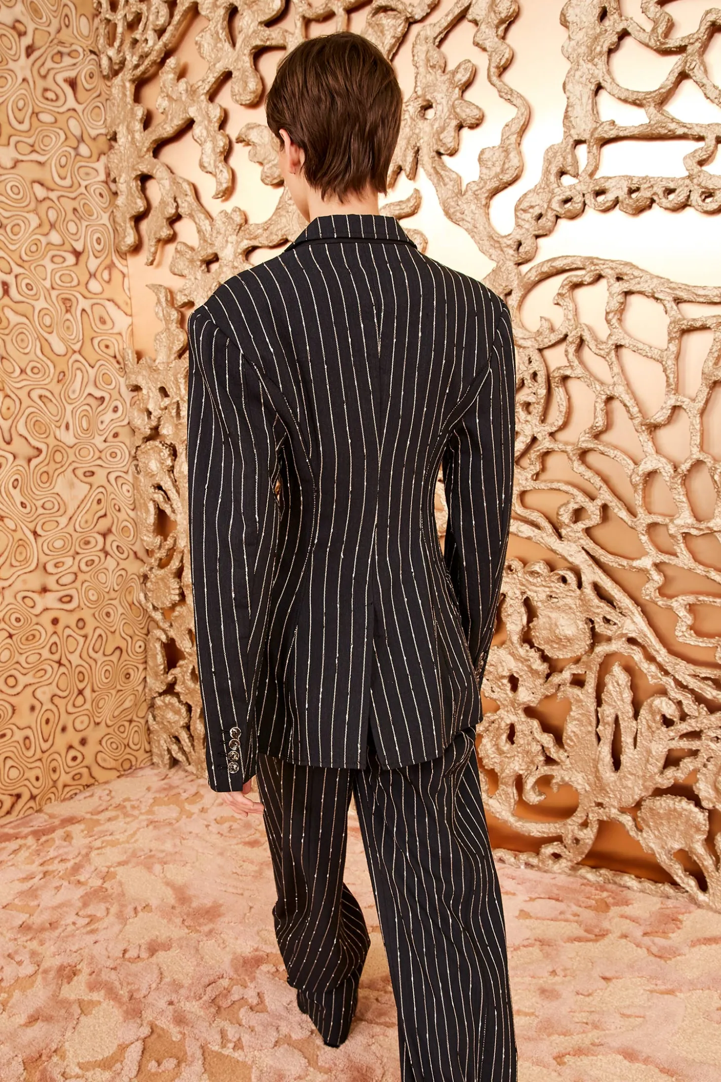 A key silhouette from Look 3 of our Autumn/Winter ‘24 runway, the Dhemi Jacket is masterfully tailored from our Italian wool suiting with classic pinstripes and a slightly slubbed texture. Borrowing codes from menswear, this single-breasted jacket has sharp shoulders and beautifully nips in at the waist when worn closed. It has classic notch lapels, a back vent, and is finished with a lustrous shell button. Coordinate with our matching Carine Pant.