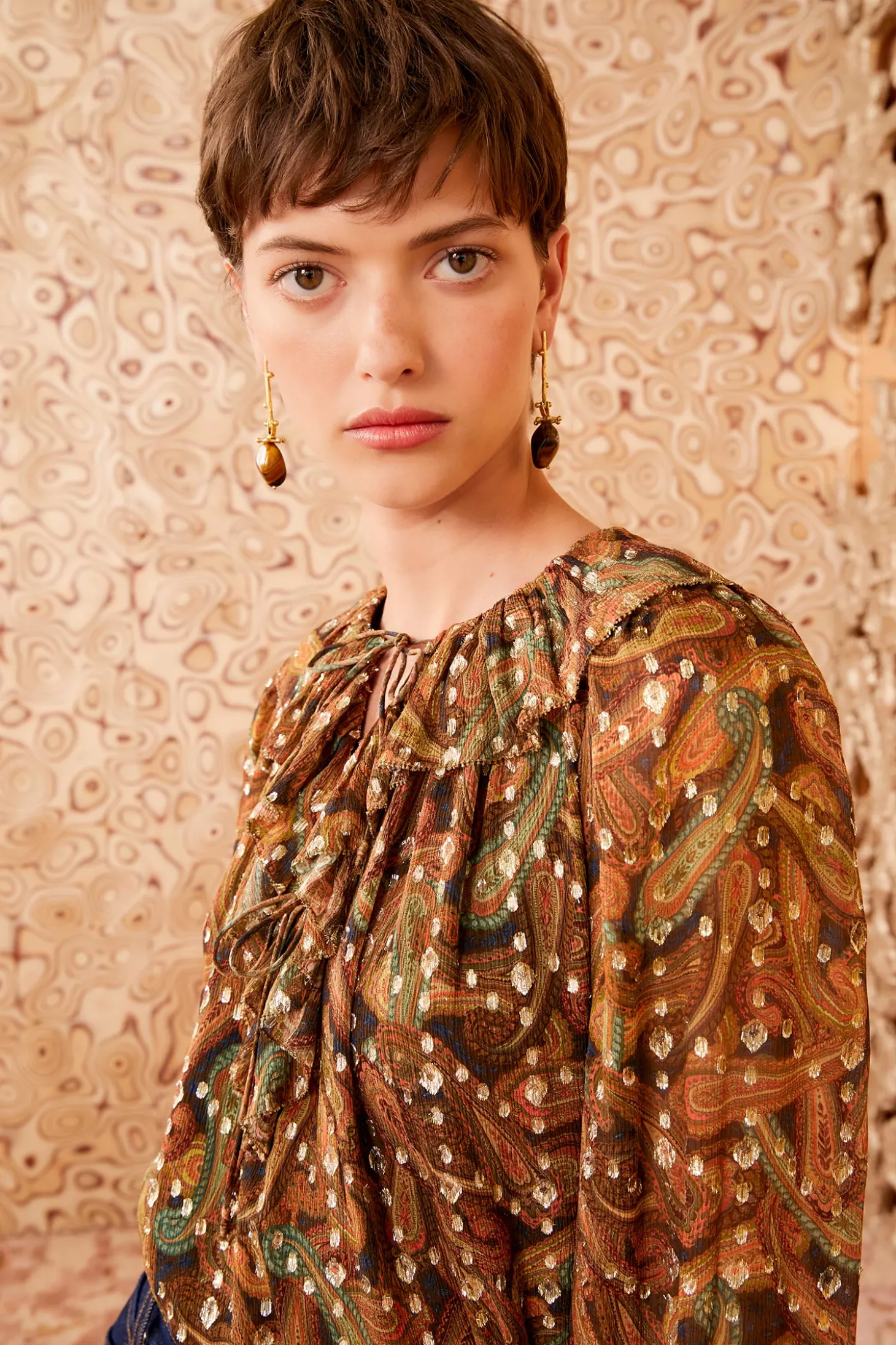 An ethereal beauty, our crinkle chiffon Emilie Blouse comes alive with golden lurex dots that are woven into the fabric and vibrant paisleys inspired by hand-painted artwork. This romantic, long-sleeve style arrives in deep gold and brown hues, has a ruffled collar that spills out across the neckline, and has double ties that fasten at the front. It pairs effortlessly with our handcrafted denim and tailored separates.