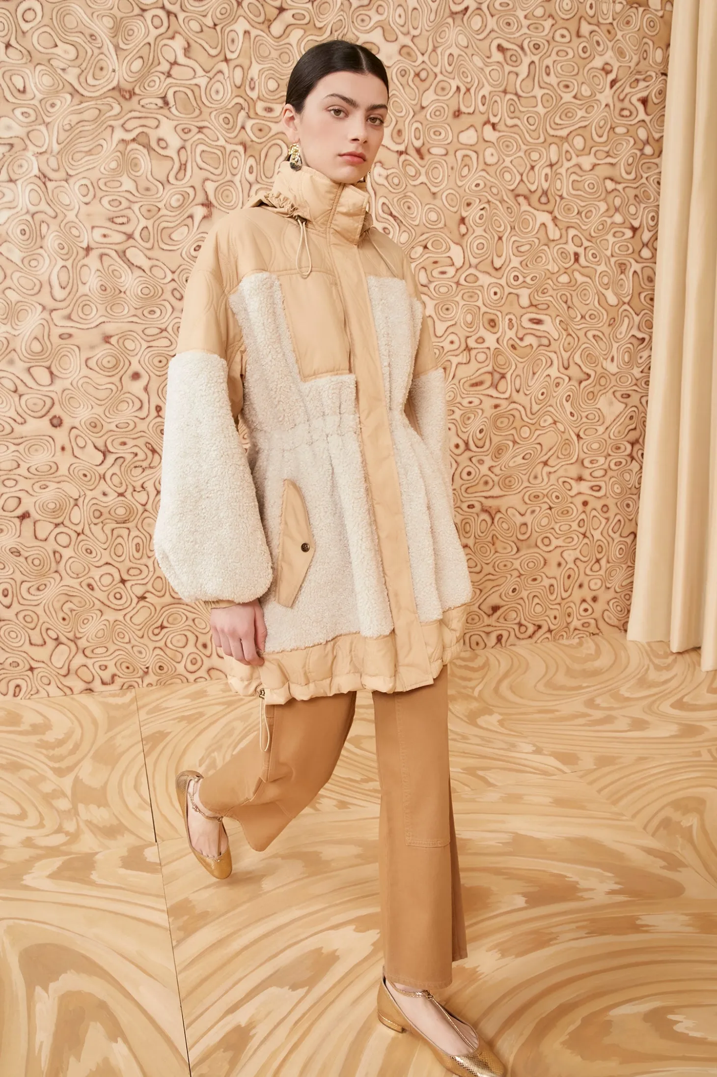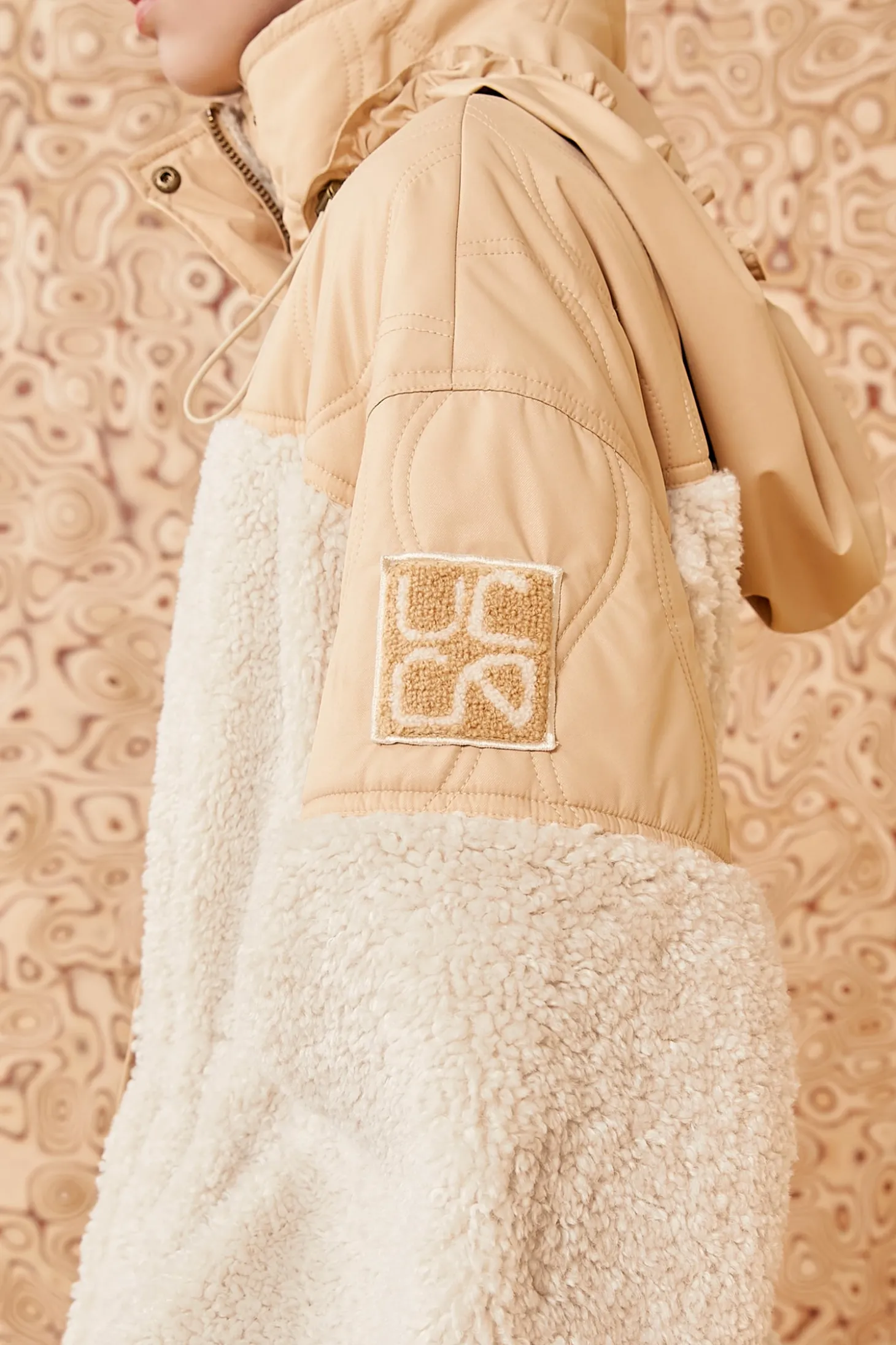 Our Hayes Coat cocoons you in a luxe combo of teddy fleece and lightweight quilted sateen. Arriving in elegant cream and khaki hues, it has bungee detailing at the hood and hem for adjustability and nips in at the elastic waist, highlighting your silhouette. This cozy, mid-thigh style features front patch and flap pockets and fastens with a zipper and snaps at the front. Our signature monogram adorns the sleeve.