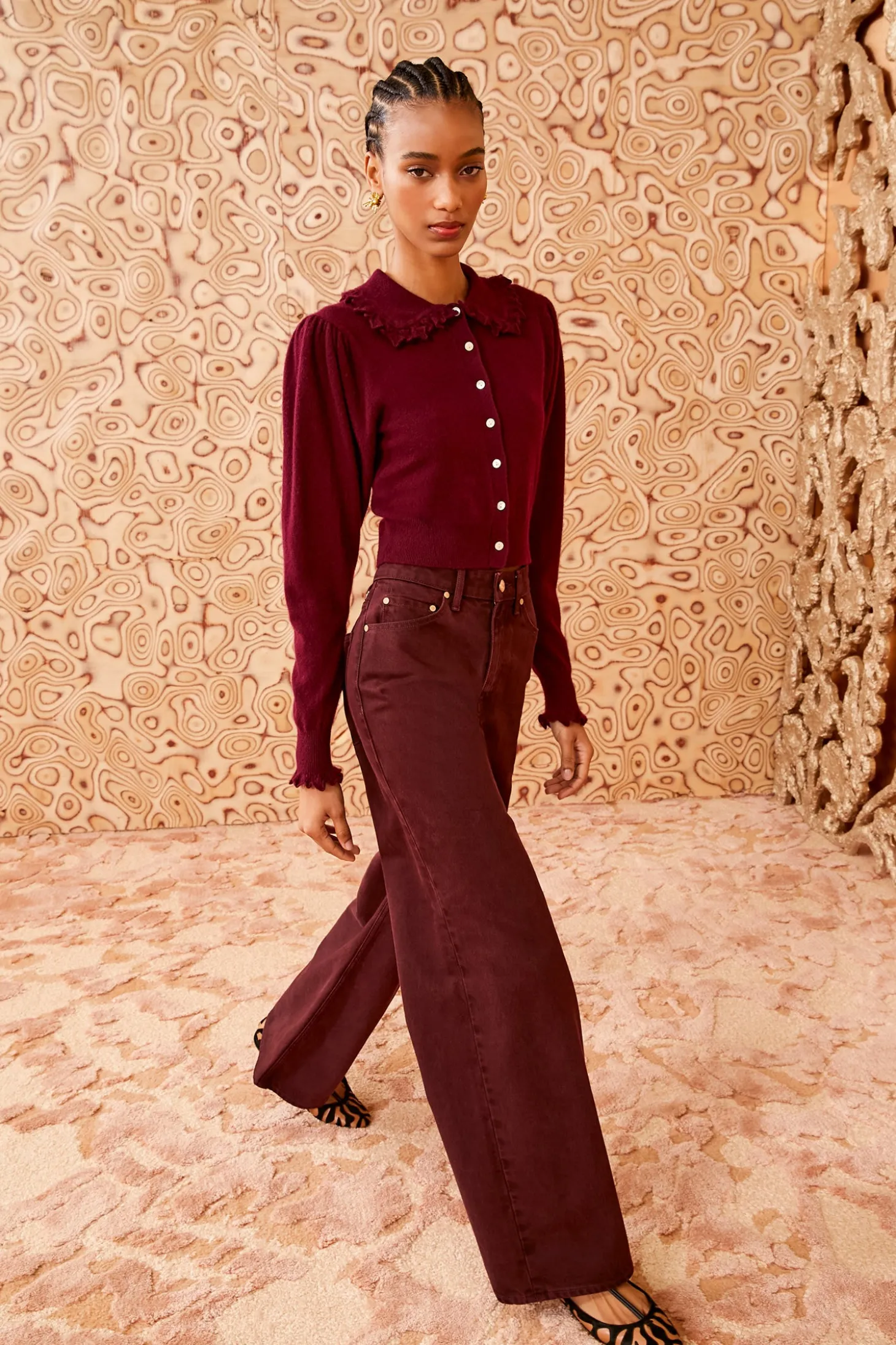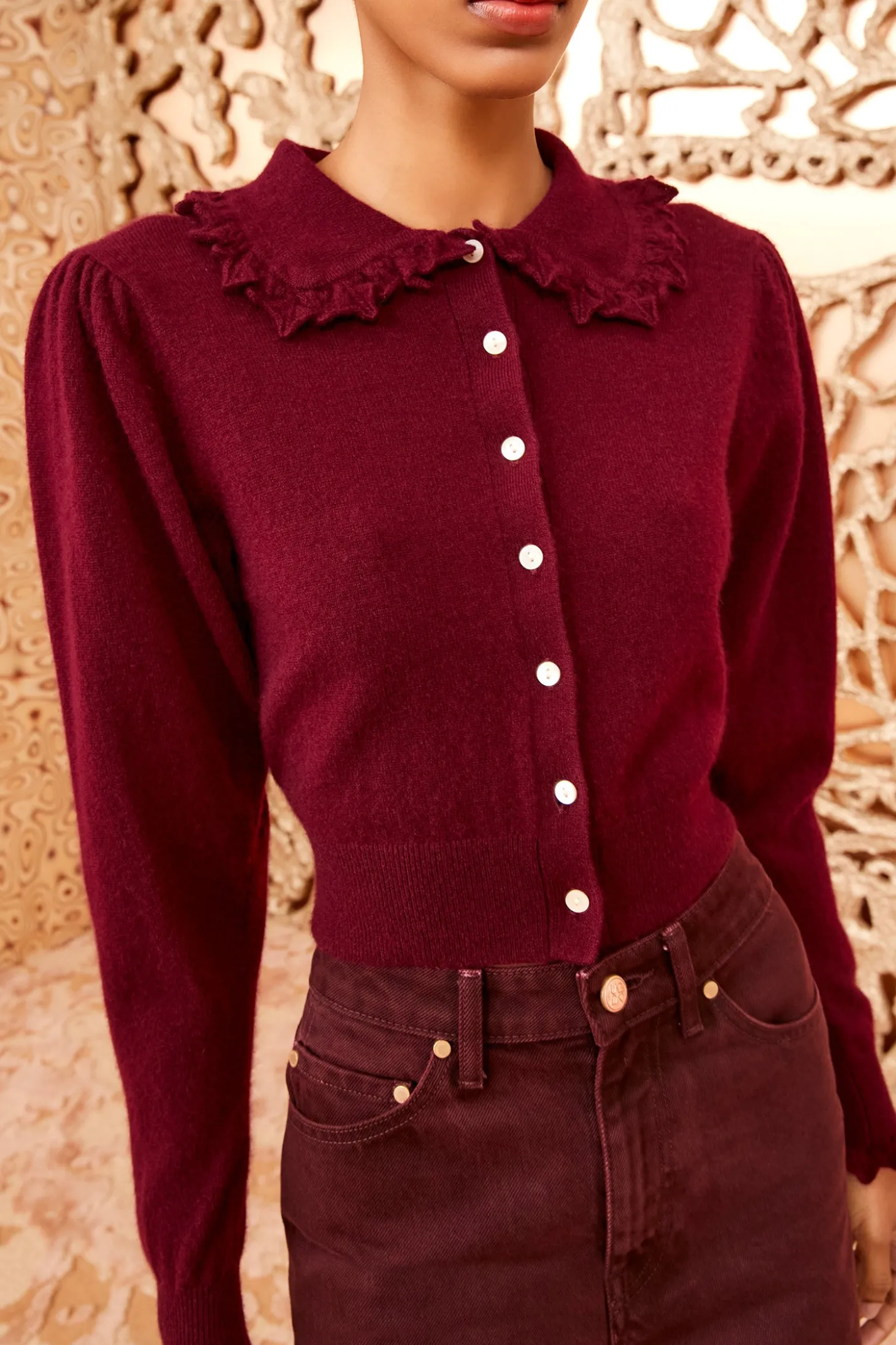 Our Kalila Cardigan arrives in luxurious cashmere tinged a deep malbec red. This essential lovely is lightly gathered at the shoulders, has long sleeves, and is traced with romantic frills at the collars and cuffs.
