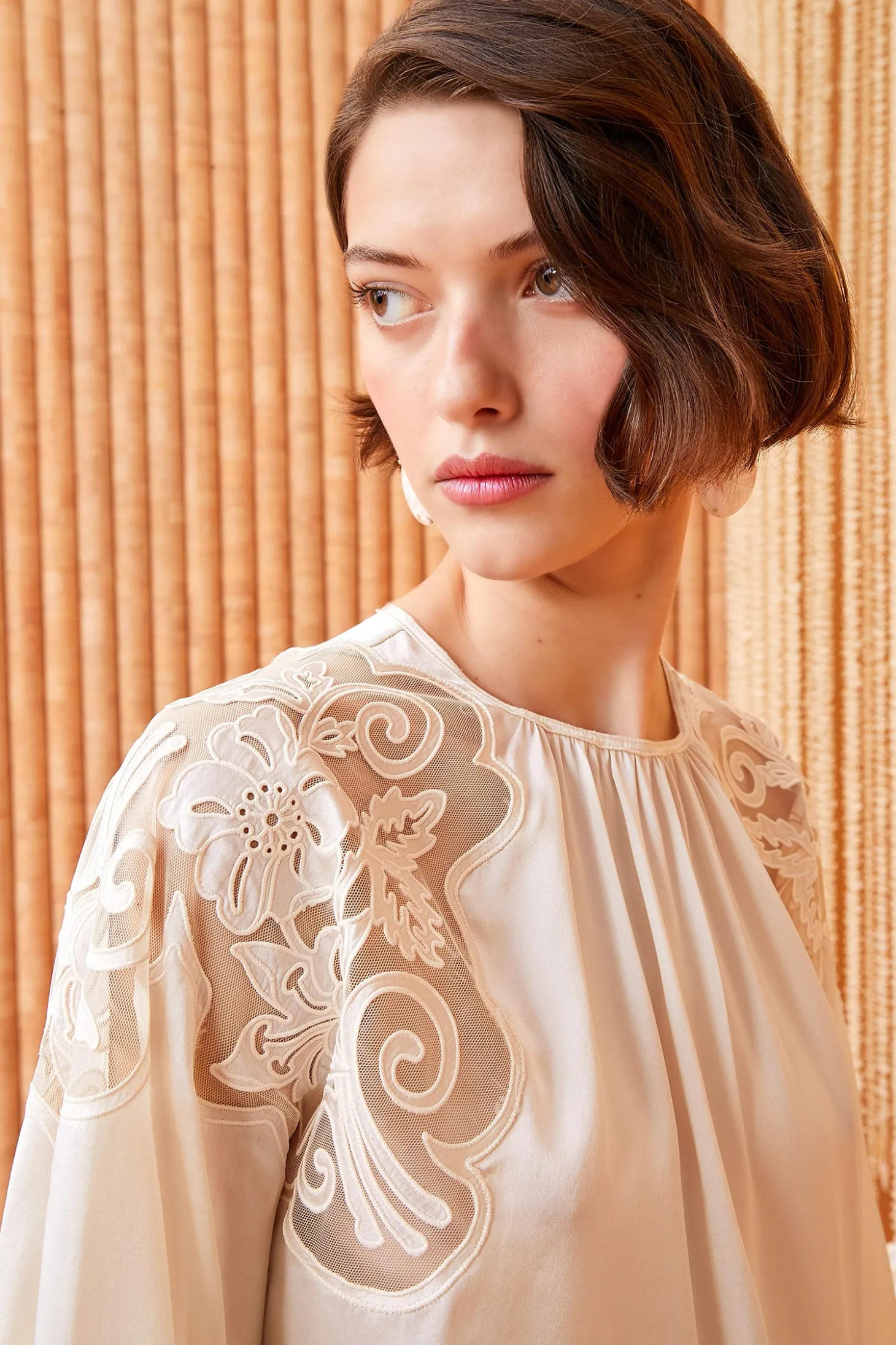 Flowy and romantic, our Mathilde Blouse is made from the smoothest white silk charmeuse with tulle panels decorated with floral appliqués. It features an elegant round neckline with voluminous sleeves and easily pairs with our handcrafted denim or tailored separates from your wardrobe.
