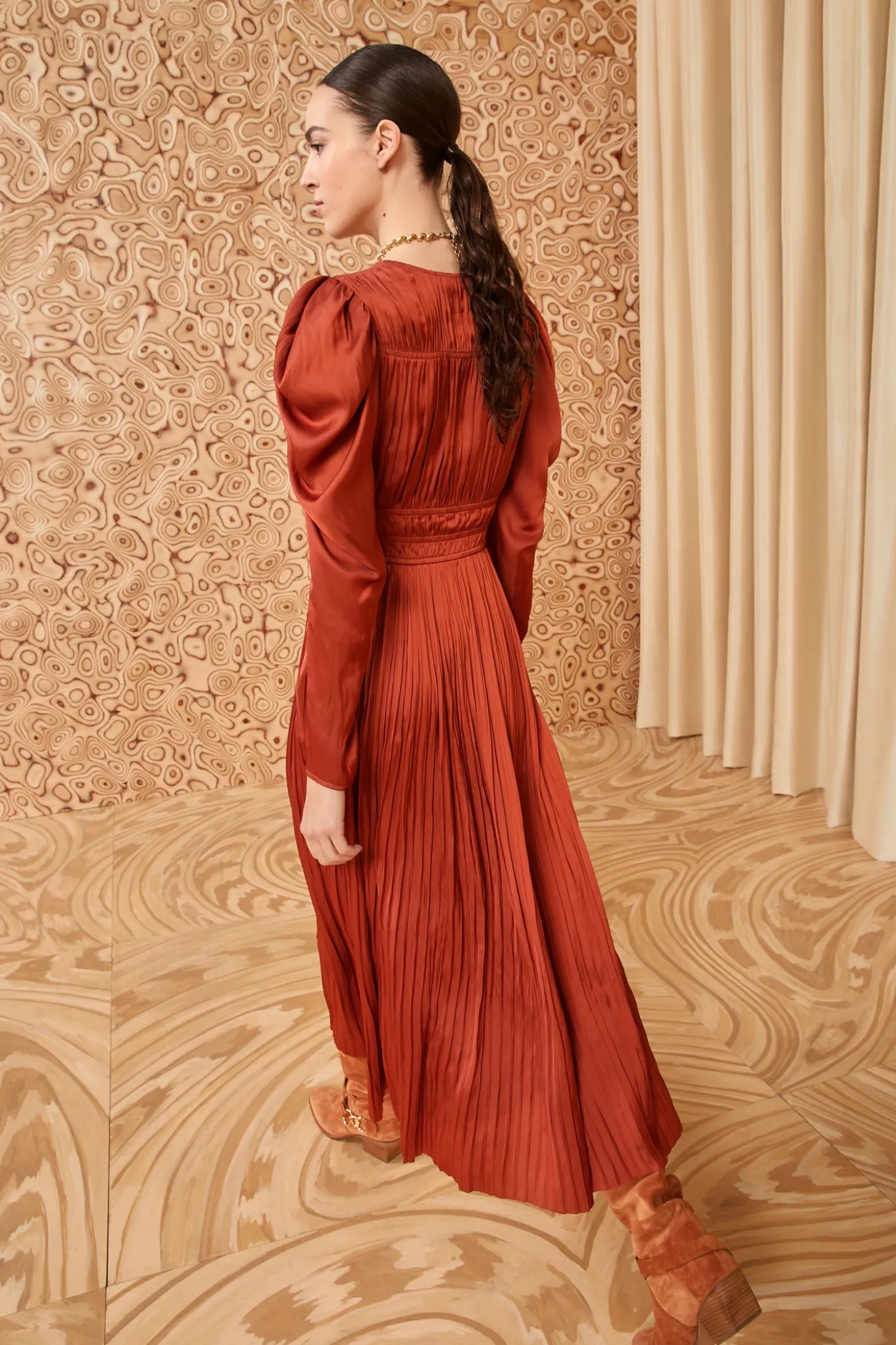 Our Lelou Dress is made from our bestselling plissé satin that feels luxurious and silky-smooth against the skin. Arriving in a rich tierra brown, this standout frock features our signature sculptural sleeves and a plunging neckline with three adjustable ties at the front. It is beautifully pleated throughout and floats to a midi length.