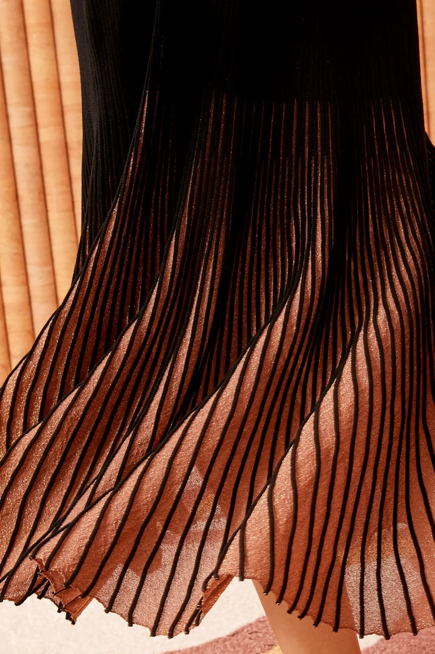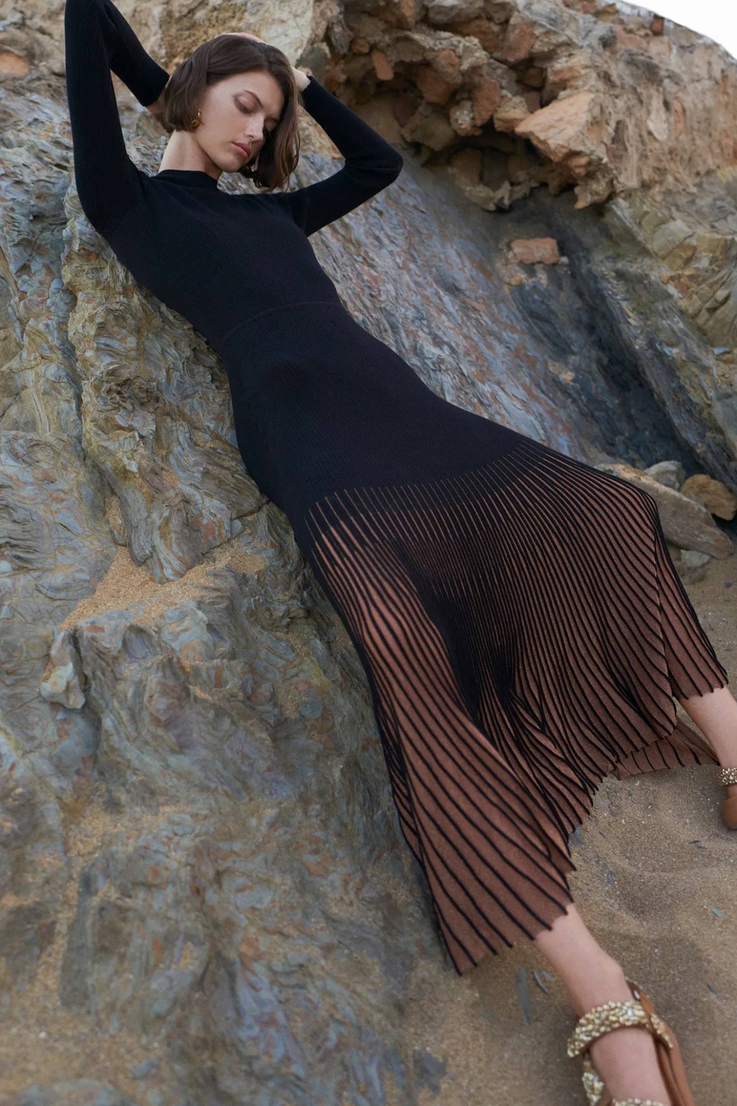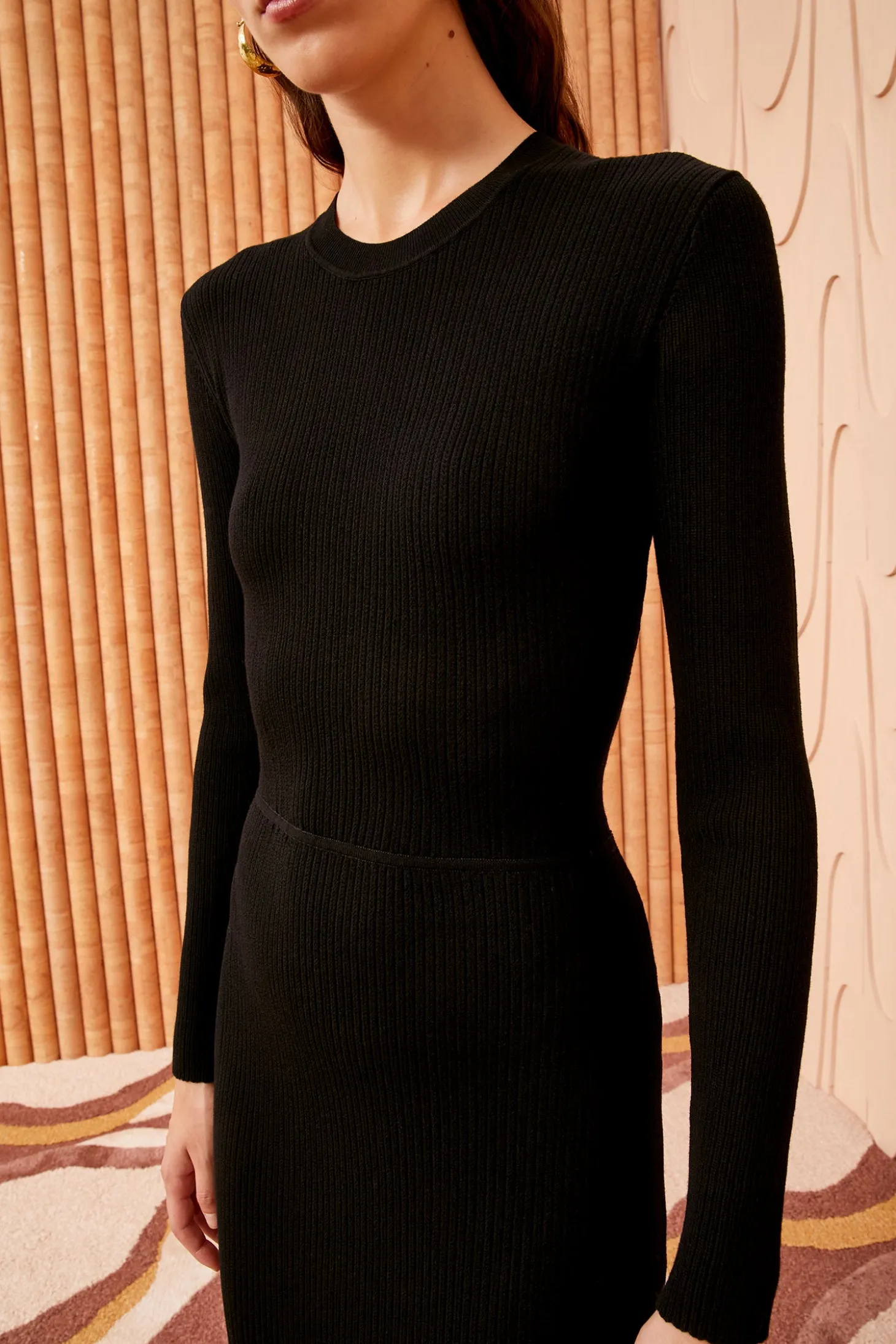 Defined by languid and elegant volumes, the Magnolia Dress is crafted from our ultrafine sunburst knit in timeless black noir. This long-sleeve dress has a round neckline and unfurls to a midi-length hem that explodes with shimmering bronze hues.