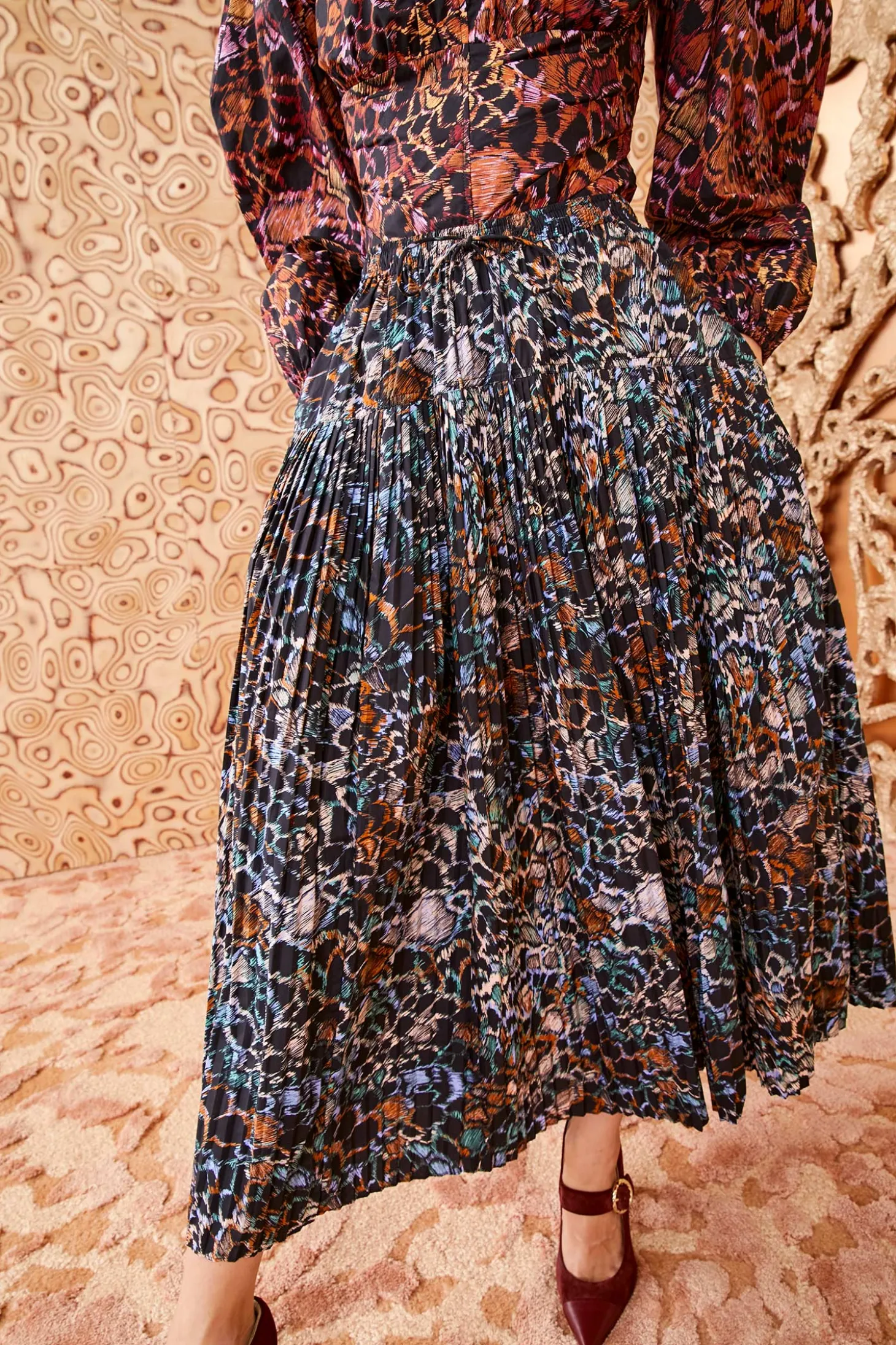 The Iledia Skirt arrives patterned with swirling feathers that come alive with orange, blue, and black hues. It sits at the waist and has an elastic drawstring, before unfurling to an artfully pleated A-line silhouette. Full of movement, this lovely sits slightly above the ankle and has convenient pockets at the side.