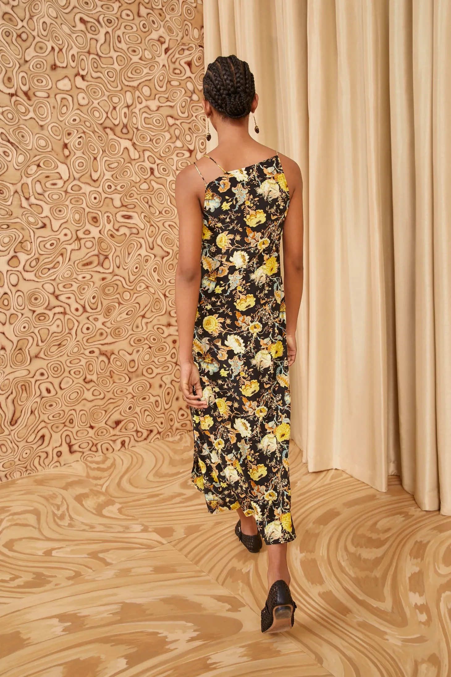 Our Isla Dress is a fluttering frock defined by a dreamy ruffle that cascades asymmetrically down the bodice. Suspended from delicate knotted straps, this sleeveless midi dress is tailored from luxurious silk crepe de chine that’s richly patterned with lively botanicals inspired by vintage French florals. This noir and yellow beauty fastens with a concealed side zipper.