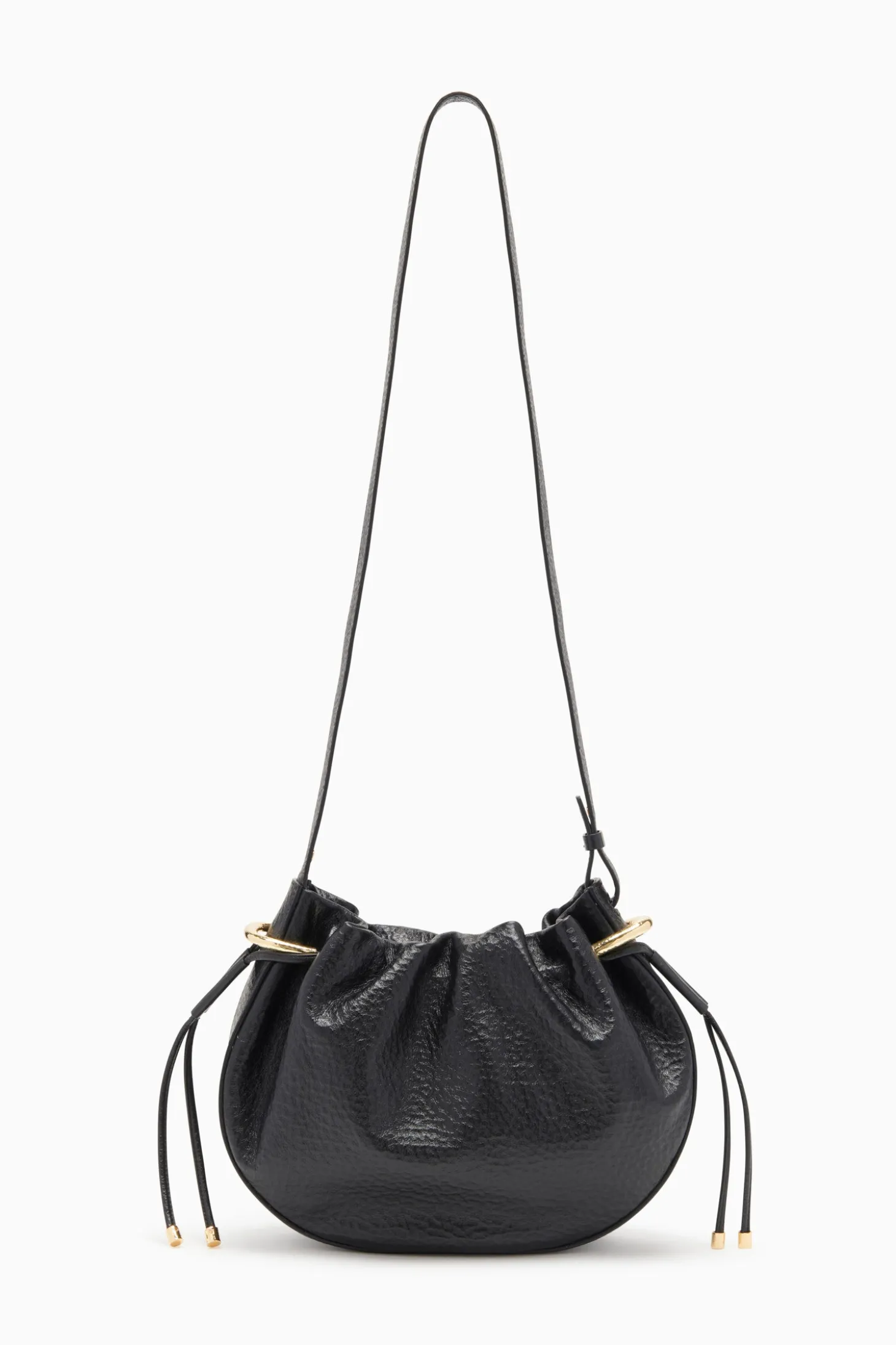 Our Tilda Ruched Crossbody is a beautifully gathered silhouette made in Italy from shiny textured leather in classic black. It has a roomy, cotton-lined interior sized for daily essentials and has an adjustable strap that can be worn crossbody or as a shorter shoulder bag. It is finished with antique brass accents and fastens with an internal magnetic closure at the top.