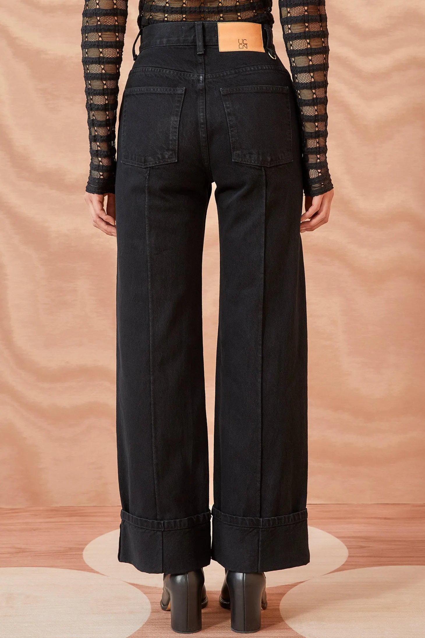 Our best-loved Genevieve Jean returns for Autumn/Winter ’23. Handmade in Los Angeles, this wide-leg silhouette features a high-waist, folded cuffs, and pintucks down the center front of each leg. This classic black jean is cut from non-stretch denim with a leather logo-embossed waistband patch and a hand-hammered ring attached to the back belt loop. Each style is designed to perfectly complement the silhouettes of every ready-to-wear collection.
