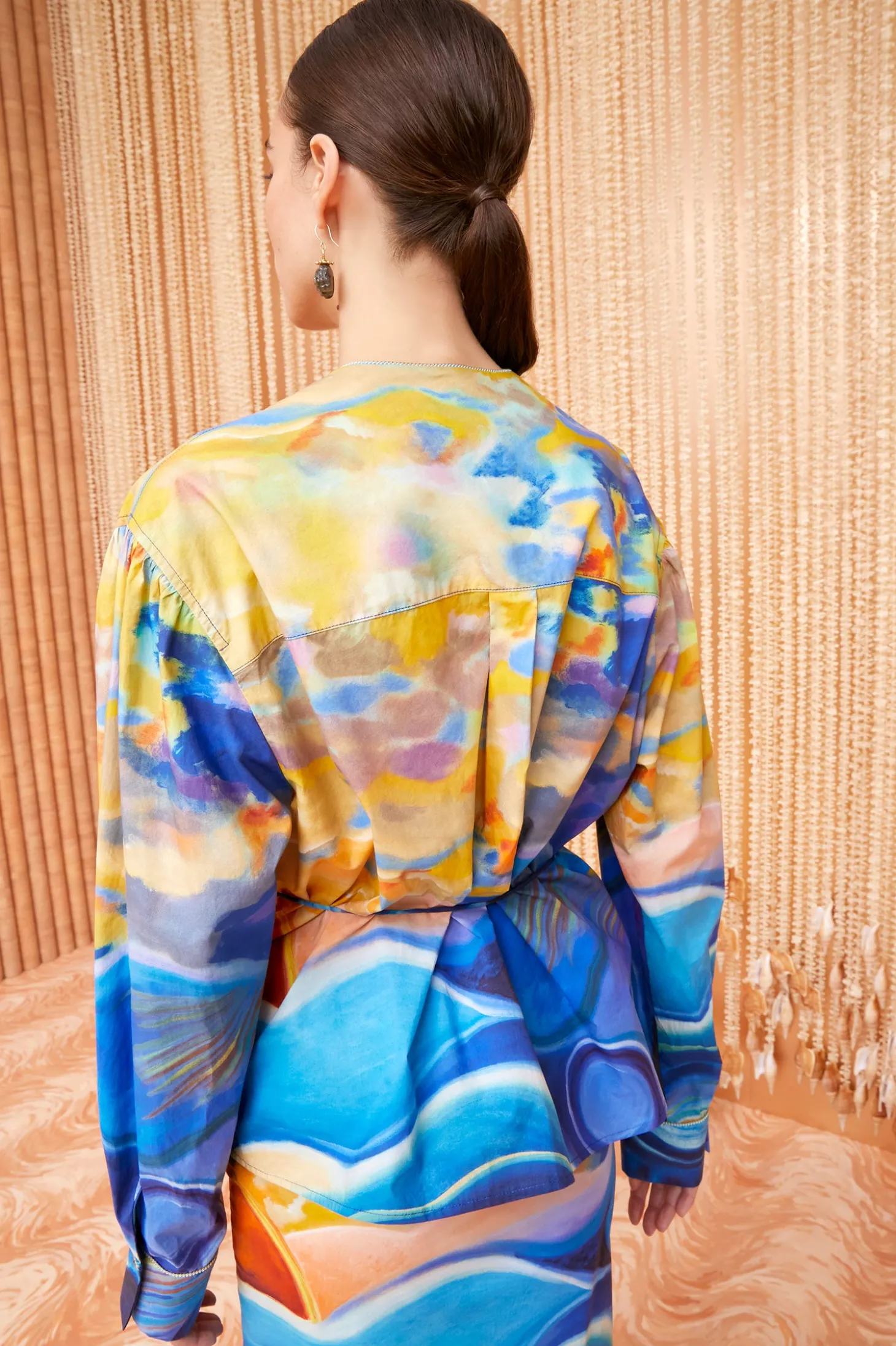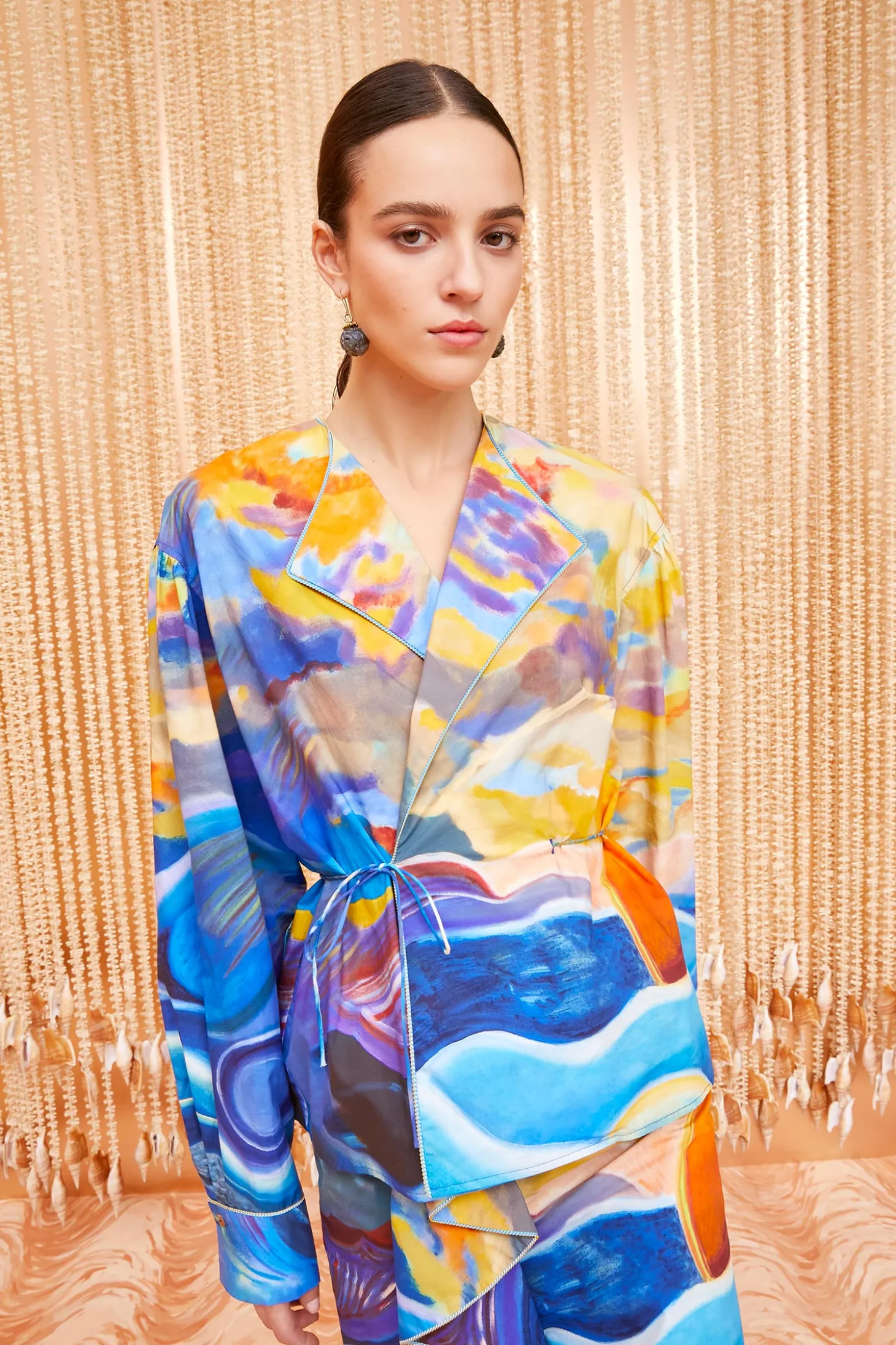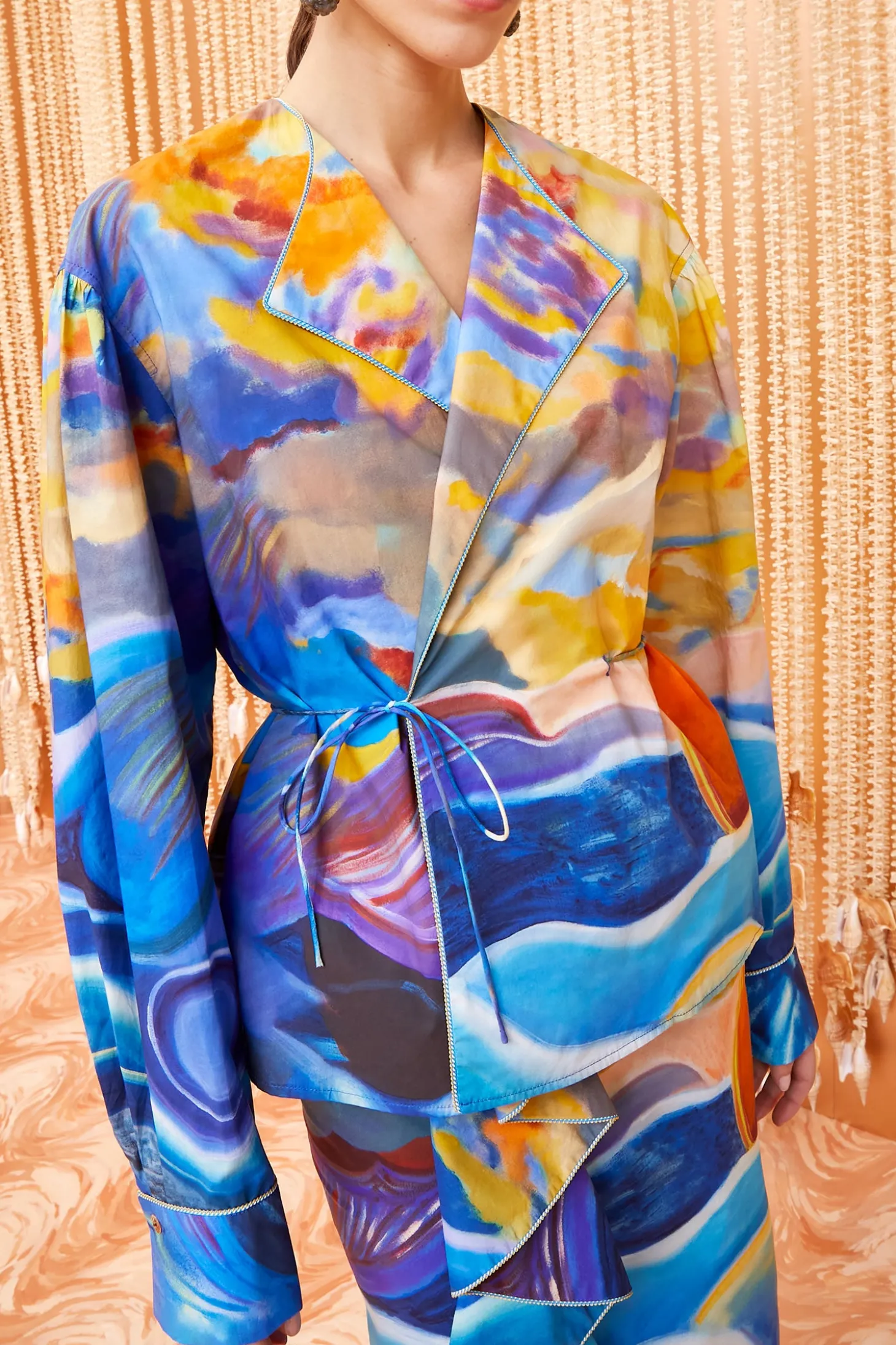 Featured in Look 4 of our Spring/Summer ‘24 Runway Show, the Holland Jacket is part of our exclusive collaboration with painter Shara Hughes, whose captivating 2021 sunset painting “Tuck” is translated across our signature cotton poplin in hypnotic blue and yellow hues. A limited-edition heirloom, this self-tie wrap silhouette is made from cotton poplin with voluminous sleeves and piped trims that delicately trace the wide lapels.