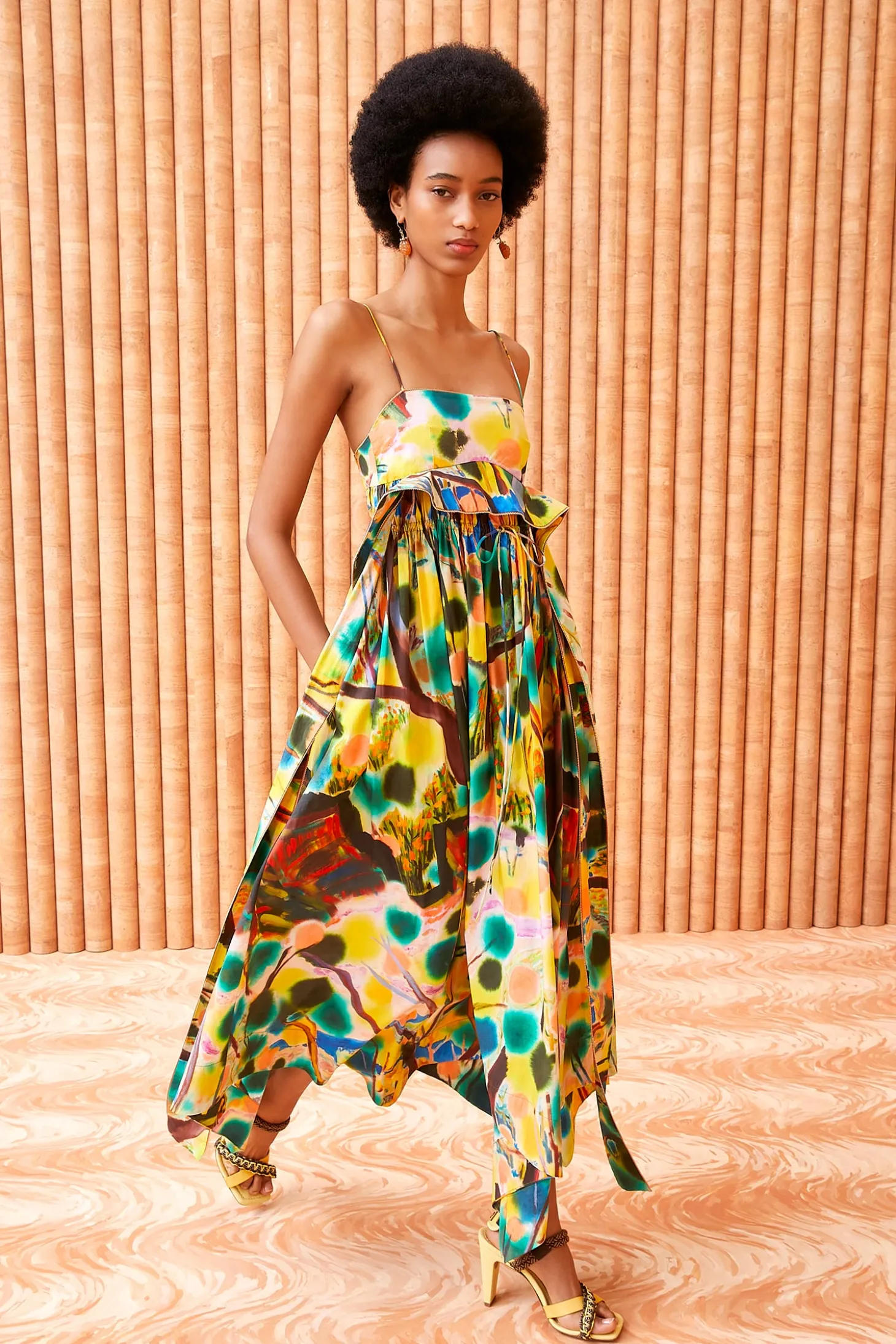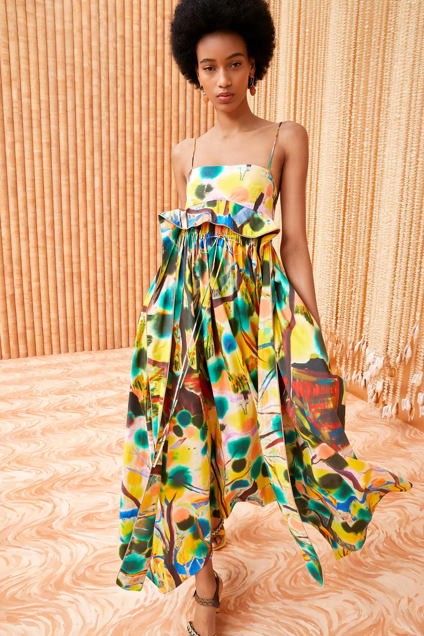 One of Ulla’s favorites and featured in Look 50 on our Spring/Summer ‘24 runway, our limited-edition Leighton Dress is part of our collaboration with renowned painter Shara Hughes, whose dreamlike 2018 painting “Ignoring the Present” is translated across the silhouette in vibrant yellow, blue, and green hues. This spaghetti strap midi dress arrives in cotton poplin with cascading ruffles and unfurls to a handkerchief hem. Fitted at the bodice, it has an adjustable drawstring waist, side slit pockets, and fastens with a concealed center-back zipper.