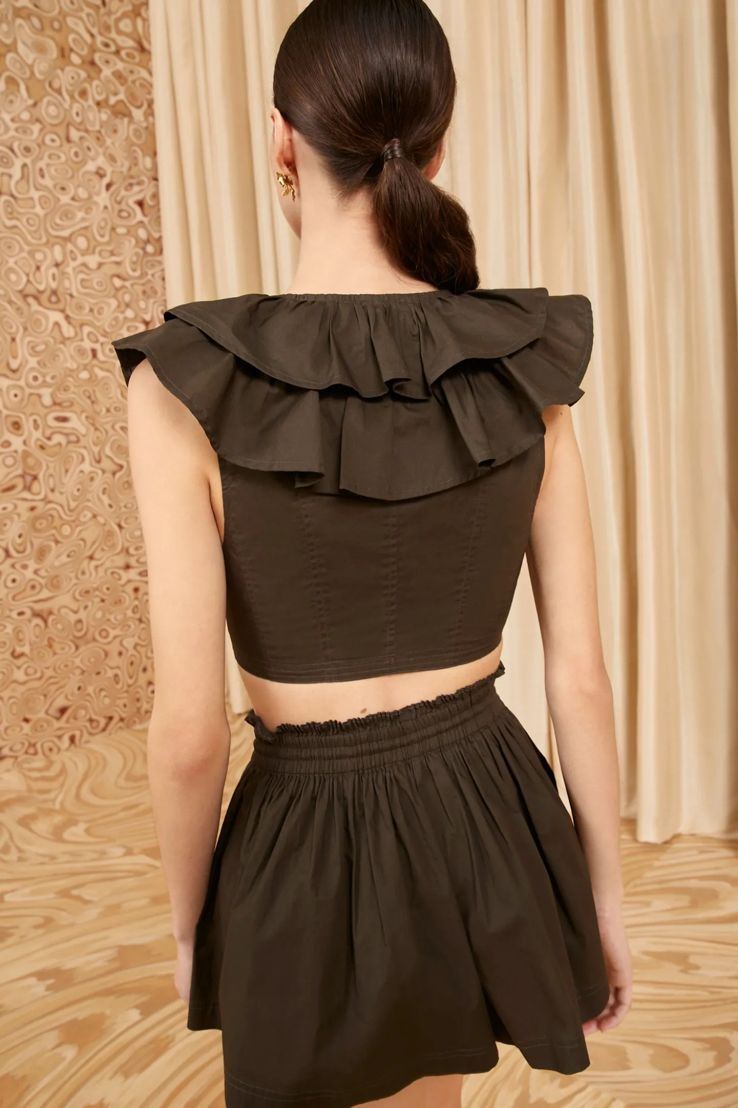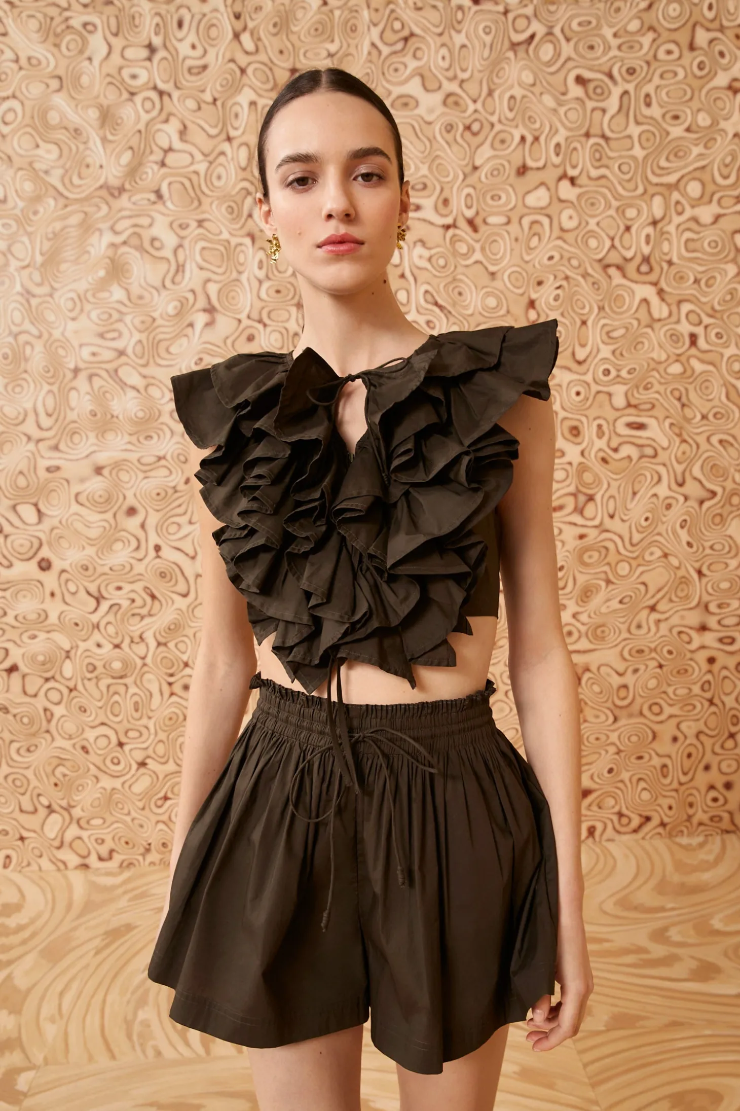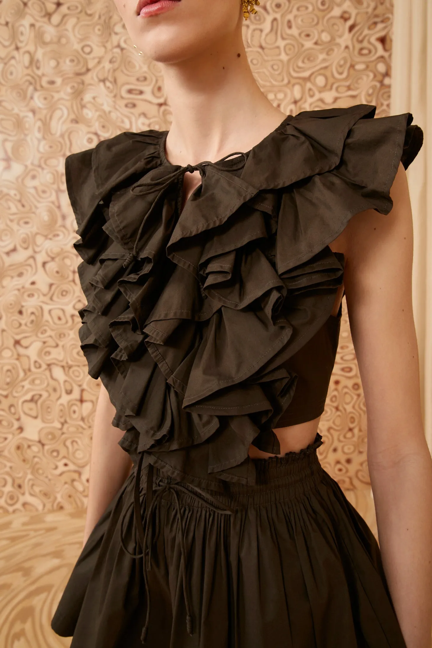 Featured in Look 29 of our Pre-Fall 2024 Lookbook, our Vidri Top is a playfully proportionate beauty made from cotton poplin with an explosion of fluttering ruffles. Arriving in the richest shade of dark green, it has a sleeveless silhouette and fastens with delicate ties at the front. Wear over the eyelet Abbott Blouse in the same color for a uniquely textured look.
