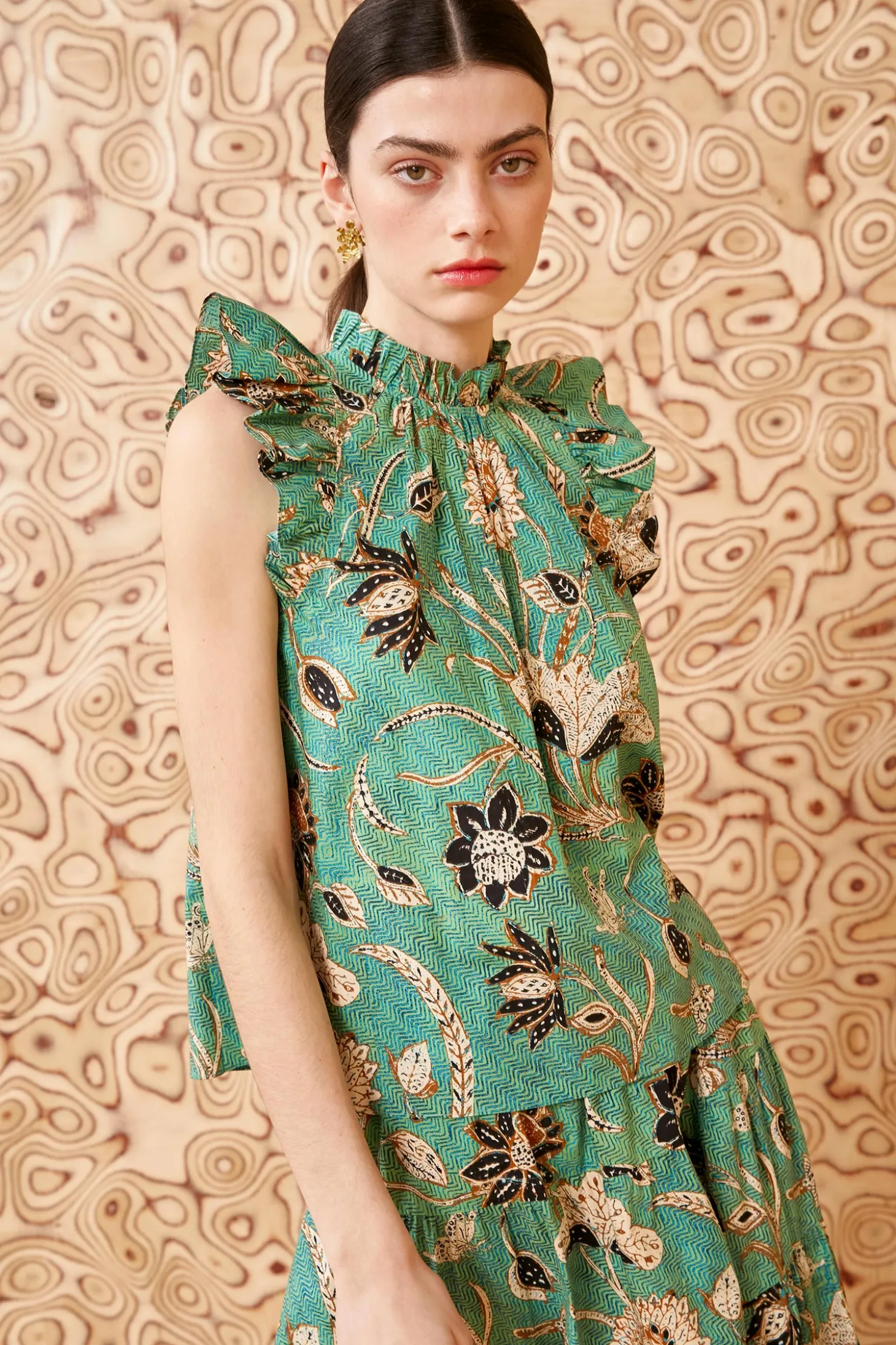Our forever-favorite Tilda Top is crafted from our signature cotton poplin with trailing botanicals layered over a green backdrop with graphic diamonds. This sleeveless style features a high, ruffled neckline and fastens with a back buttoned closure. Pair yours with our Makana Skirt for coordinated elegance.
