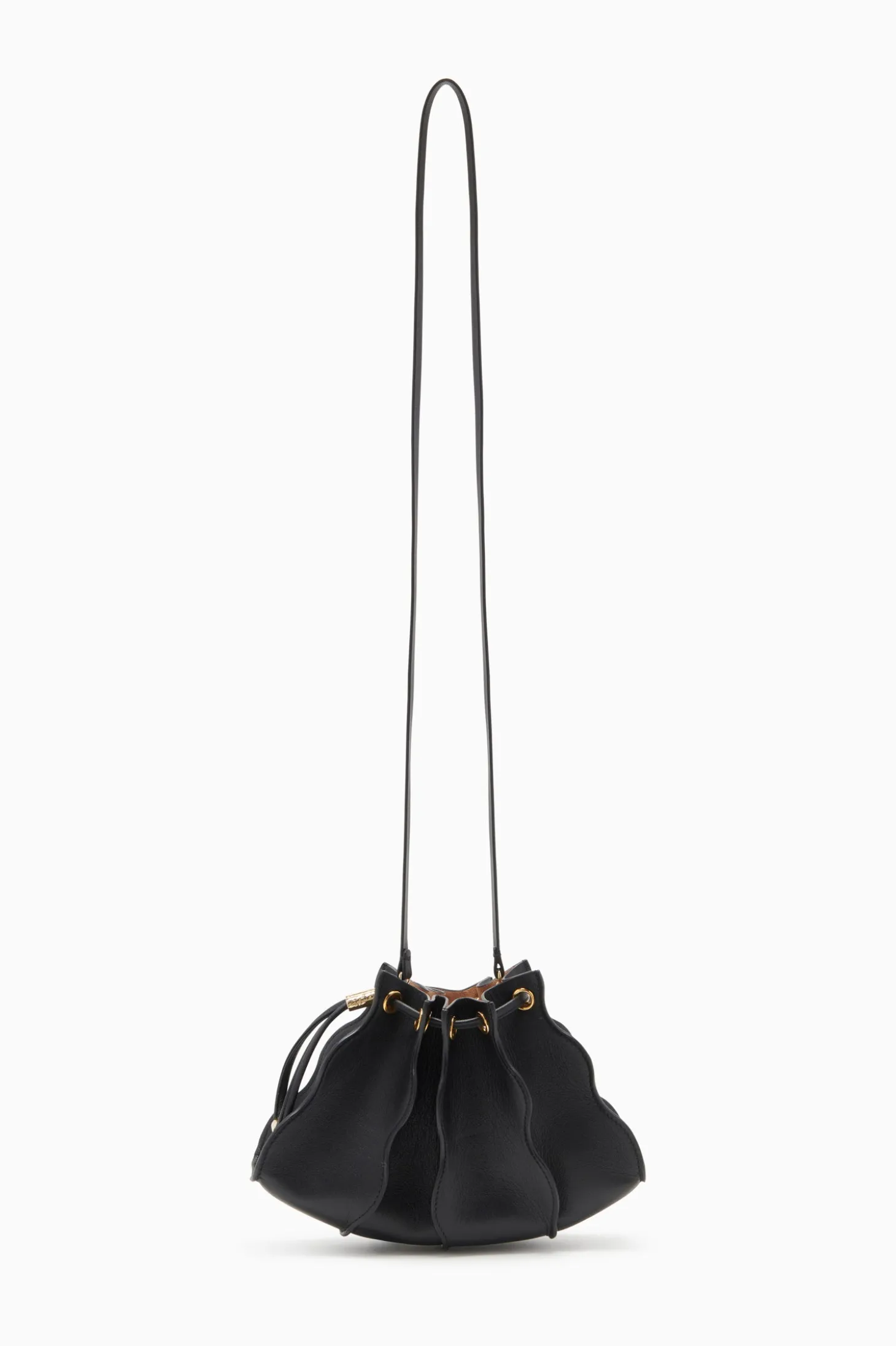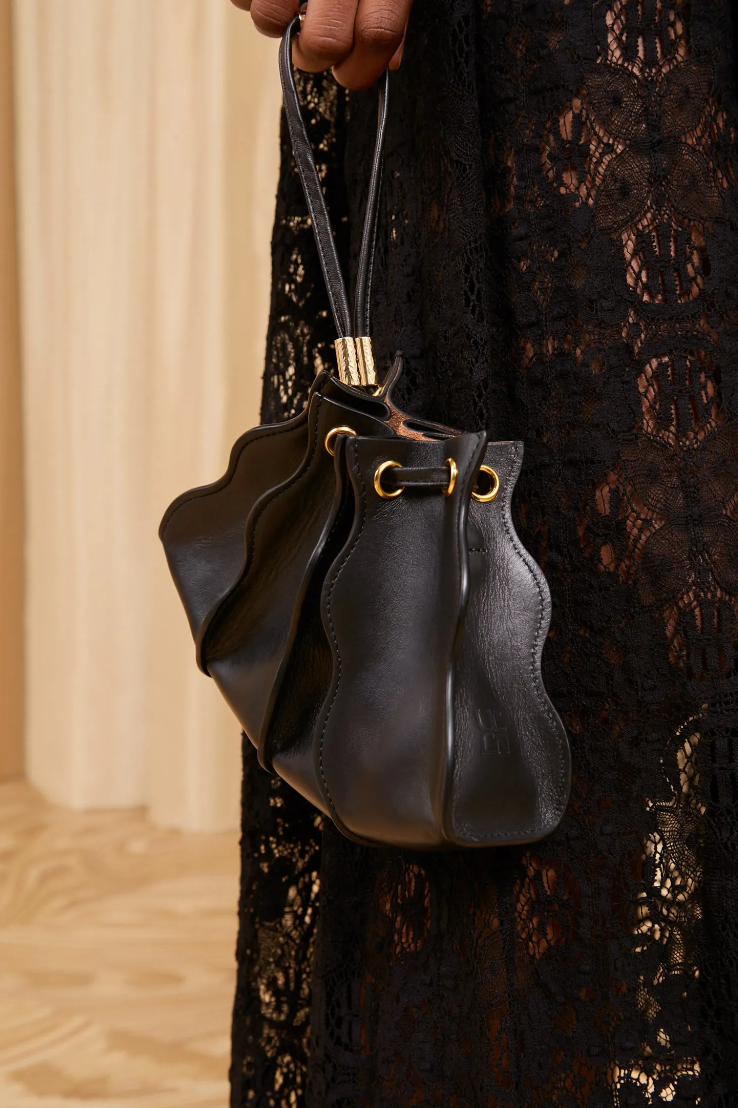The Adria Wristlet is sculpted in Italy from strips of leather that are sewn together and finished with painted edges, emphasizing the beauty of the undulating waves. This wear-everywhere black wristlet features a drawstring opening, a removable shoulder strap, and is finished with lustrous antique brass accents.