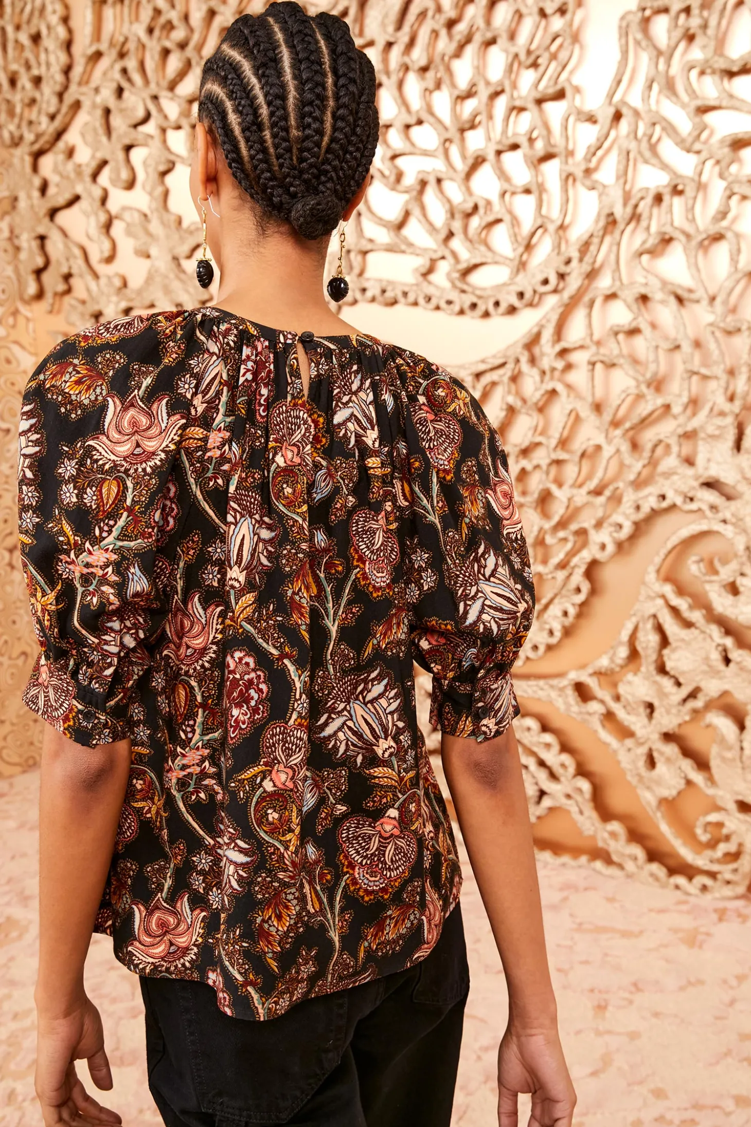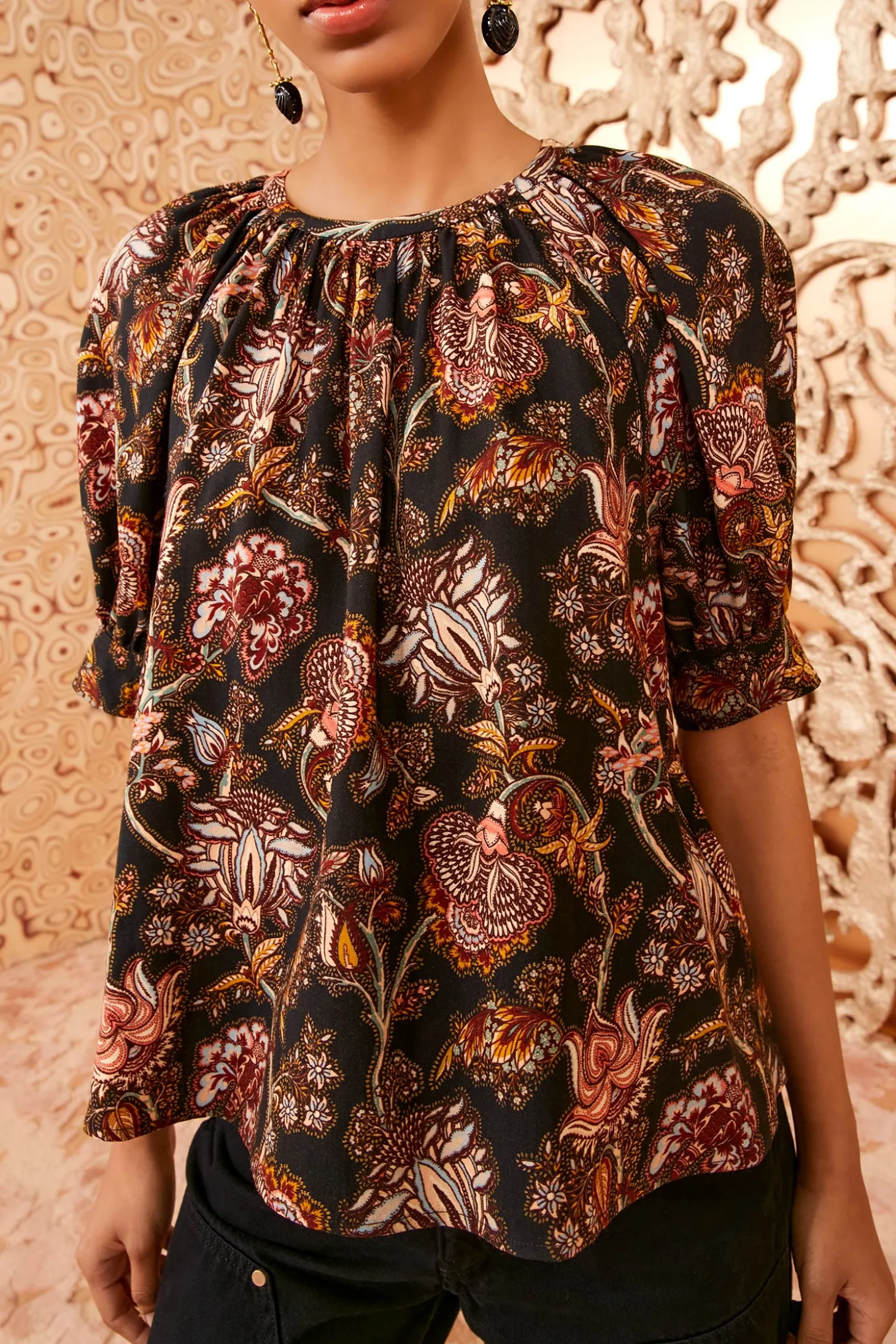 The Suri Top is awash in our seasonal paisley print, inspired by hand-painted motifs that are uniquely swirled and layered into unexpected dimensions. Tailored from wool twill with vivid hues against a black backdrop, it has a loose silhouette that’s lightly gathered and has short voluminous sleeves. Pair this beauty with our Valencia Pant for maximum impact.