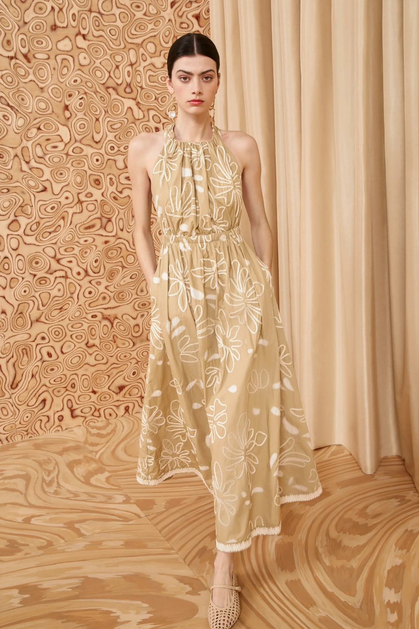 Crafted from signature cotton poplin, our Viola Dress is richly embroidered with graphic florals that beautifully pop against the delicate khaki hue. This sleeveless dress is gathered at the neck and waist, reveals a cutout back with straps that elegantly twist, and has an elongated midi hemline also adorned with contrast ribbon embroidery. It has side pockets and fastens with a concealed side zipper.
