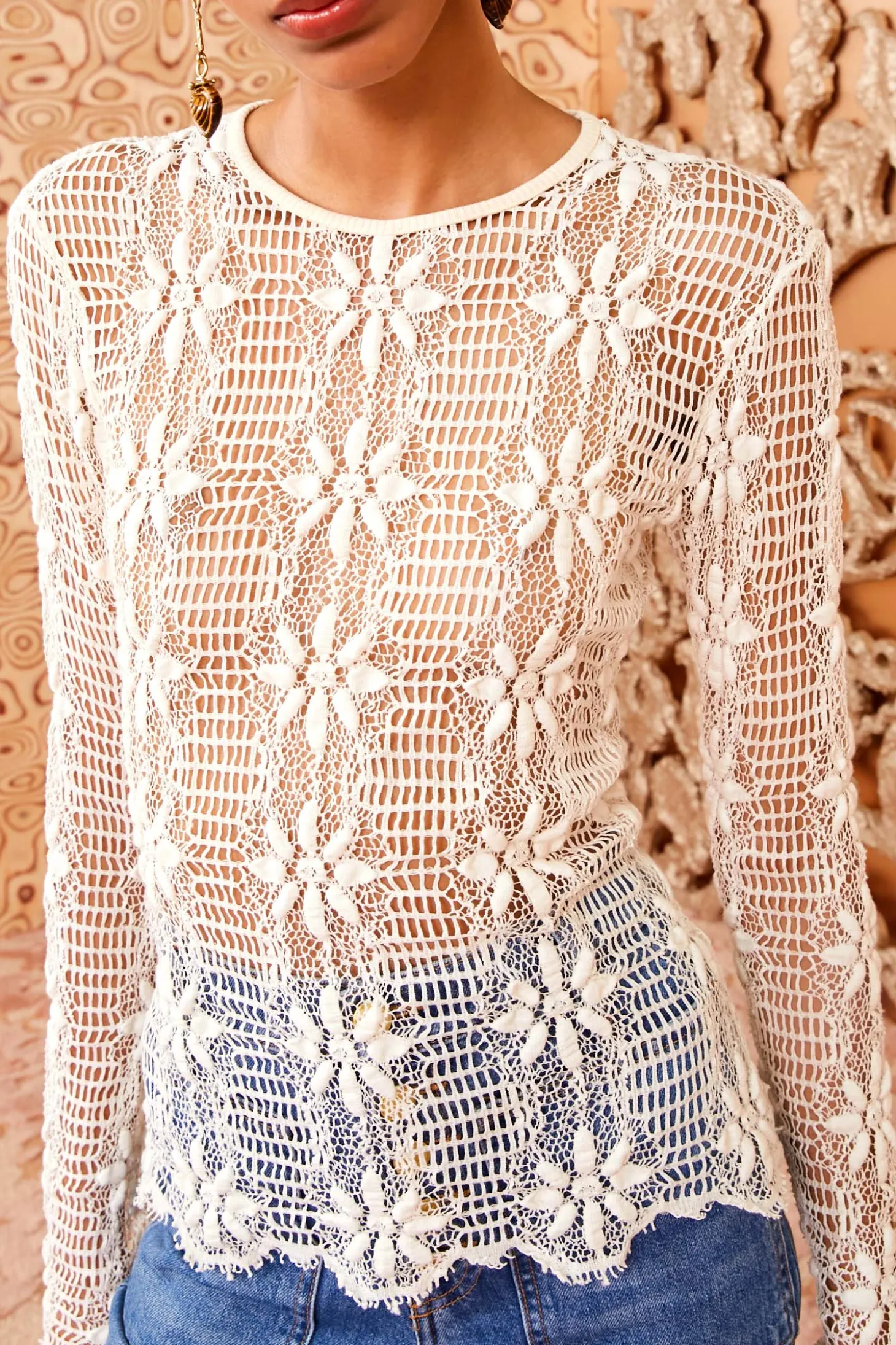 Our Cyrus Top is a richly textural lovely made from stretch Italian cotton lace with linear graphic florals. Ideal for layering or wearing on its own, this pristine white long-sleeve style has a round neckline and a sleek, fitted silhouette. It is unlined and is fully sheer.