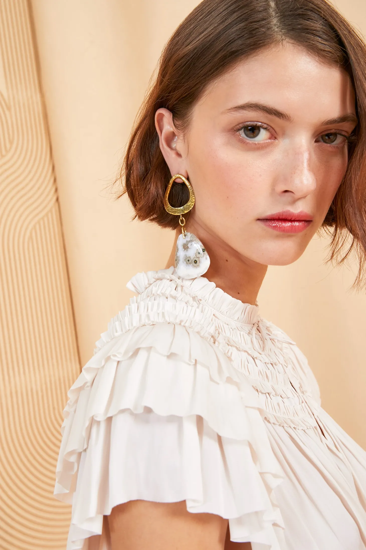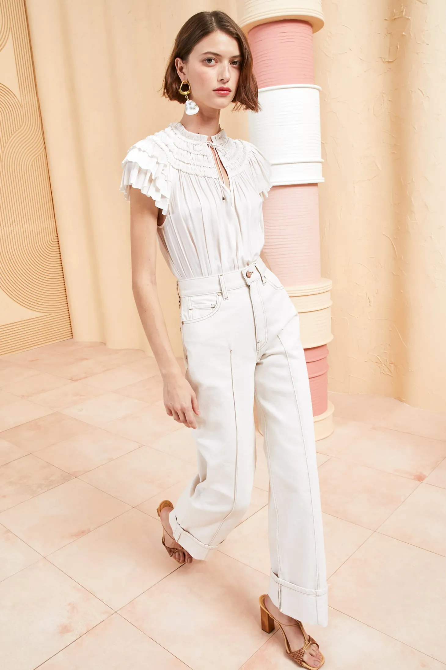 The Eva Top is a simple blouse, richly adorned with romantic details. Mini ruffles frame the neckline, paired with layered flutter sleeves and a loose fitting bodice.