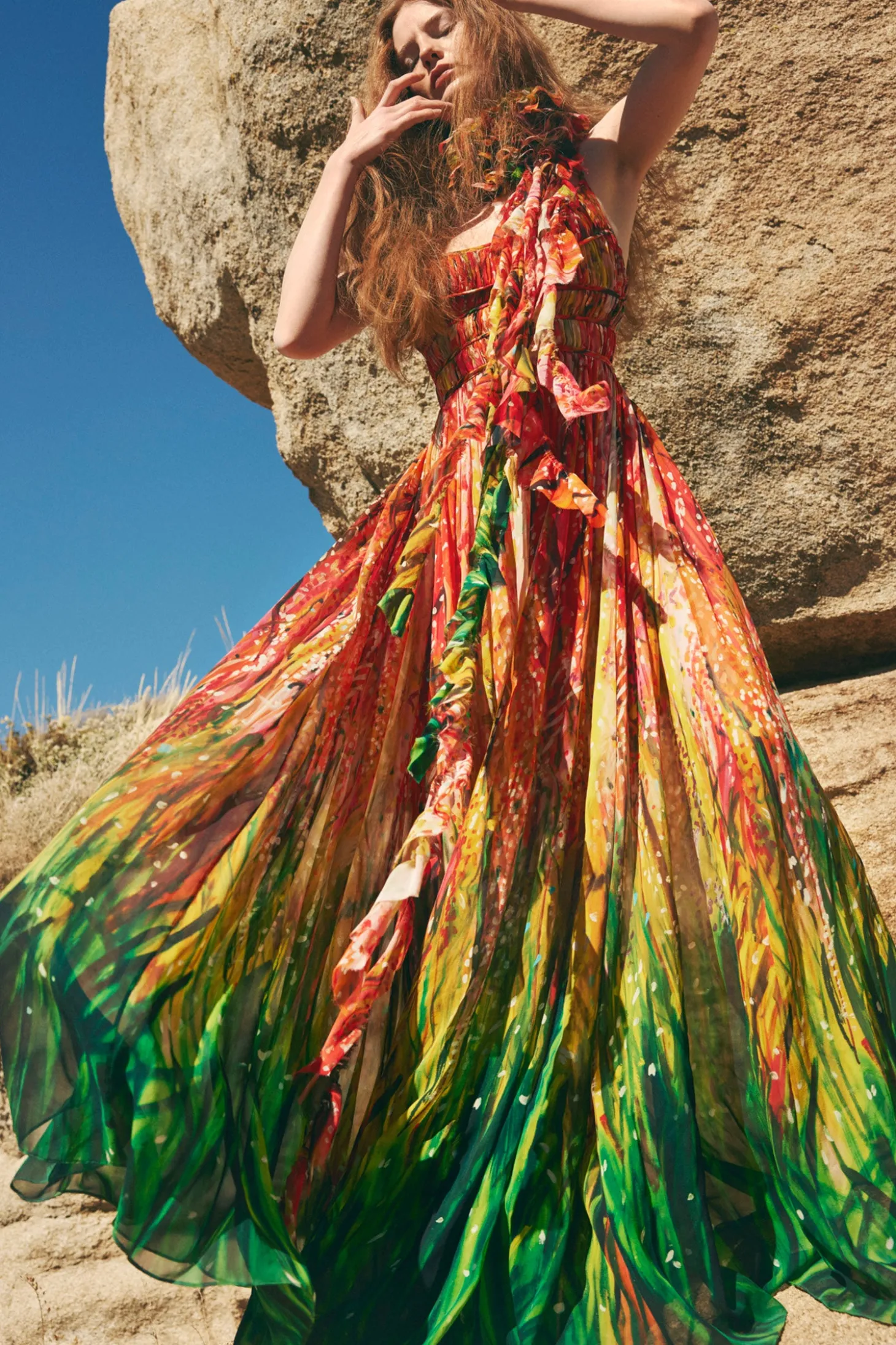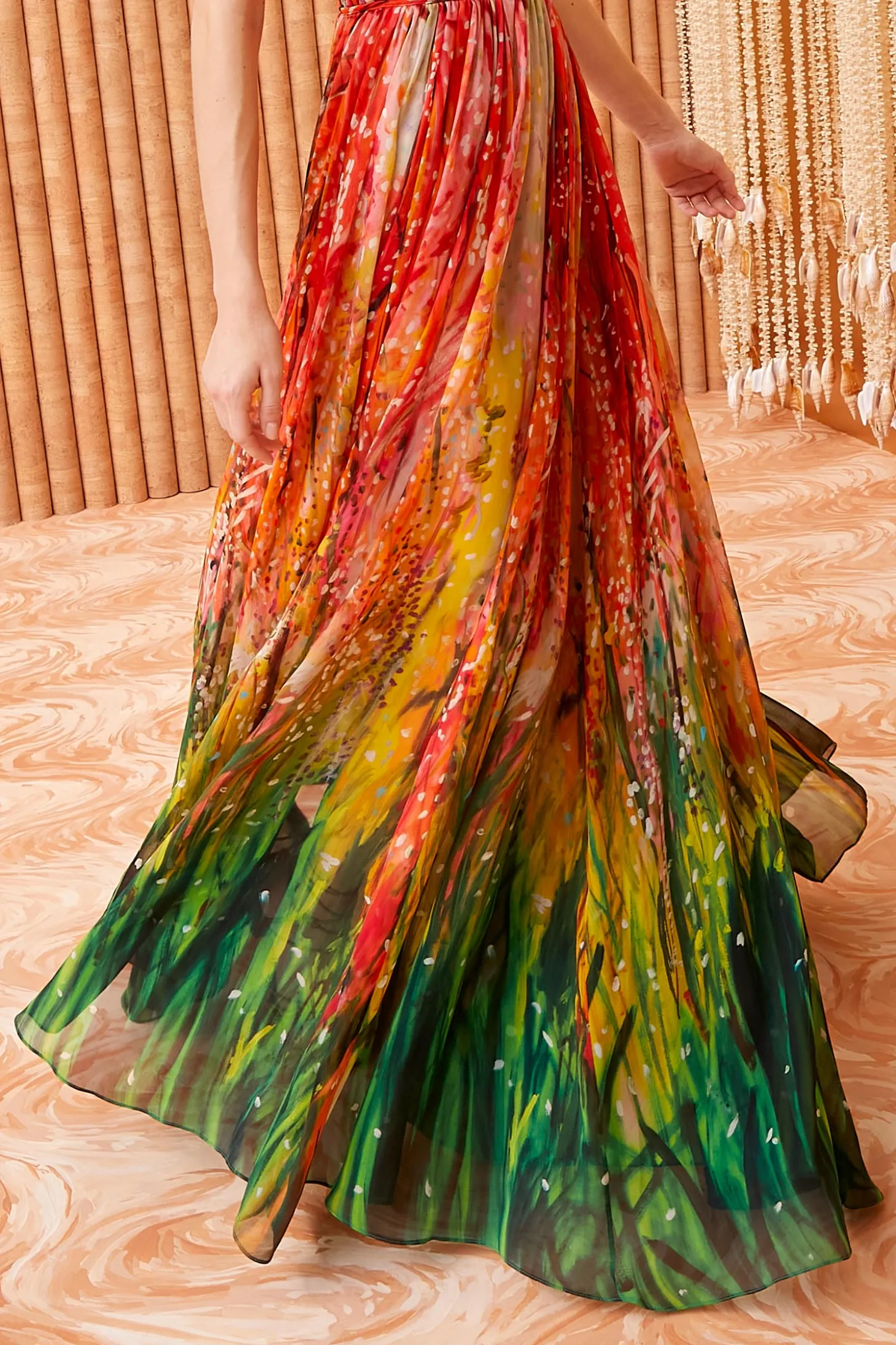 Featured in Look 18 of our Spring/Summer ‘24 Runway Show, the Rosie Gown is a stunning future heirloom part of our exclusive collaboration with celebrated painter Shara Hughes, whose otherworldly 2022 landscape “Cherry in Lace” is translated across ethereal silk georgette in red, green, and yellow hues. This limited-edition dress is suspended from pin-thin braided straps that crossover at the back, has a gathered bodice with piped seams, and unfurls to a floor-length hem. It fastens with a center-back zipper.