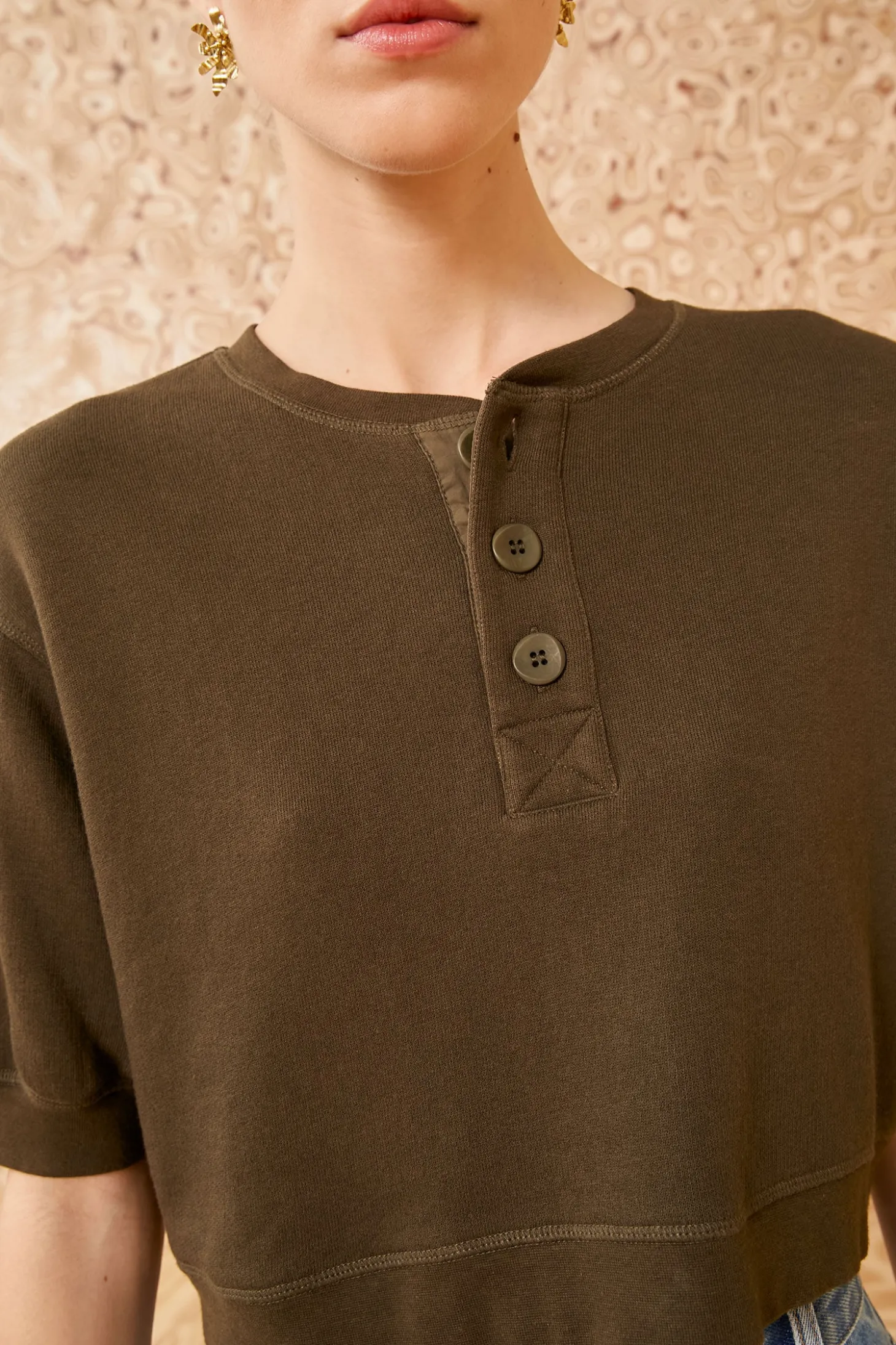 Effortless and richly hued, our militaire green Blake Top arrives in bamboo and organic cotton fleece, part of our continued efforts to support responsible production methods. This short-sleeve style features a buttoned placket lined with poplin and has a relaxed silhouette that styles effortlessly with our handcrafted denim.