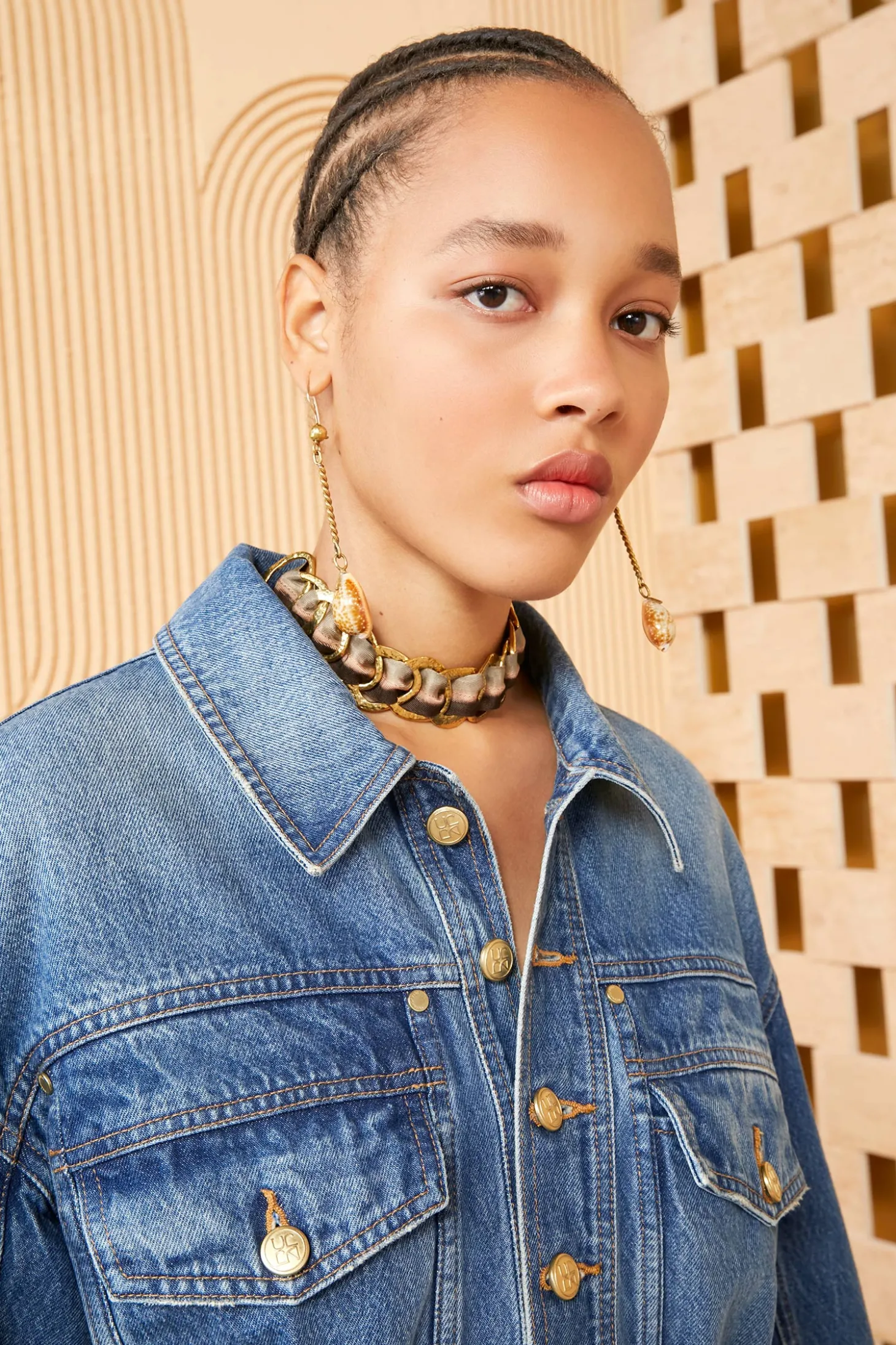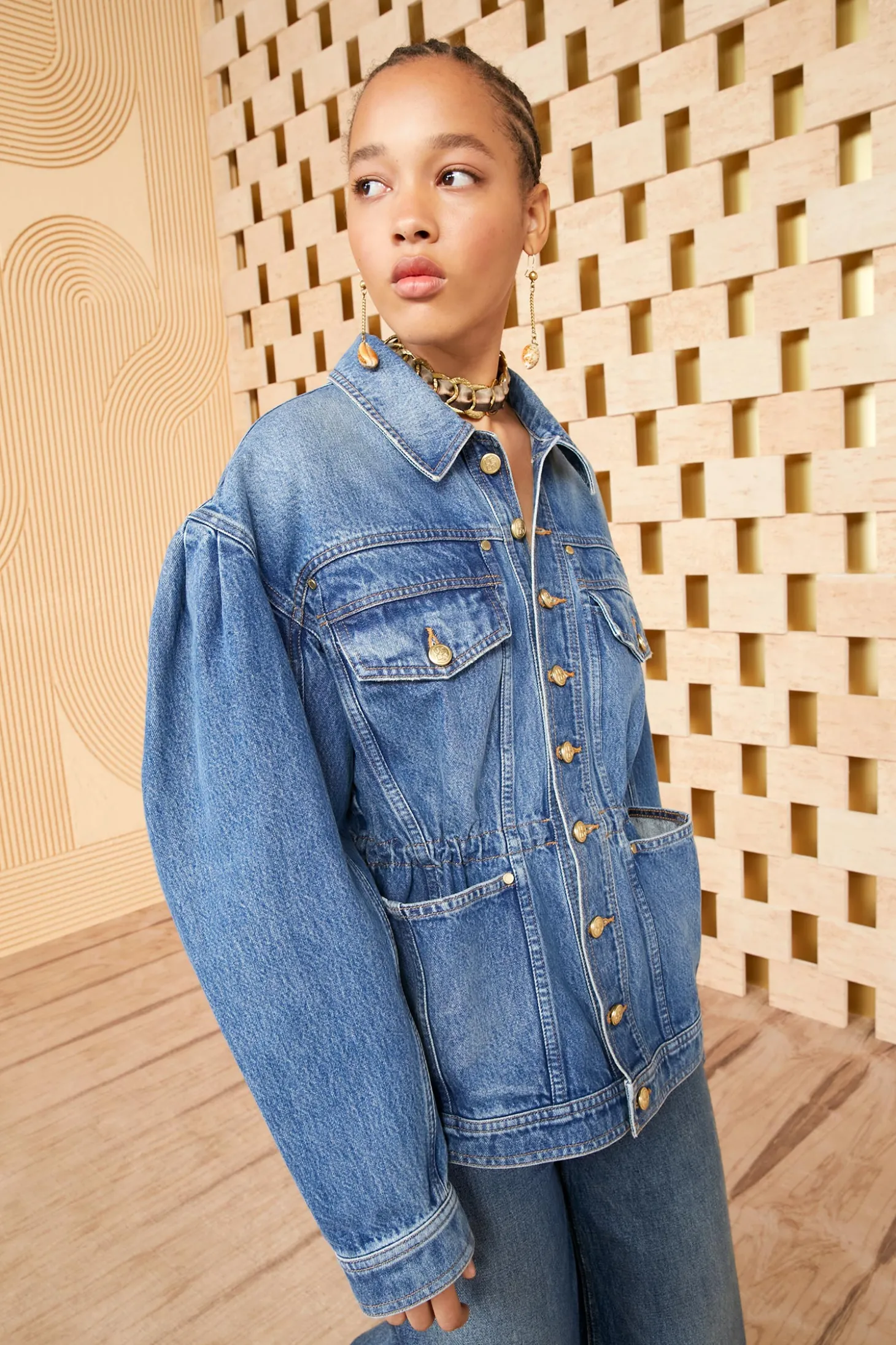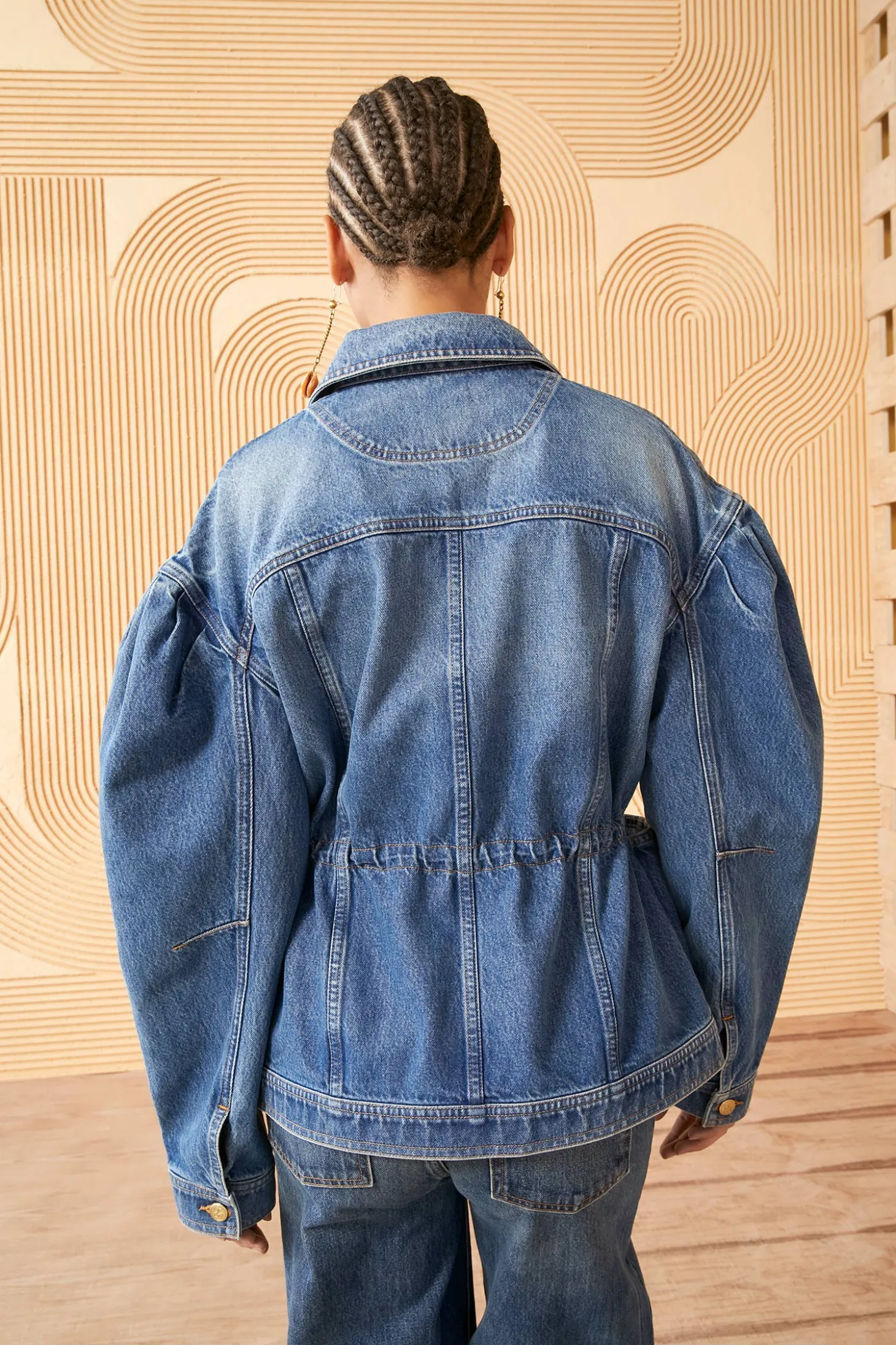 As featured in Look 20 of our Pre-Spring Lookbook, the Odette Jacket is made from our signature rigid, non-stretch denim that has been imported from Europe and hand-crafted in the USA. This jacket features dropped shoulders, a nipped drawstring waist, and antique brass detailing.