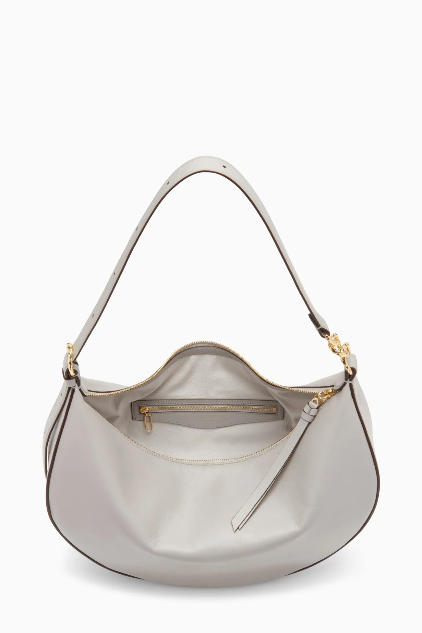 Our iconic Twyla silhouette makes its debut on our Autumn/Winter ‘24 runway. Expertly crafted in Italy from supple calfskin leather, this Dove gray beauty features a slouchy, moon shape that can be worn over the shoulder or as an elegant crossbody. It is finished with our new signature twisted buckle in lustrous antique brass.