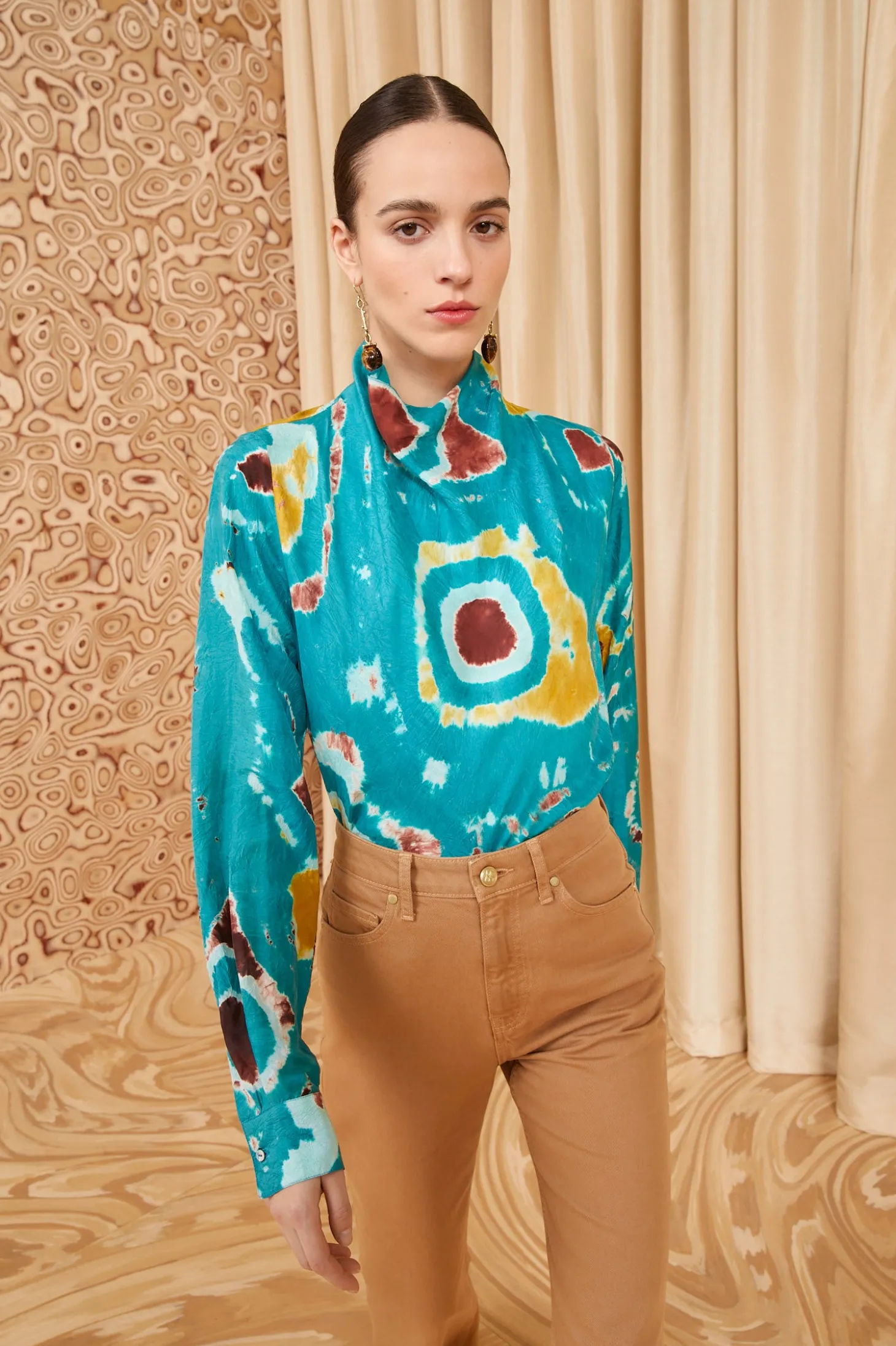 Our Albia Blouse is expertly hand-dyed by a women’s cooperative in Bangalore on a rehabilitated coconut nursery dedicated to consciously crafted textiles. These female artisans masterfully hand-tie and dye lightweight silk shibori, creating this one-of-a-kind melding of jewel tones with blue, yellow, and red. This long-sleeve style has a soft cowl neckline and a simple straight silhouette that pairs effortlessly with our premium denim. Each piece is beautifully unique due to the special hand-dyed nature of the garment.