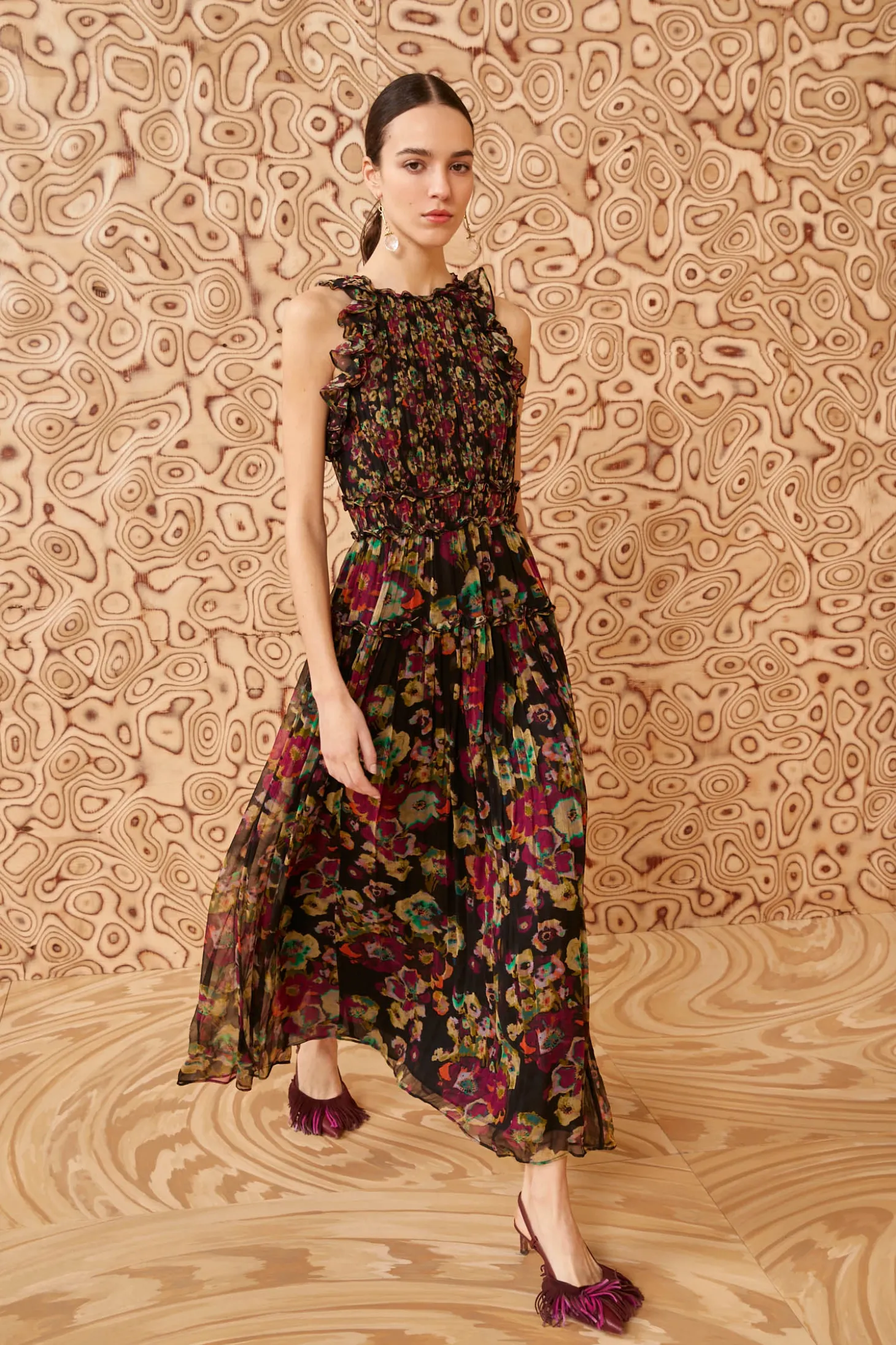 Our Elea Dress is enriched with electric, watercolor florals in a gorgeous combination of purple, orange, and green. Crafted from luxurious crinkle silk chiffon, this sleeveless style has a round neckline and is ornamented with dancing, frayed-edge ruffles that add texture. It floats to a midi-length hemline, is fully lined, and fastens with a concealed back zipper.