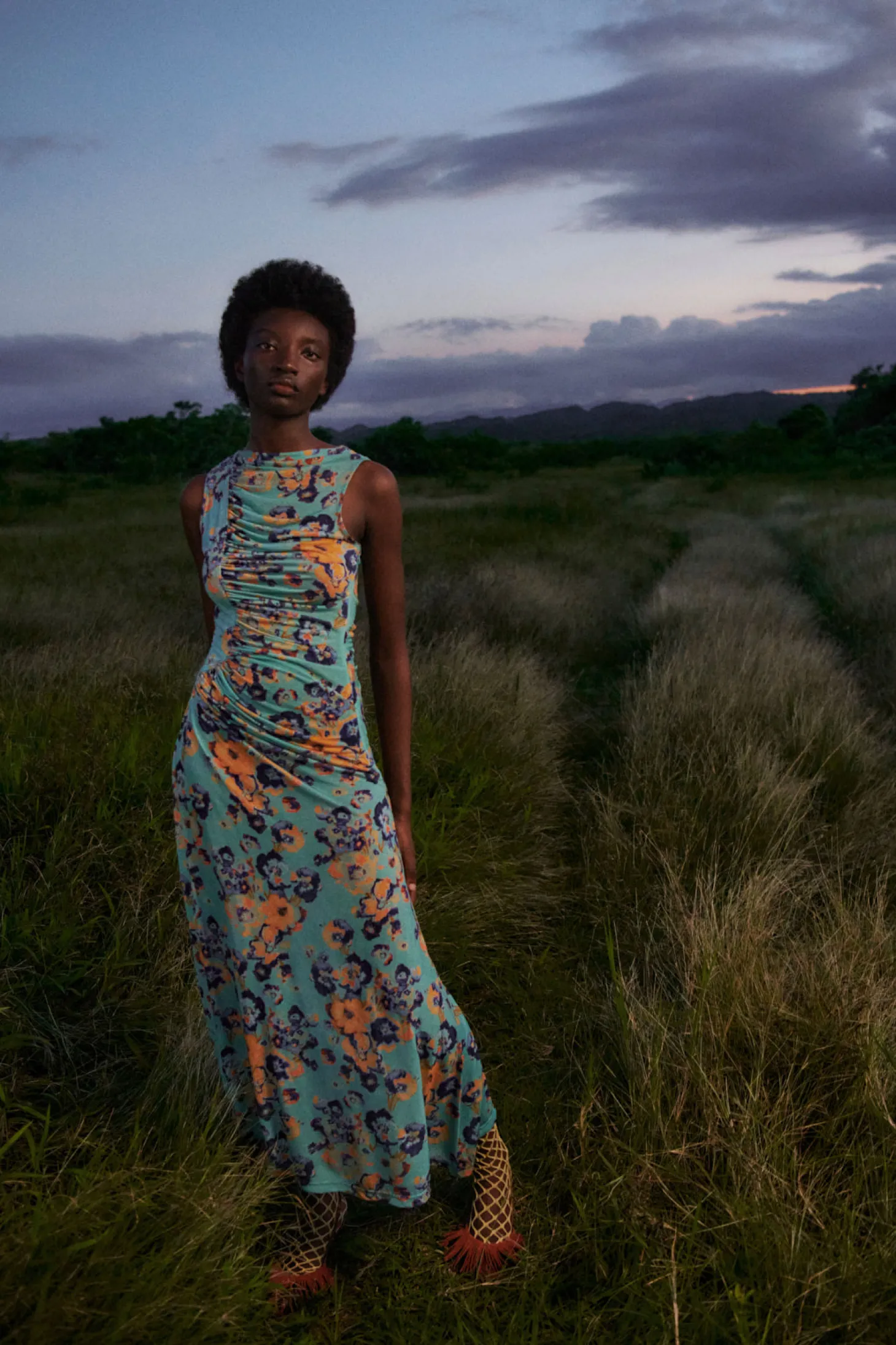 The Livia Dress is the newest addition to our beloved Tissue Weight Jersey fabrication. This high-neck midi silhouette is gathered throughout for a body-skimming shape. This stunning lovely is printed in a light blue print with vibrant orange and dark blue florals.