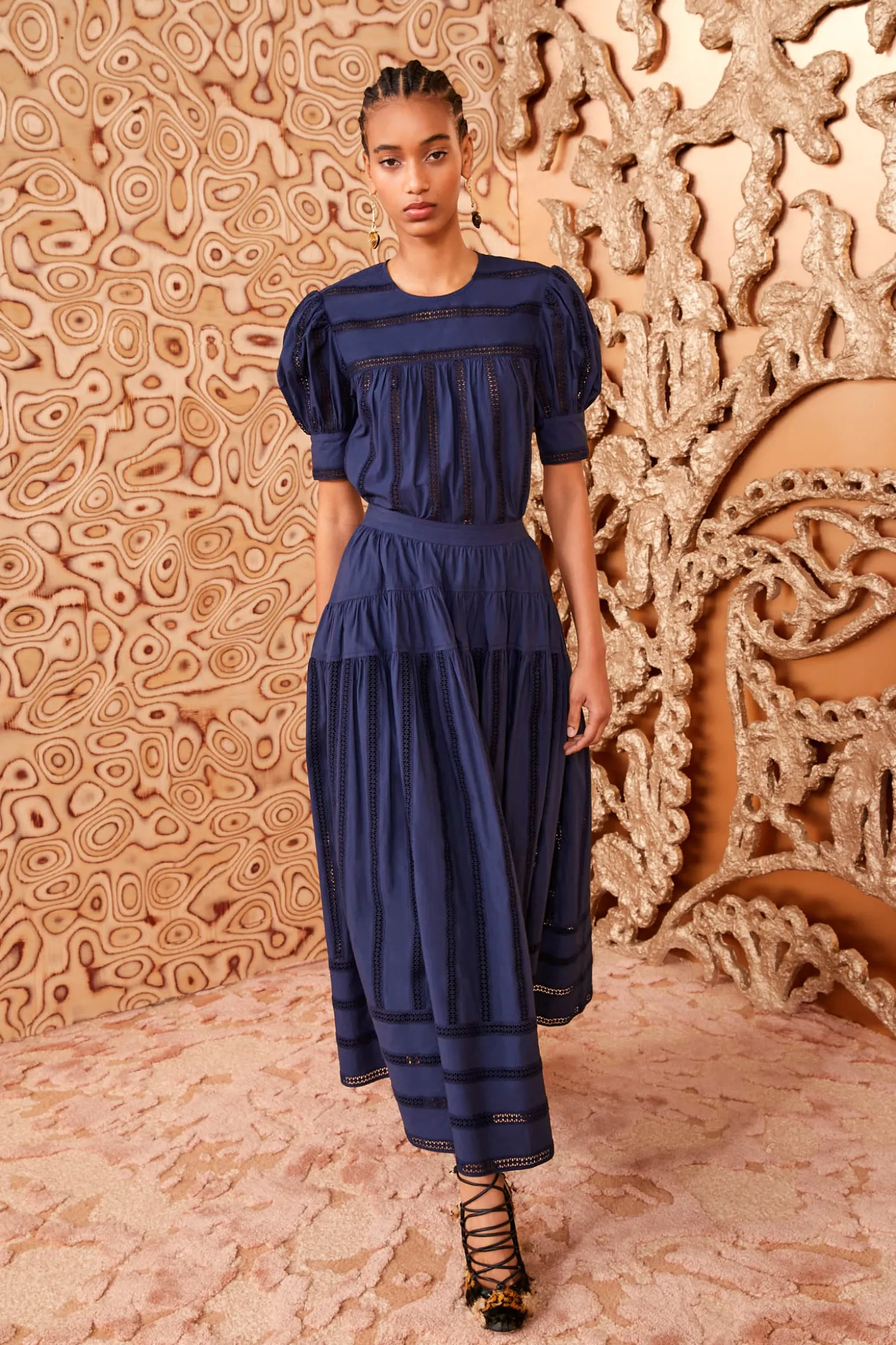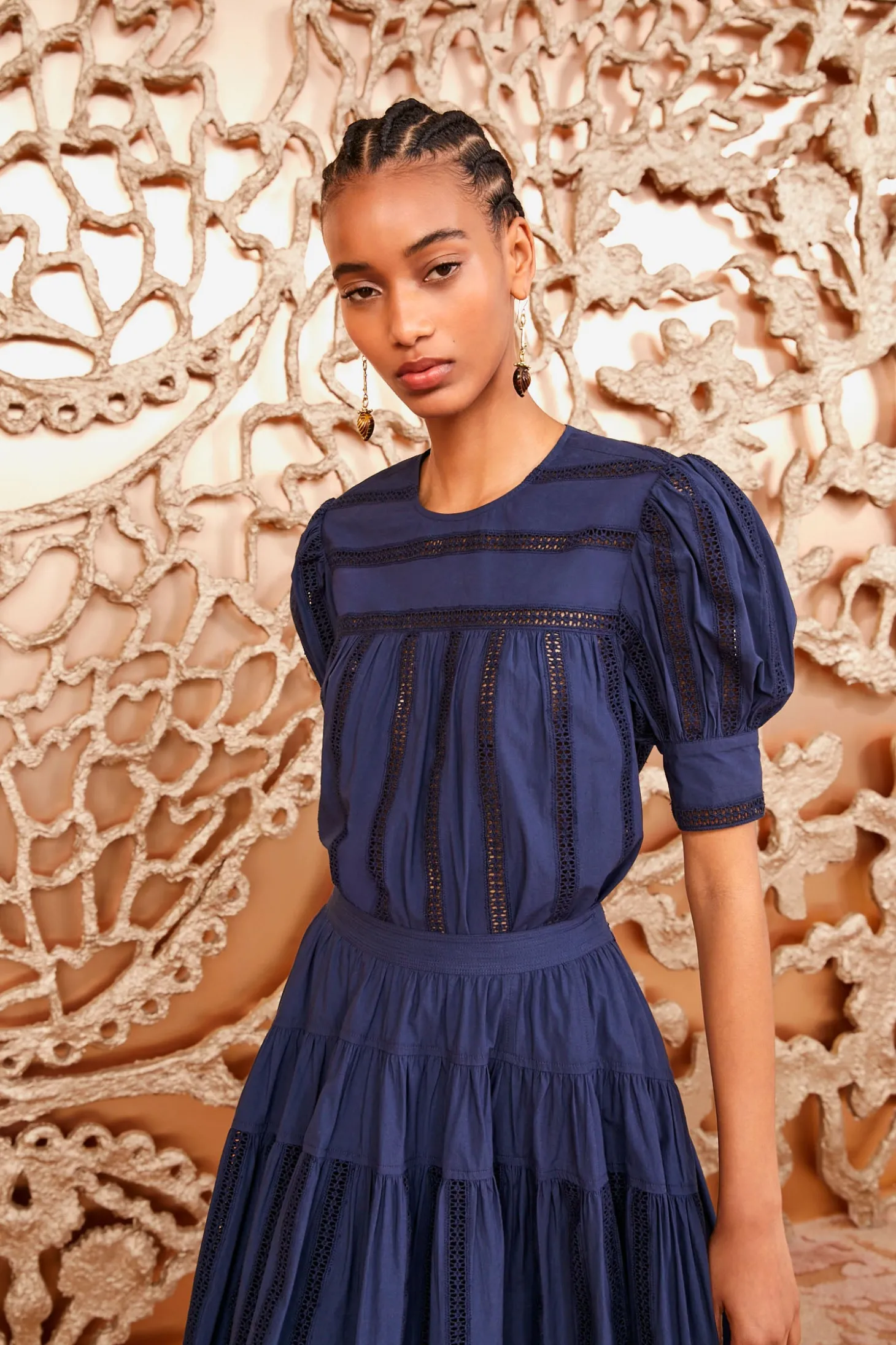 The Nara Top features our signature water-washed poplin that’s reimagined with beautifully striped geometric eyelets. This classic midnight-blue lovely has a round neckline framed by gently puffed sleeves that fasten with buttons at the cuffs. It easily tucks into our coordinating Alara Skirt, or can be worn untucked thanks to the flowy silhouette. It fastens with a buttoned keyhole at the back.
