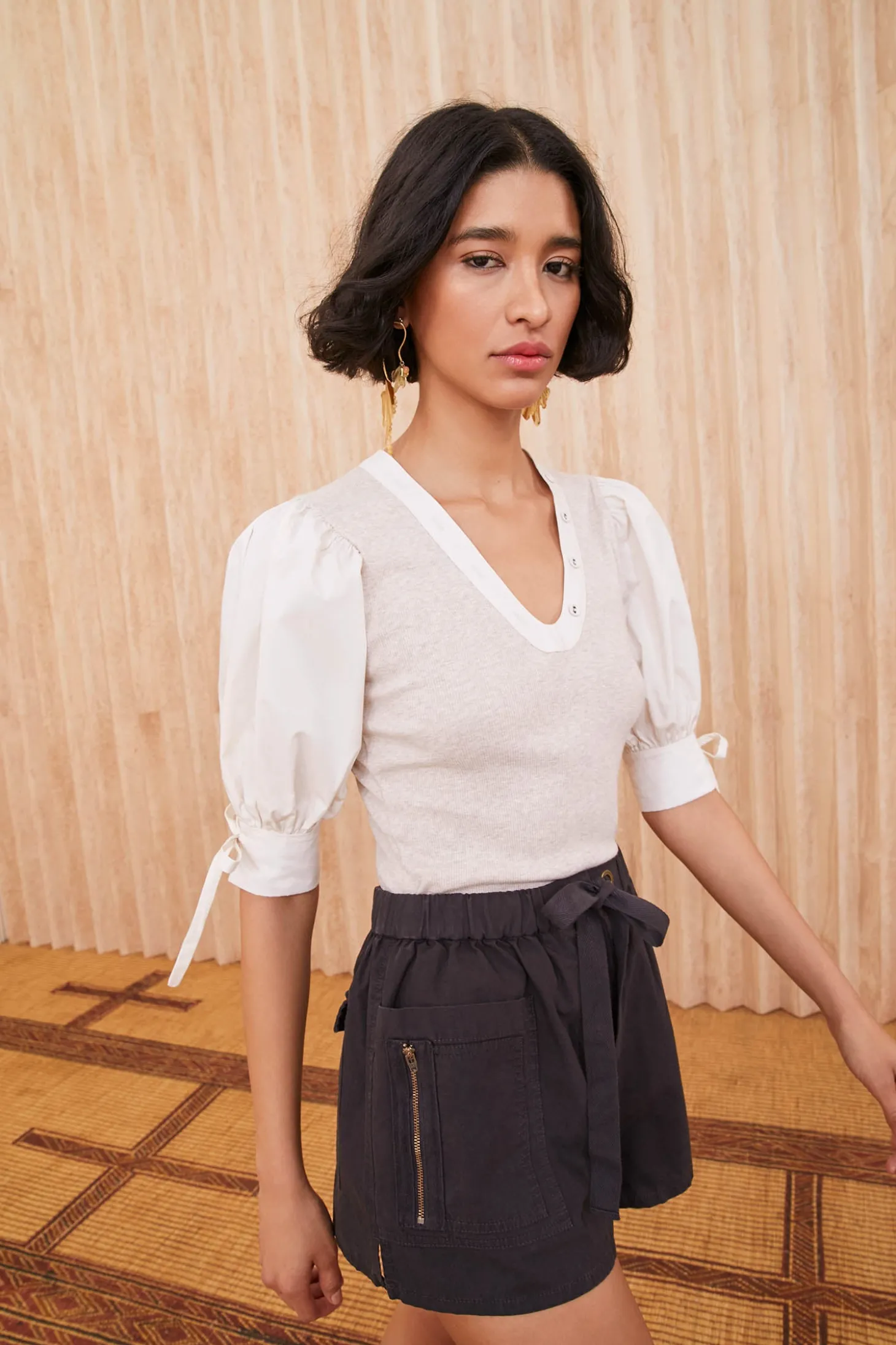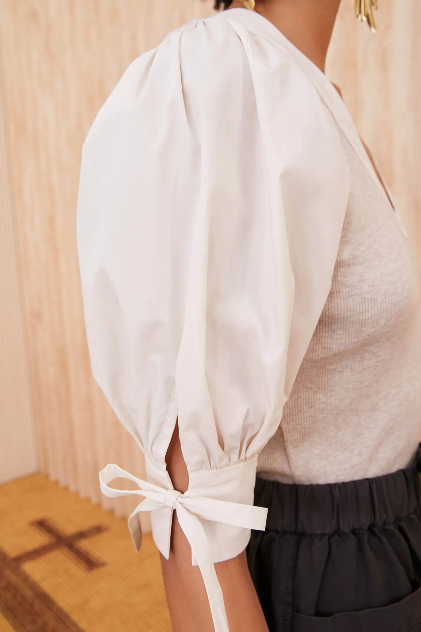 The forever favorite Pia Top is made from our favorite ribbed cotton with contrasting crisp cotton poplin sleeves. Pair it with our Wade Jean for a crisp and tailored look. Short sleeve style featuring cotton poplin balloon sleeves and a deep v-neckline.