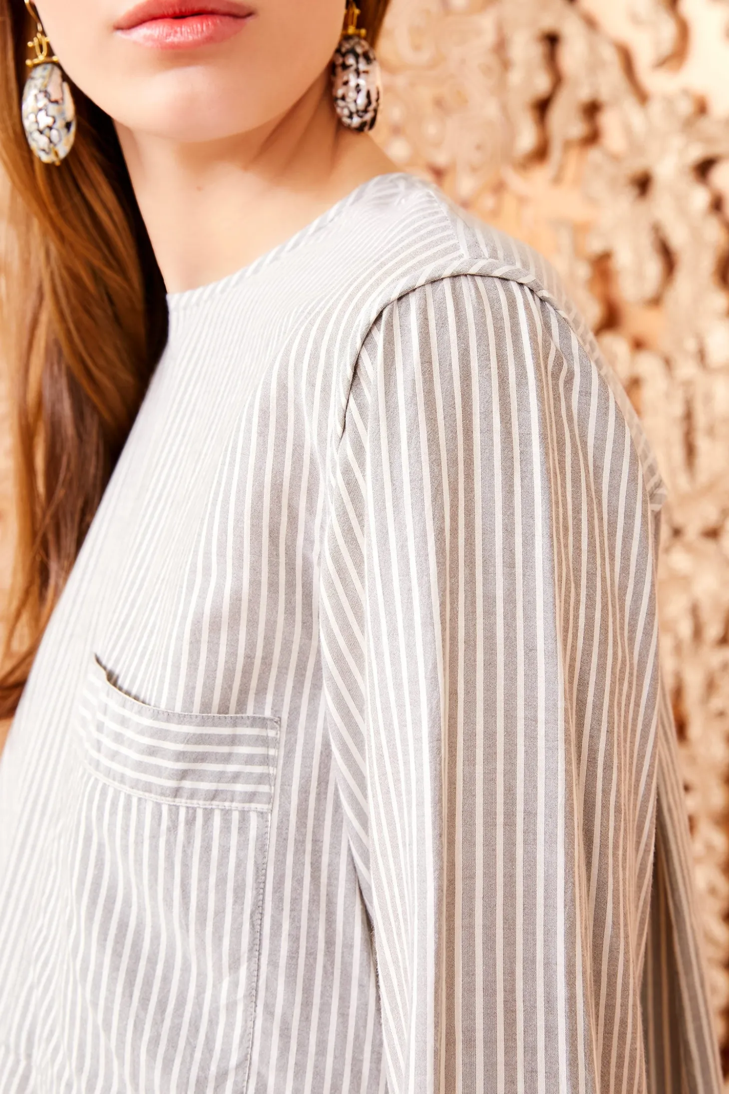 Subtly patterned with light gray stripes, our Sabine Tunic is a streamlined shape tailored from cotton and Mulberry silk that creates a soft luster. This long-sleeve style has a round neckline, a single patch pocket, and is split at the sides for easy movement. Coordinate with our Willow Jean in our new Dove wash for an effortlessly relaxed look. It fastens with a concealed back zipper.