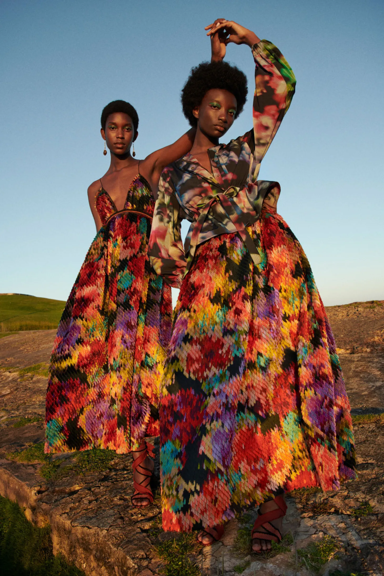The Alair Jacket is a cropped, utilitarian style crafted from water-repellent Italian nylon adorned with abstract blurred florals in shades of pink, green, and blue. This lightweight jacket features a gathered elastic waistband with a tie that creates a lovely peplum detail. The voluminous long sleeves add an elegant touch, while the zipped pockets at the chest lend an air of pragmatism. It fastens with a concealed zipper and snap buttons at the front.