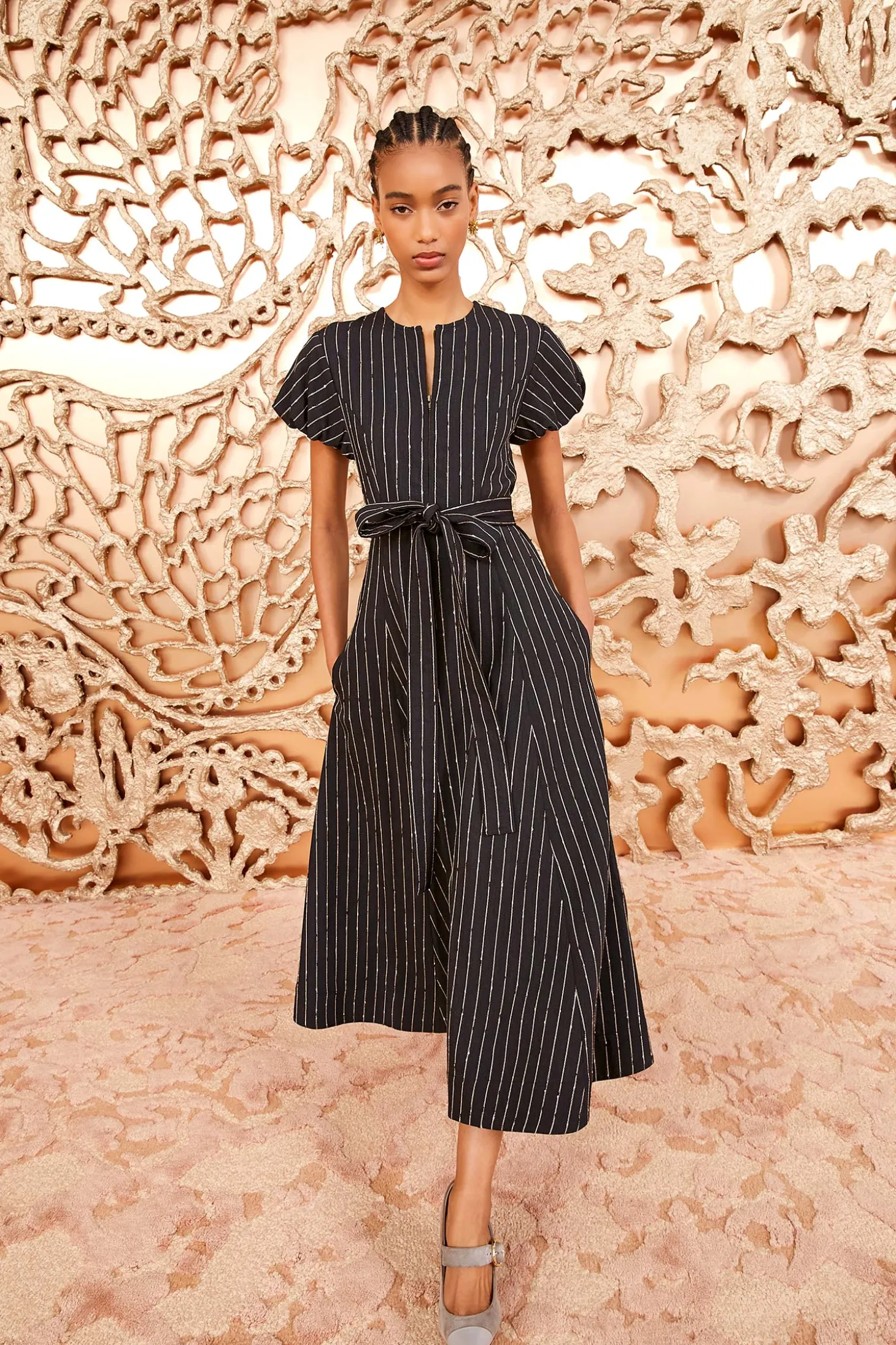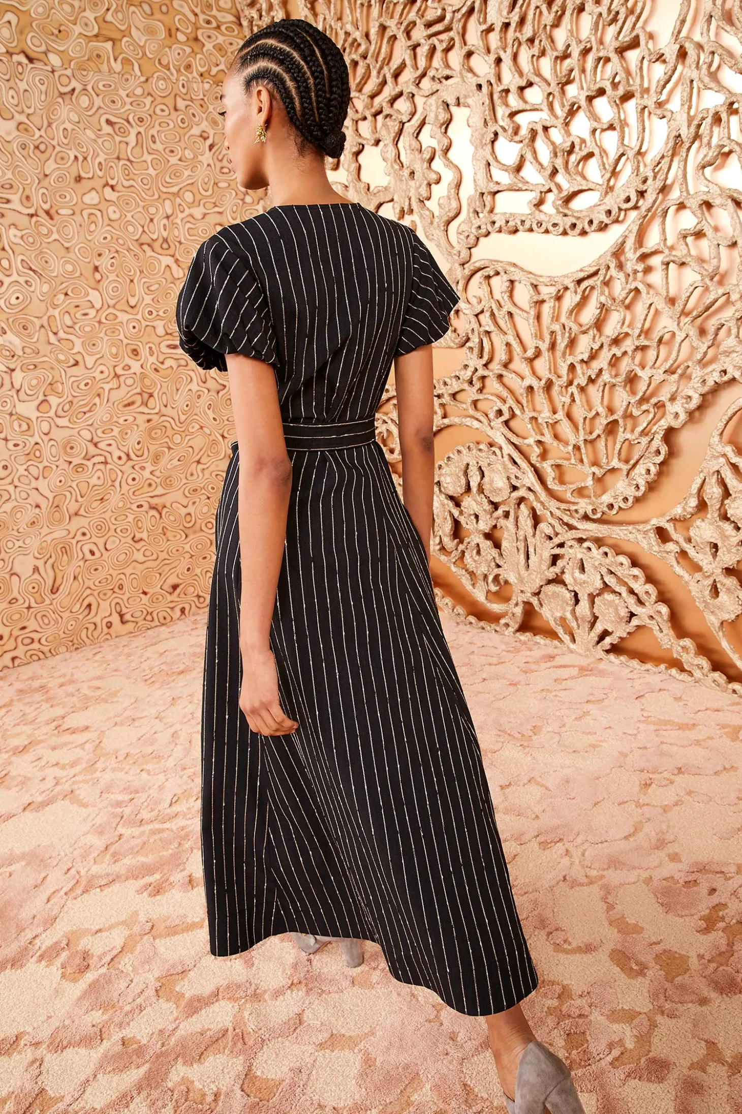 Defined by easy elegance, our Cerise Dress is a textural beauty made from our new Italian wool suiting with classic pinstripes. This black frock has our signature puff shoulders and a timeless, A-line cut cinched with a removable fabric belt. It floats to a midi hemline and has a front zipper fastening.