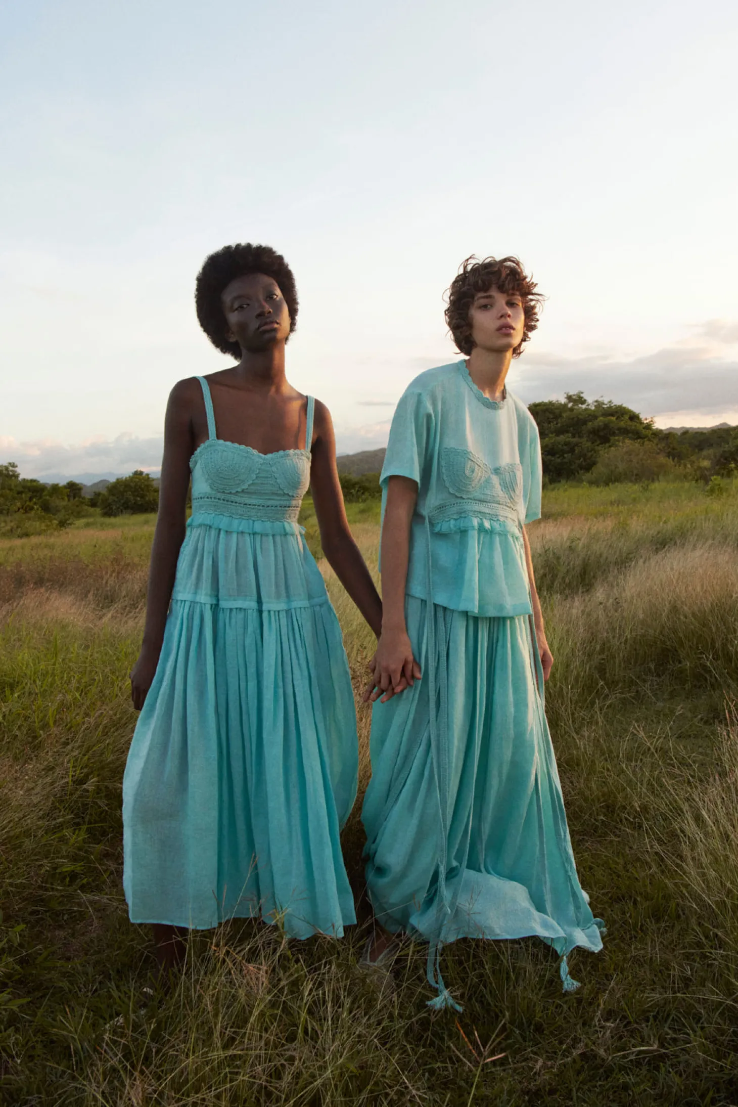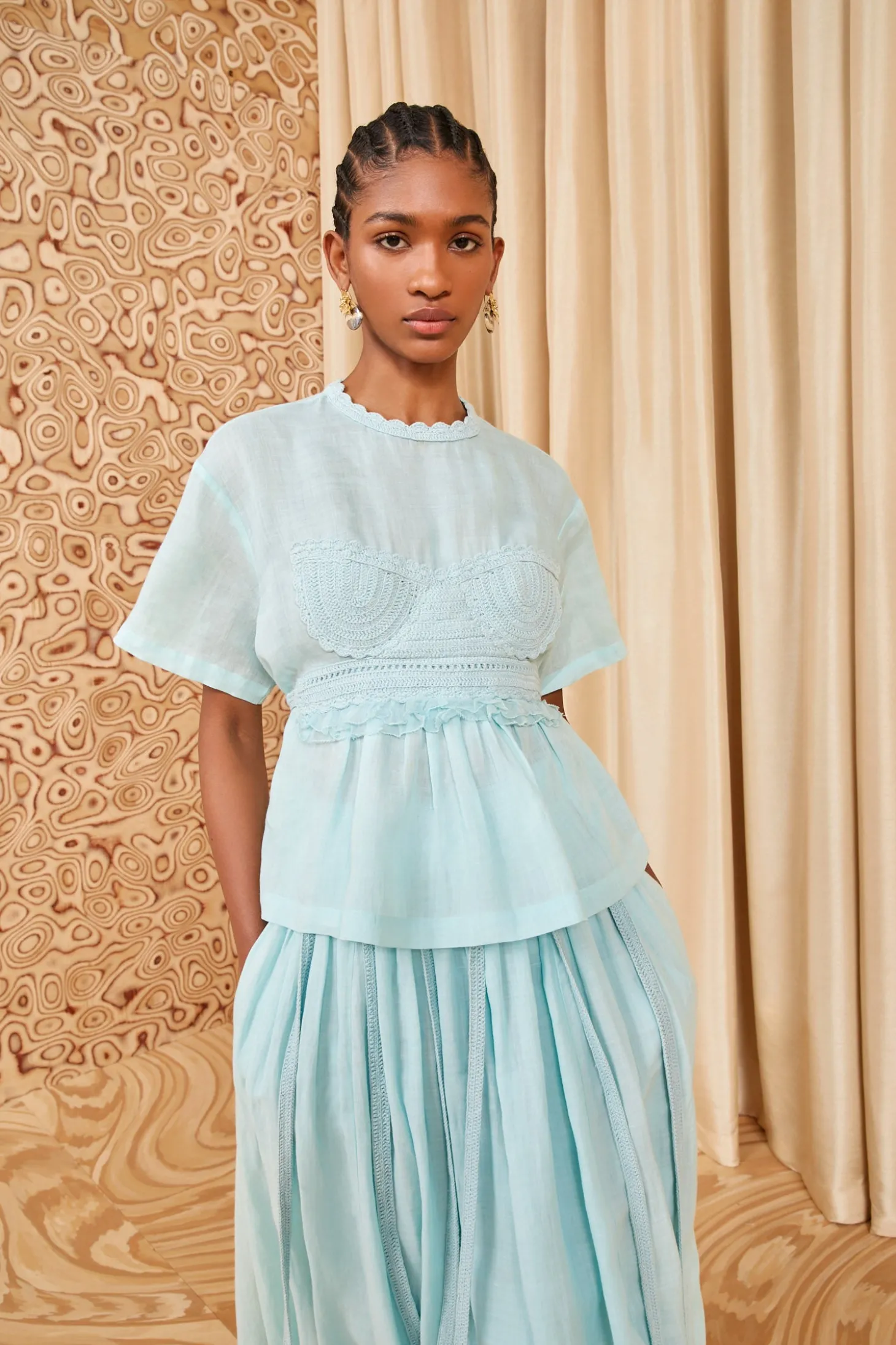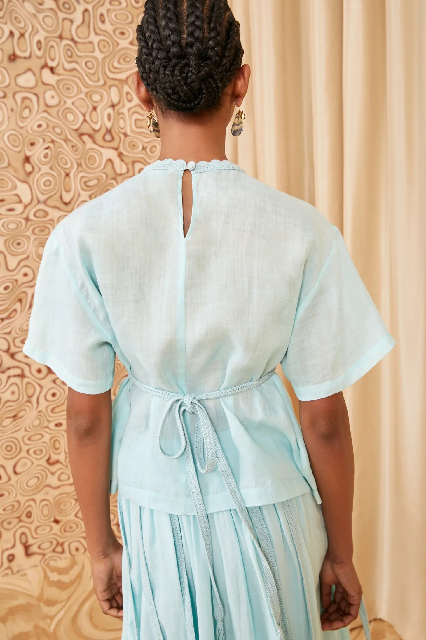 The Cari Top is a modern and feminine T-shirt crafted from ramie, an eco-friendly fabric made from plant fibers that’s soft and lightweight. Tinged a delicate light blue, this loose-fitting style is appliquéd with hand-crocheted cotton that’s carefully engineered to outline the form for a perfect fit. The waist ties can be tied to cinch the silhouette, or left swaying for a unique tassel-like effect. It fastens with a buttoned keyhole at the back.