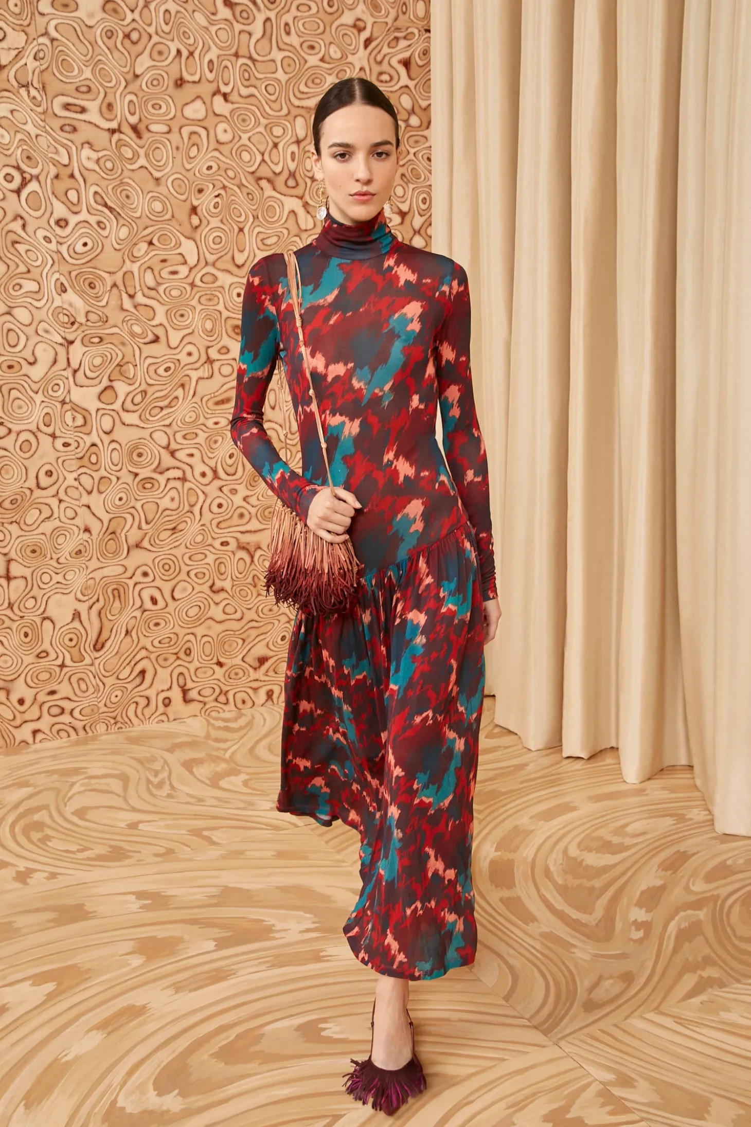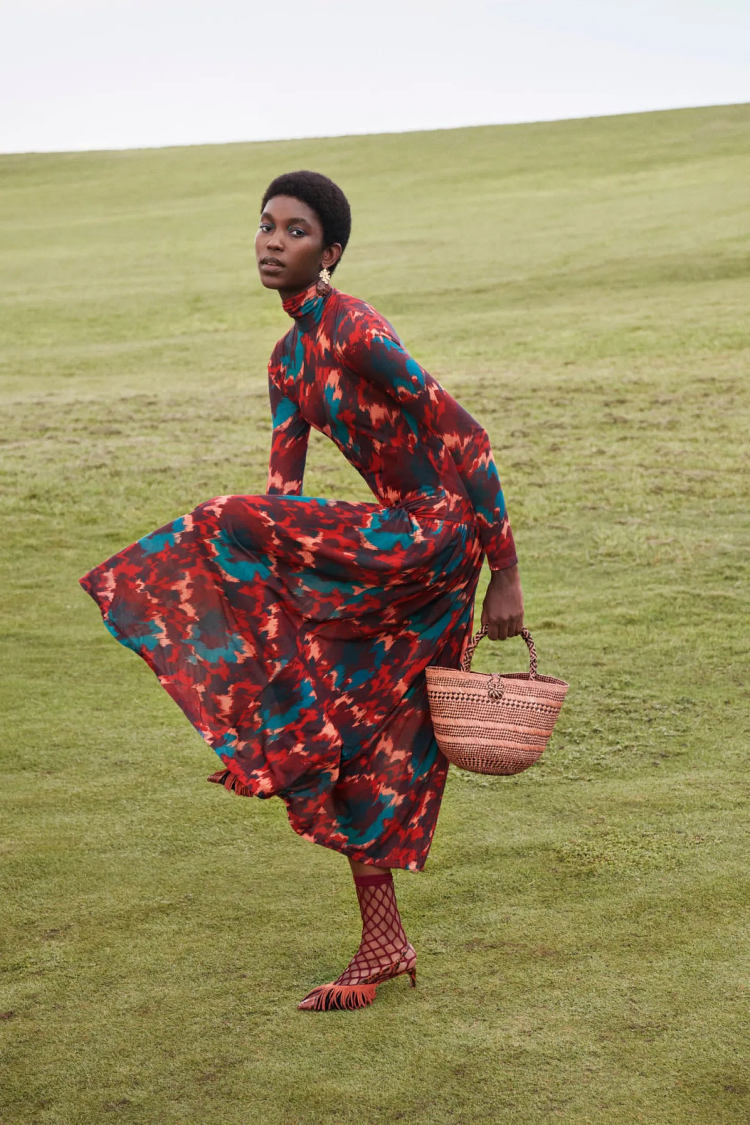 Our beloved Fernanda Dress is reimagined in our tissue weight jersey that’s silky-smooth and printed with an abstract floral ikat motif in shades of red and blue. It features a high turtle neckline with long fitted sleeves and unfurls to a flattering silhouette designed to fit close to the body.