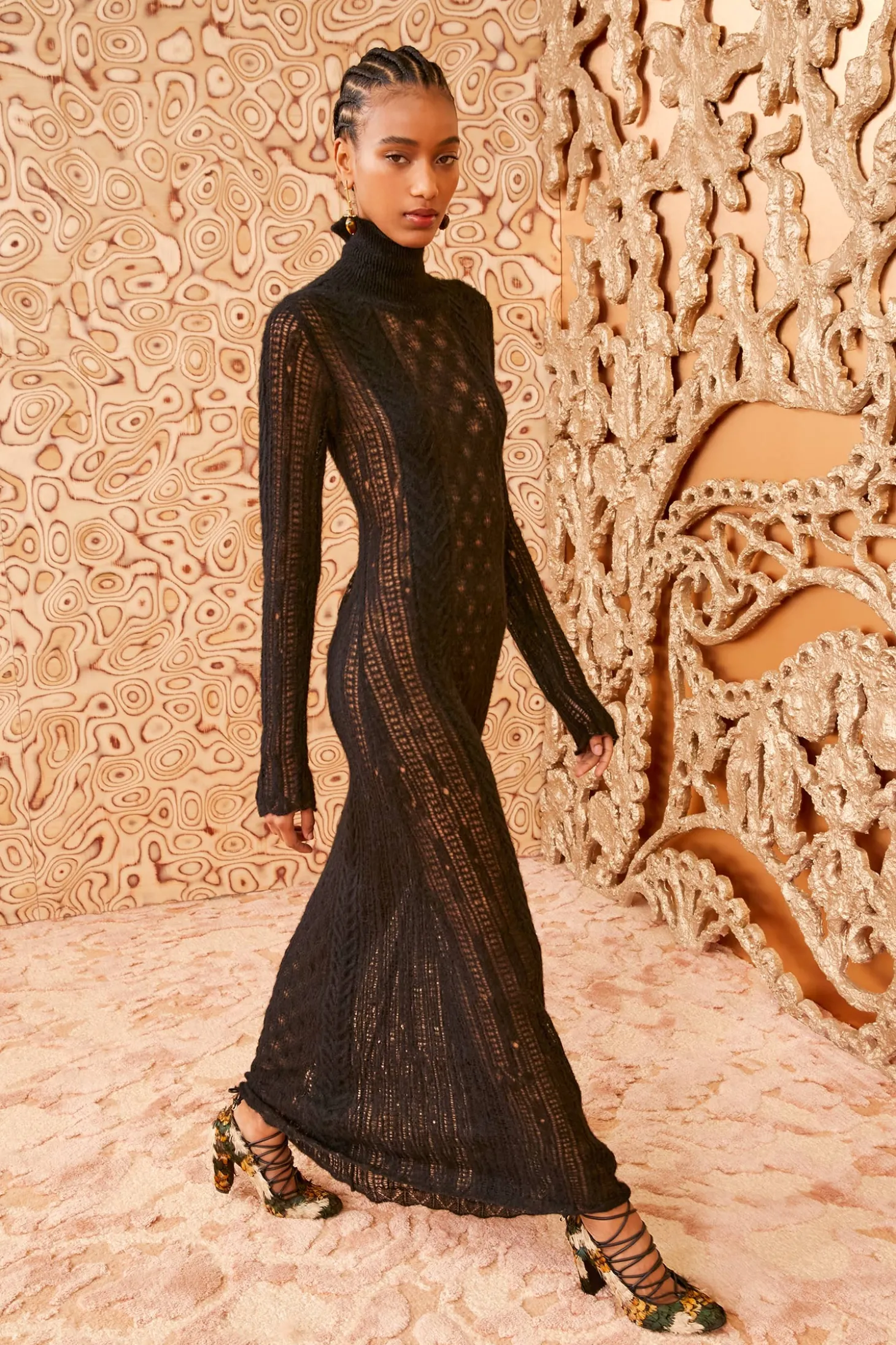 Reflecting the beauty of artisanal craft, our Kassia Dress was created by skilled makers in Peru from a luxurious blend of baby alpaca and merino wool. This long-sleeve black dress features intricate lace stitching with open and cable motifs that skim the form. It has an elegant turtleneck, is unlined, and has an ankle-grazing hemline.