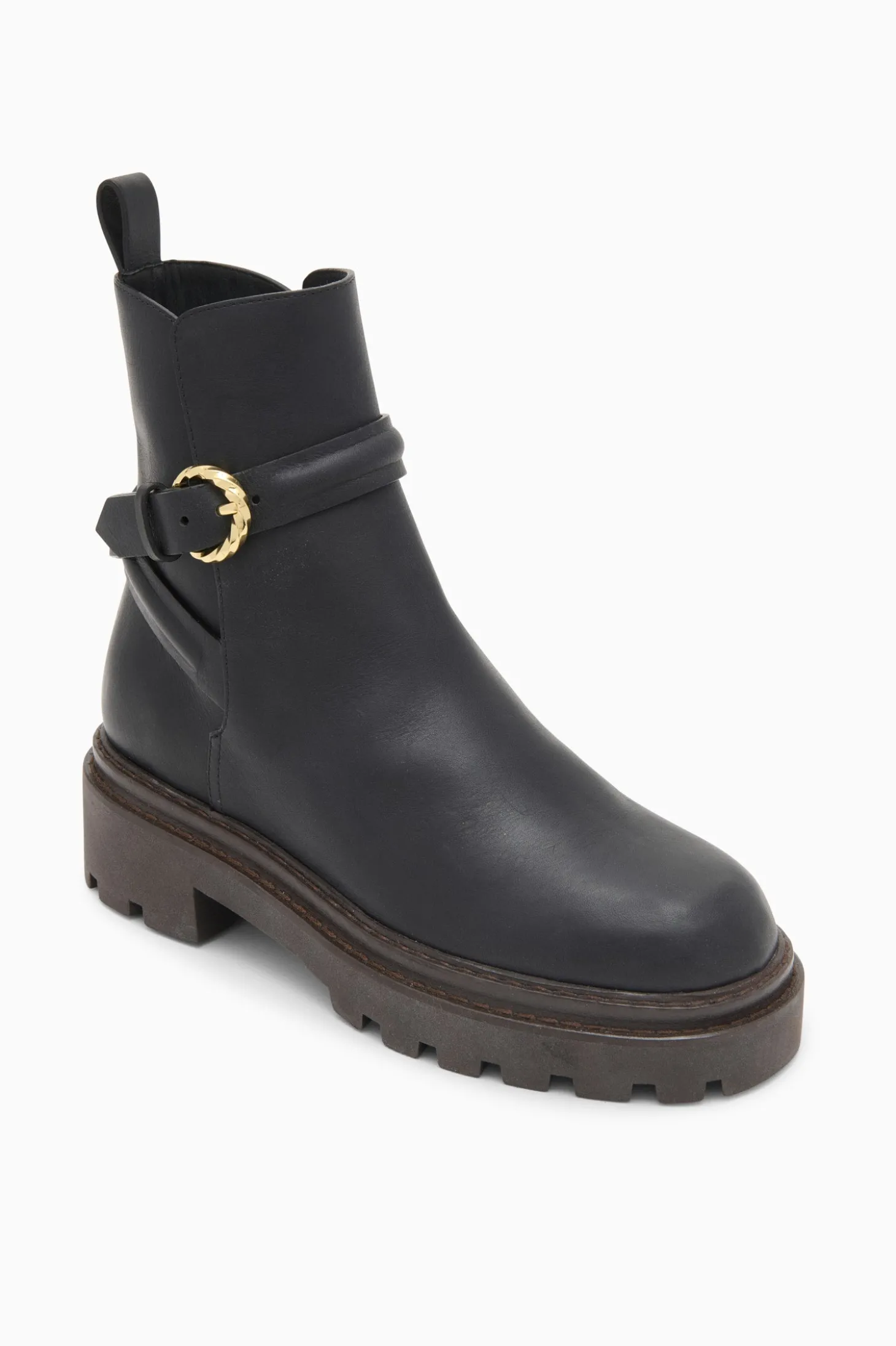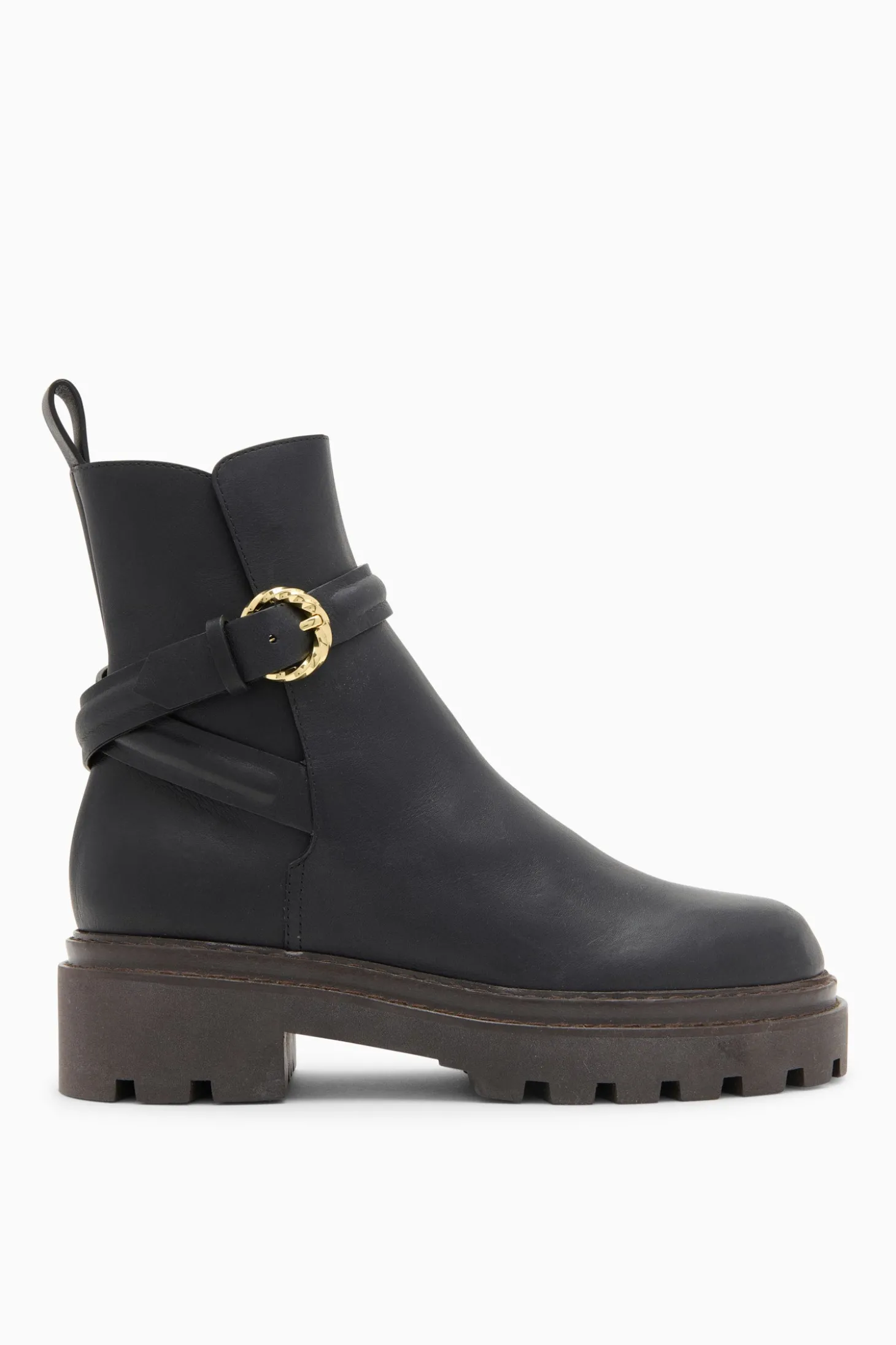 Our Lennon Boot is constructed from luxurious black vachetta leather that ages beautifully with time. This sturdy silhouette is adorned with our new signature twisted buckle in shiny antique brass, while the lug outsole is designed for enhanced comfort and longevity. It has a round toe and pull tabs for easy wear.