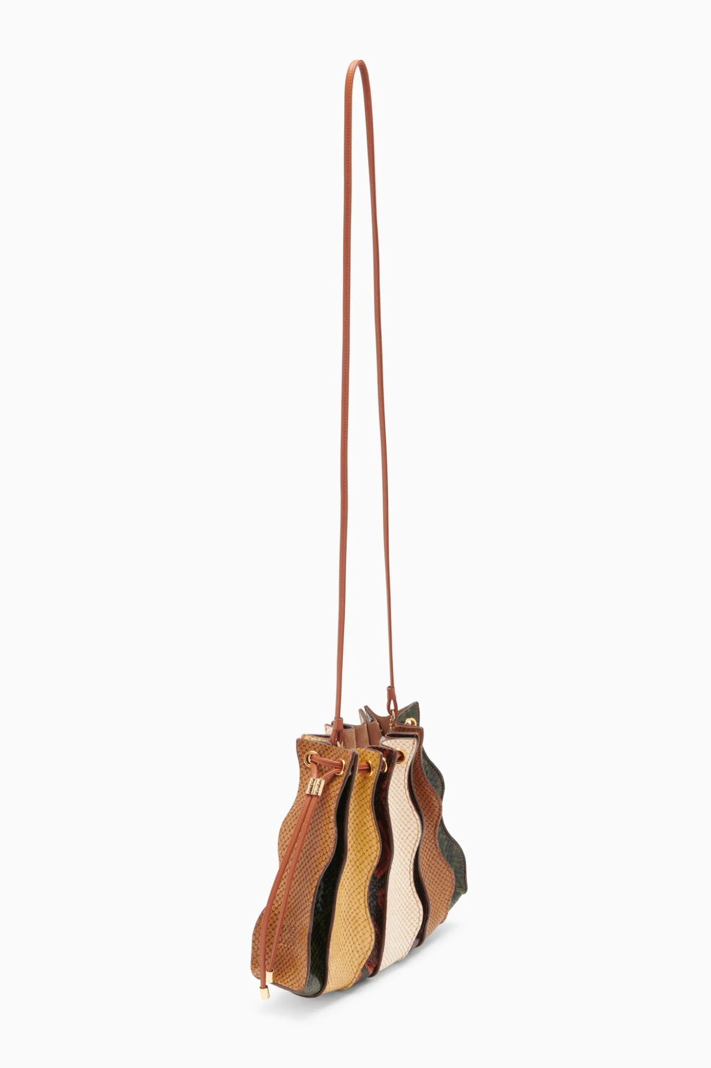 Our beloved Adria Crossbody returns in multi-hued, python-embossed leather that adds a dynamic touch to your wardrobe favorites and evening ensembles. This sculptural beauty is made from multiple strips of leather that are sewn together and then finished with painted edges, accentuating the beauty of the waves. It has a drawstring opening that reveals a suede-lined interior that fits your essentials and is finished with lustrous antique brass accents.