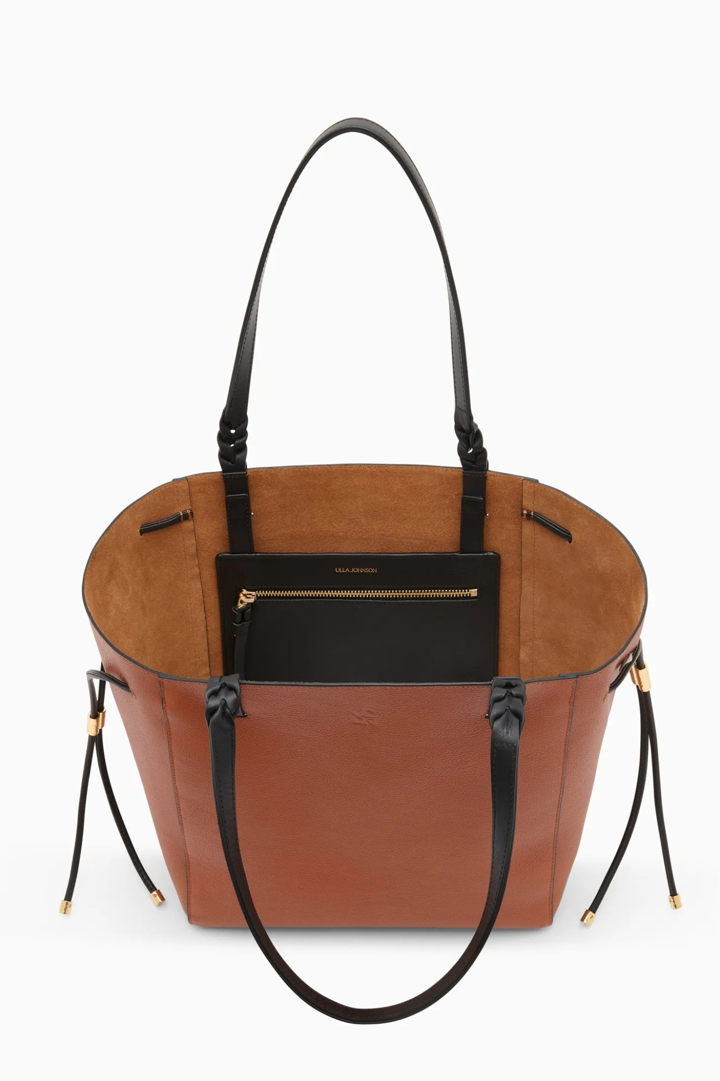 Our signature Alma Tote is the perfect everyday size—spacious but still compact and elegant. Crafted from brown pebbled leather, it features exquisite braided detailing at the black handles and side drawstrings that can cinch or expand the silhouette. This style easily slips over your shoulder, and it has a suede-lined interior with a convenient zipped pocket.