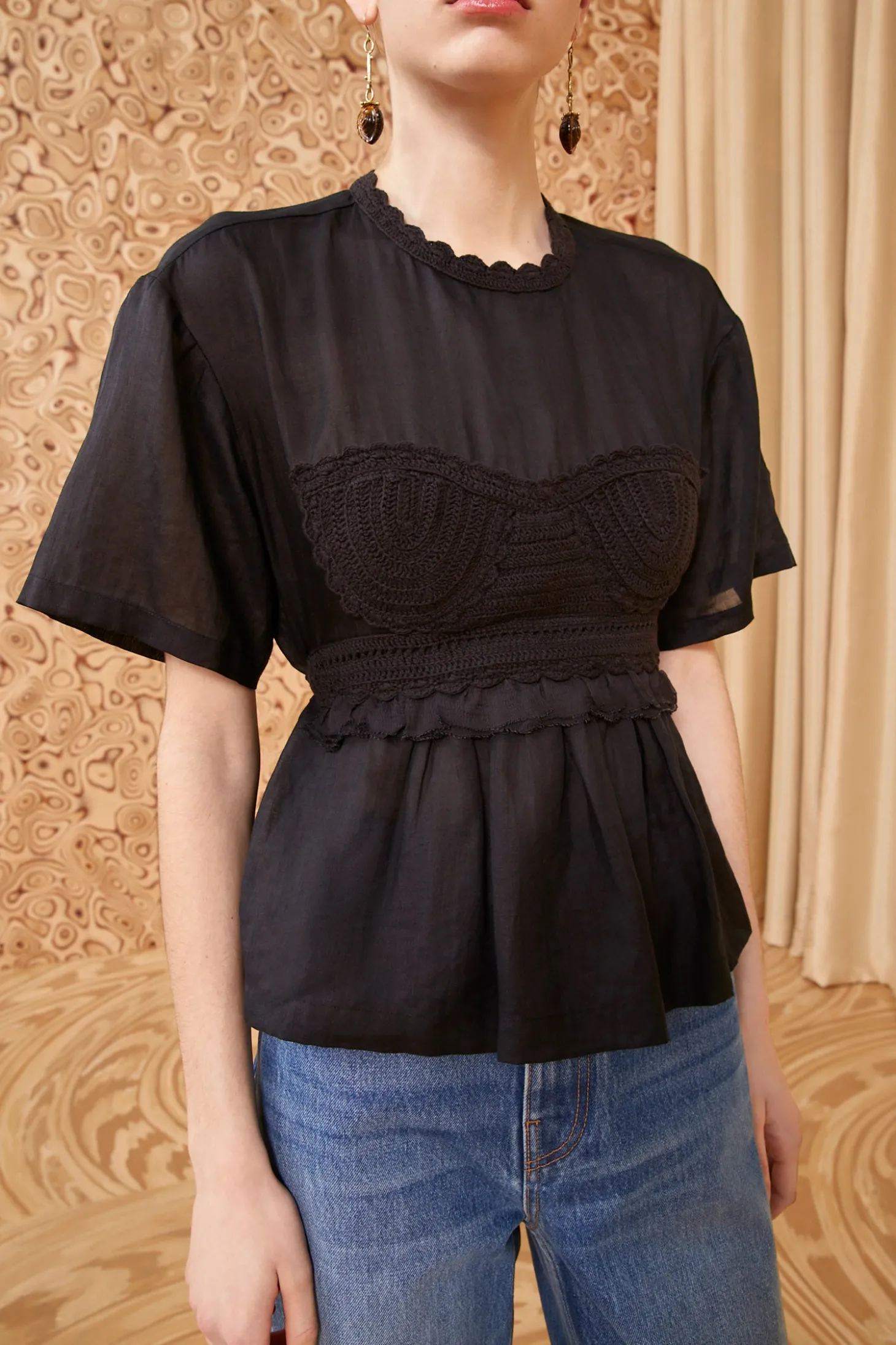 The Cari Top is a modern and feminine T-shirt crafted from ramie, an eco-friendly fabric made from plant fibers that’s soft and lightweight. Arriving in versatile black, this loose-fitting style is appliquéd with hand-crocheted cotton that’s carefully engineered to outline the form for a perfect fit. The waist ties can be tied to cinch the silhouette, or left swaying for a unique tassel-like effect. It fastens with a buttoned keyhole at the back.