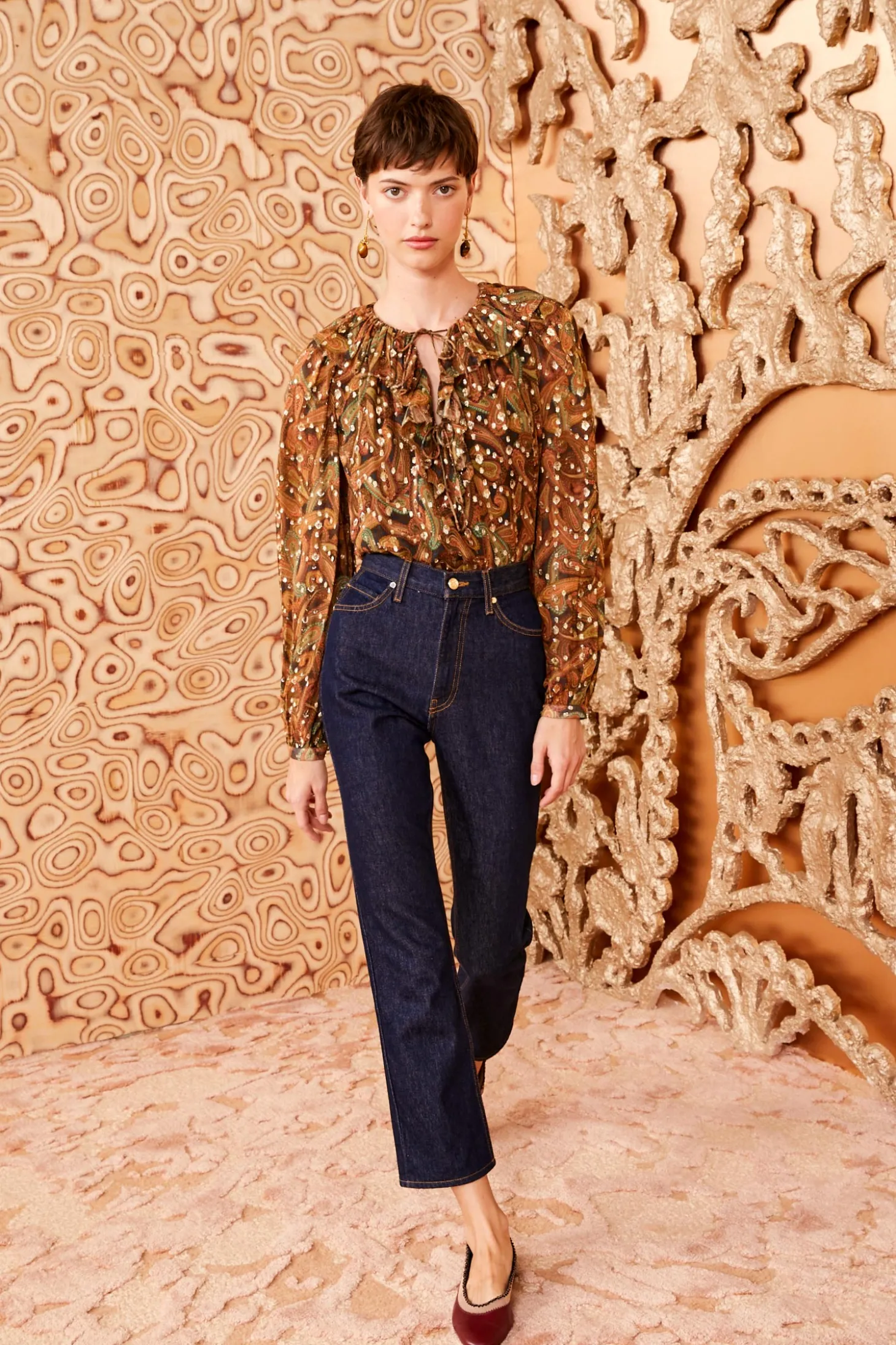 An ethereal beauty, our crinkle chiffon Emilie Blouse comes alive with golden lurex dots that are woven into the fabric and vibrant paisleys inspired by hand-painted artwork. This romantic, long-sleeve style arrives in deep gold and brown hues, has a ruffled collar that spills out across the neckline, and has double ties that fasten at the front. It pairs effortlessly with our handcrafted denim and tailored separates.