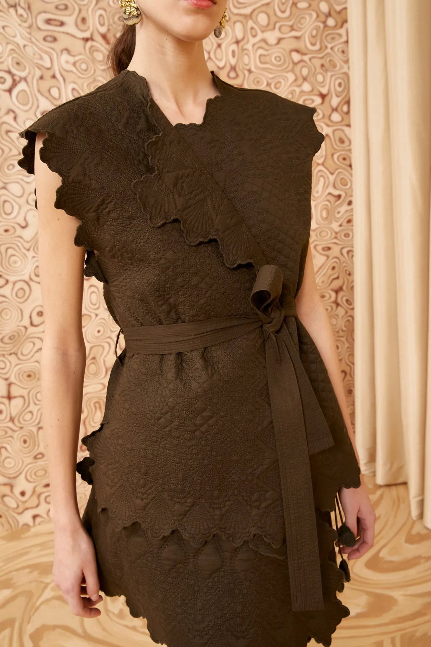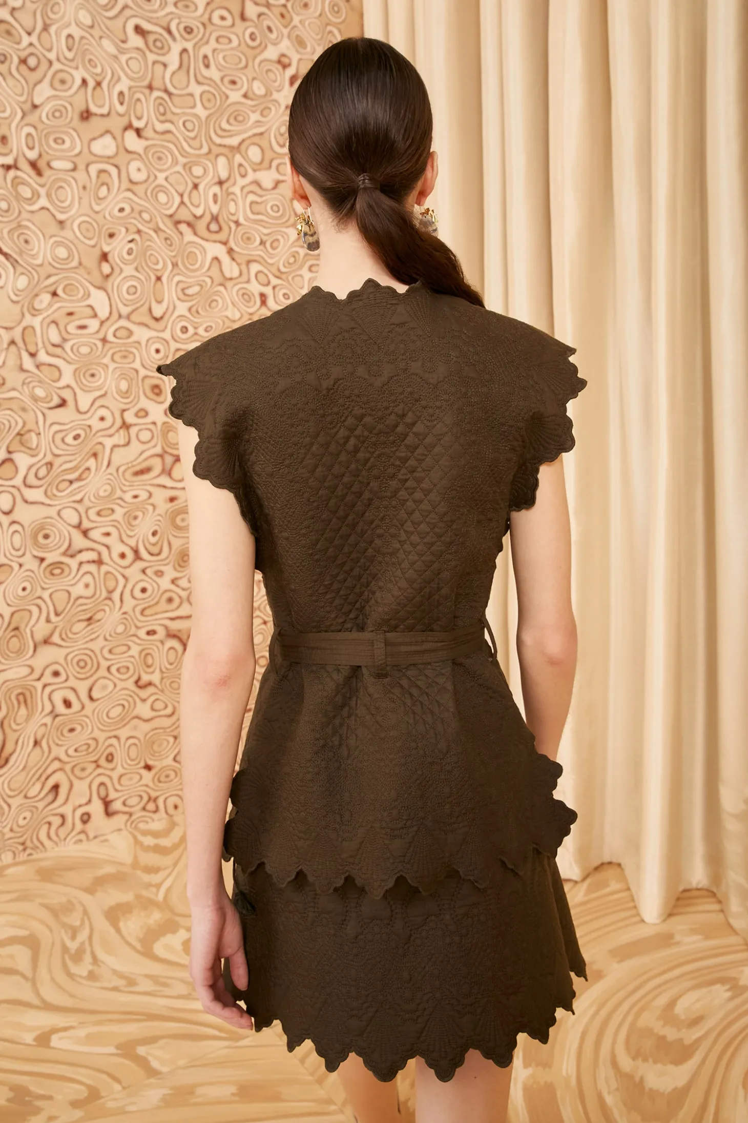Featured in Look 29 of our Pre-Fall 2024 Lookbook, our Leiro Vest is artfully embroidered with undulating diamond motifs inspired Victorian quilting. Tinged a rich dark green, this sleeveless style is made from cotton voile that’s lightly padded and is trimmed with geometric scalloping that makes the silhouette come alive. This versatile lovely can be worn fully closed and cinched with the removable belt, or layered and worn open for a more effortless day look.
