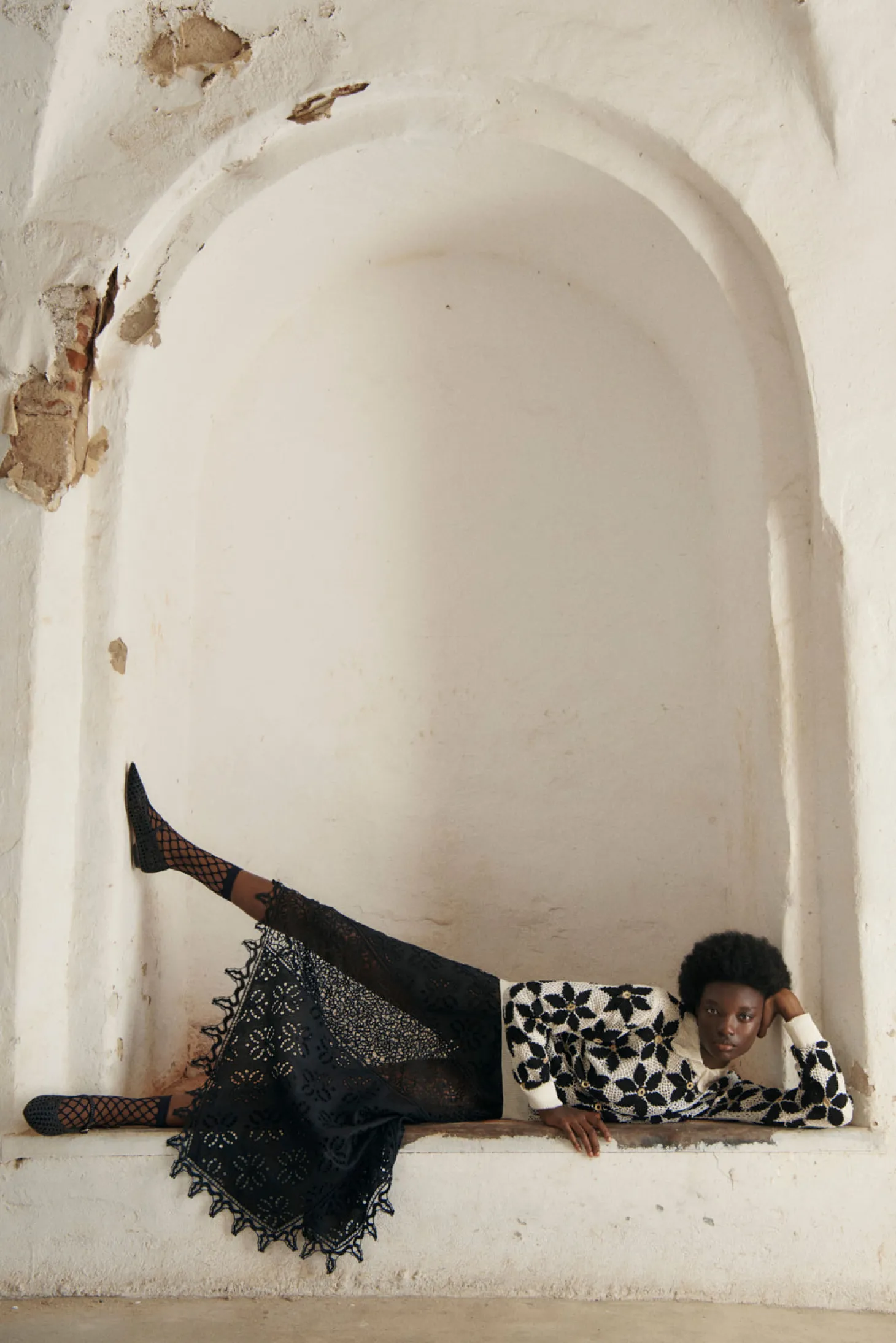 Featured in Look 7 of our Pre-Fall 2024 Lookbook, the Nico Pullover is completely hand-crocheted by our artisan partners in Peru, making each piece beautifully unique. This black, white, and yellow style is designed to be elegantly oversized and features crocheted flowers that are held together with mesh stitches.