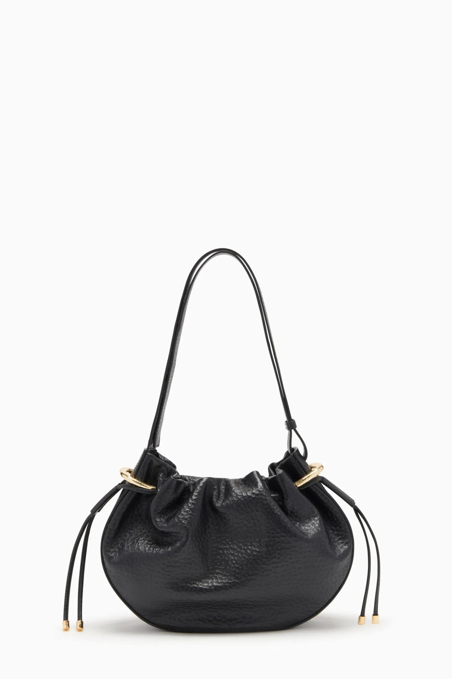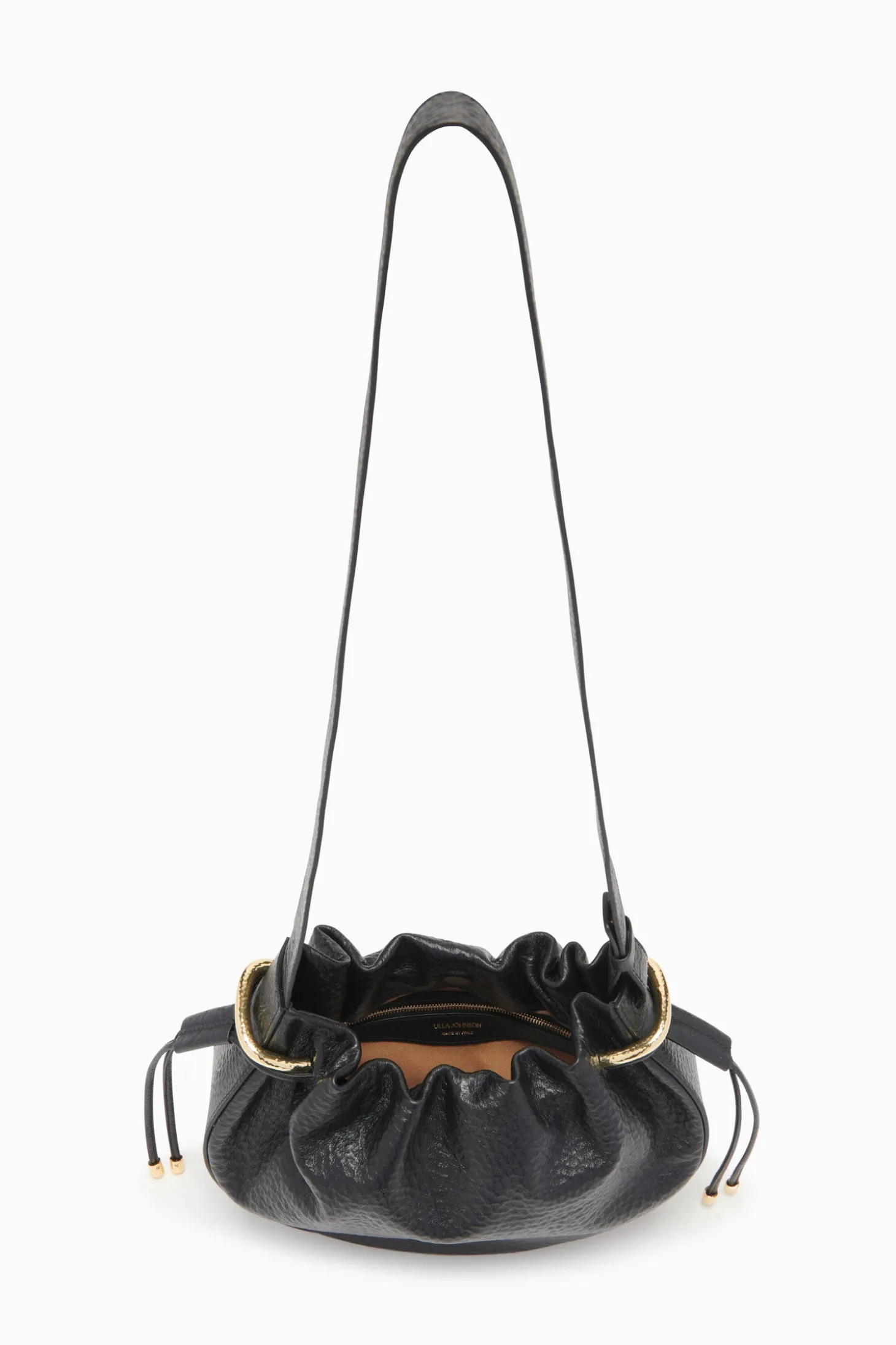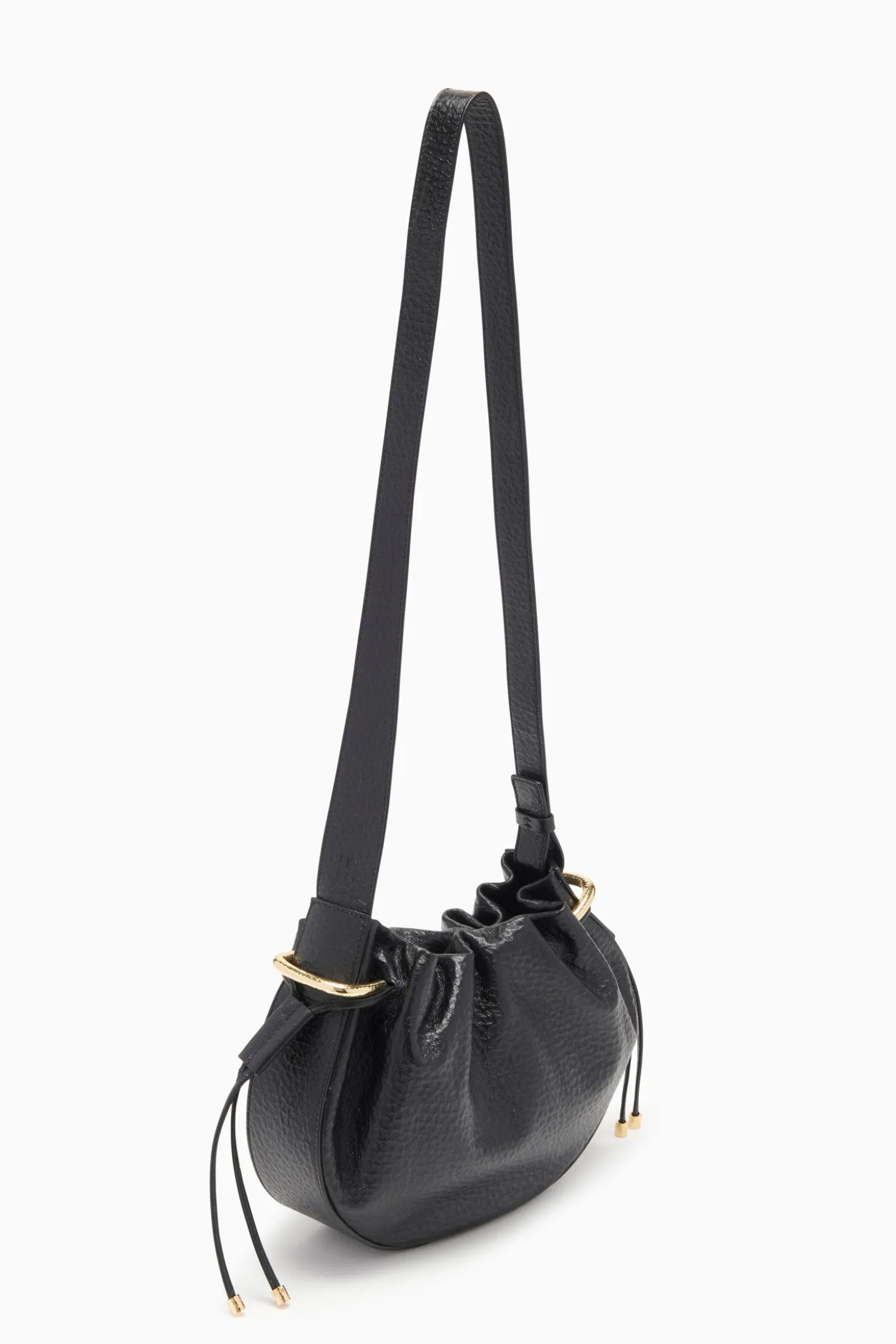 Our Tilda Ruched Crossbody is a beautifully gathered silhouette made in Italy from shiny textured leather in classic black. It has a roomy, cotton-lined interior sized for daily essentials and has an adjustable strap that can be worn crossbody or as a shorter shoulder bag. It is finished with antique brass accents and fastens with an internal magnetic closure at the top.