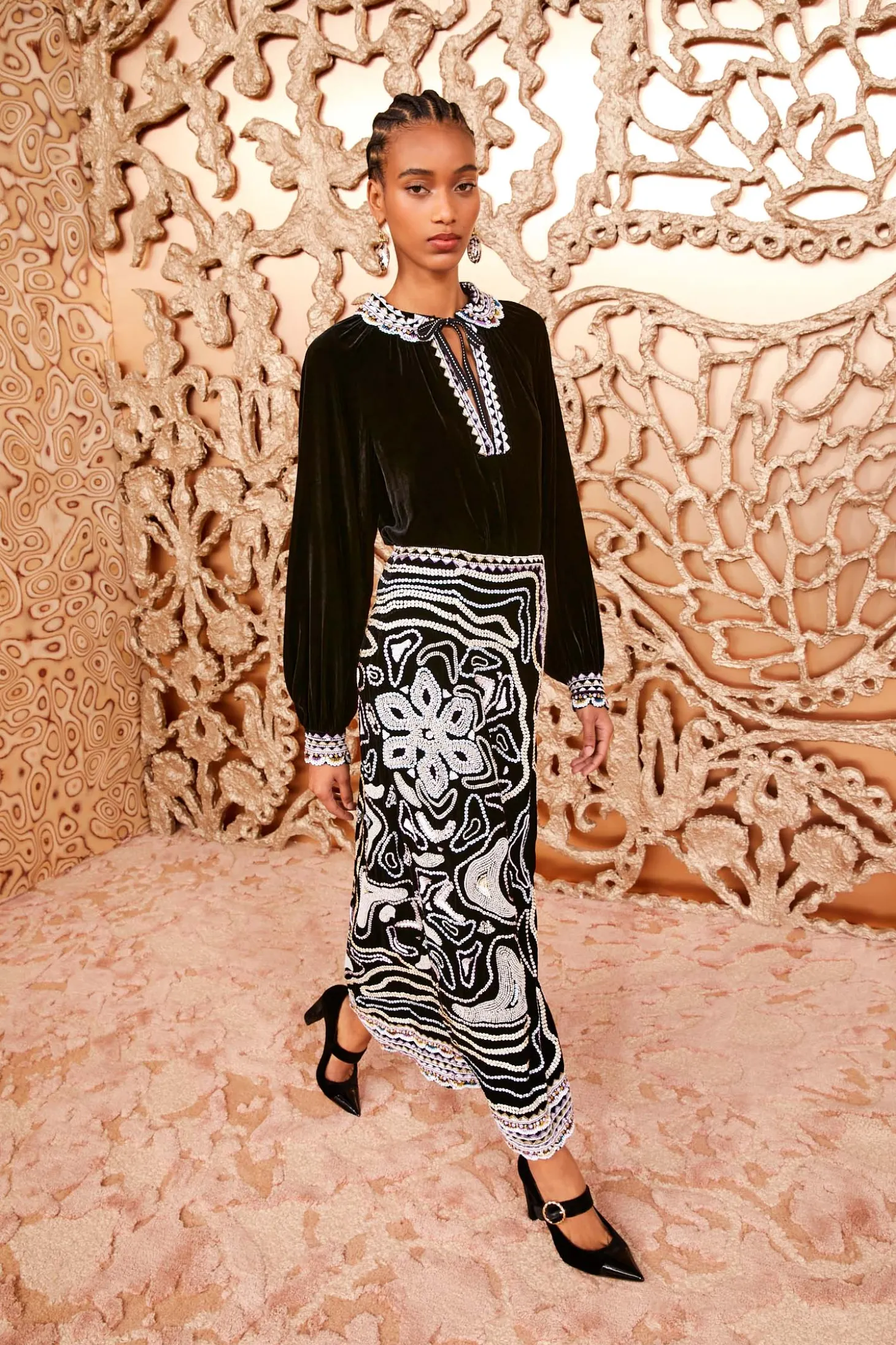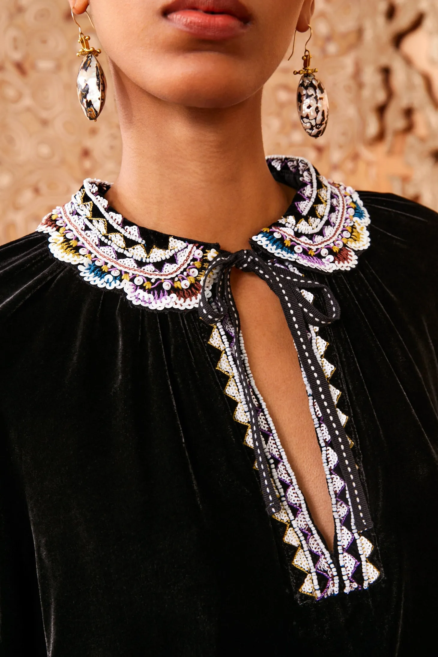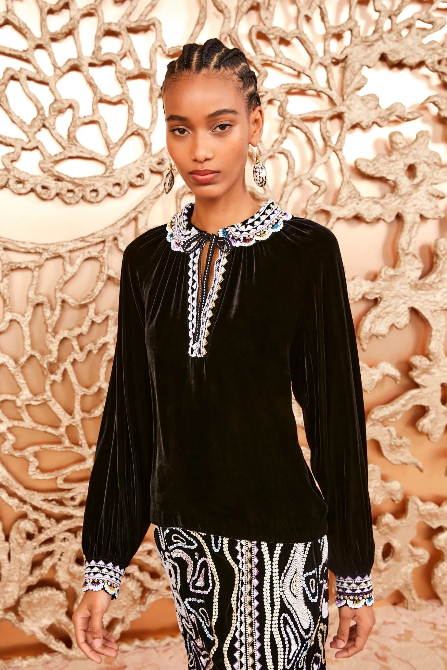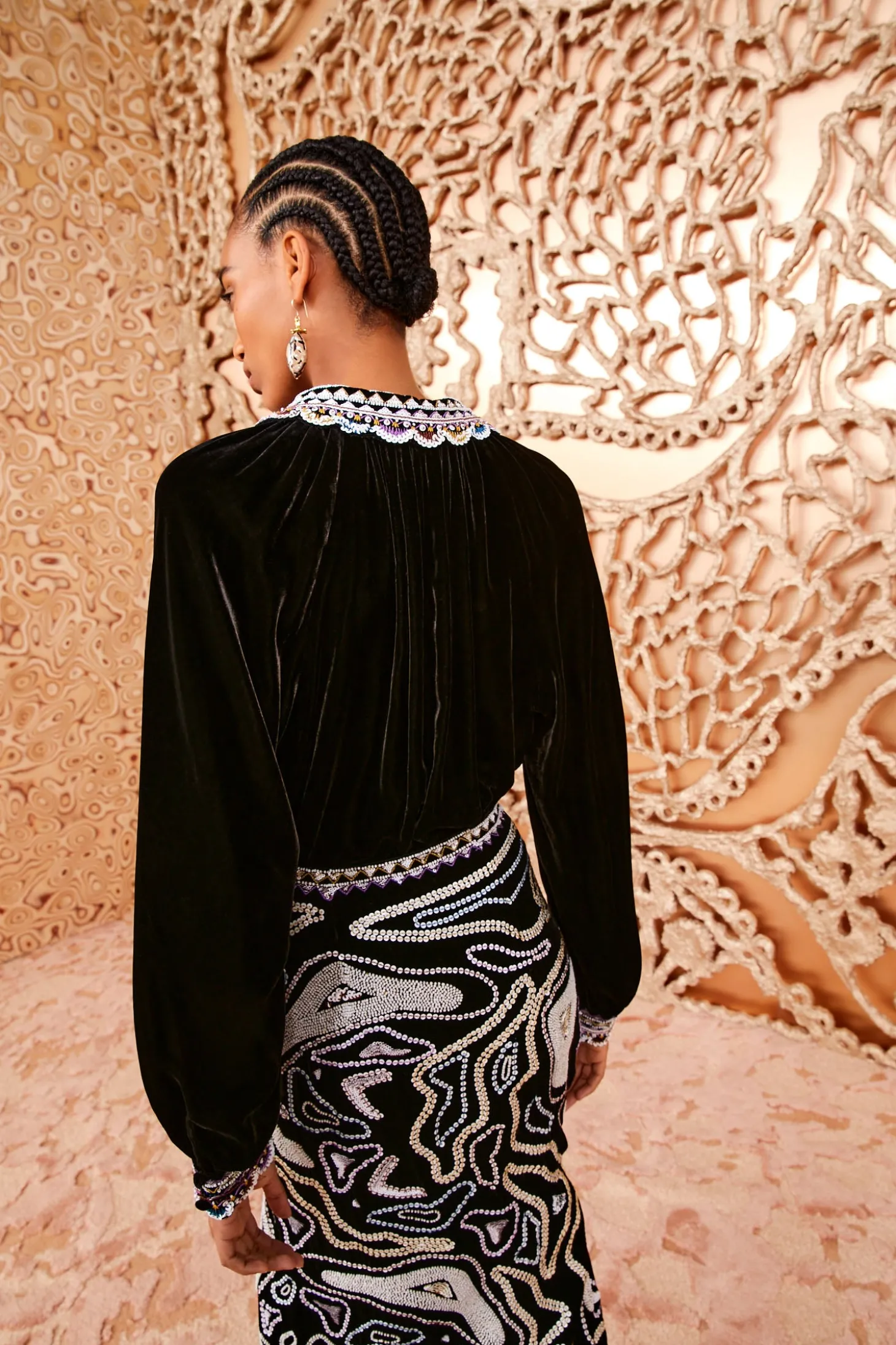 Our Julien Top is made from exquisite silk-blend velvet that’s hand-embroidered in India with sequins, beads, and threads that bring beauty and dimension to the neckline and collar. This stunning, black silhouette has a deep V-neckline with ties that fasten into a bow and voluminous long sleeves. Style yours with our Adara Skirt.