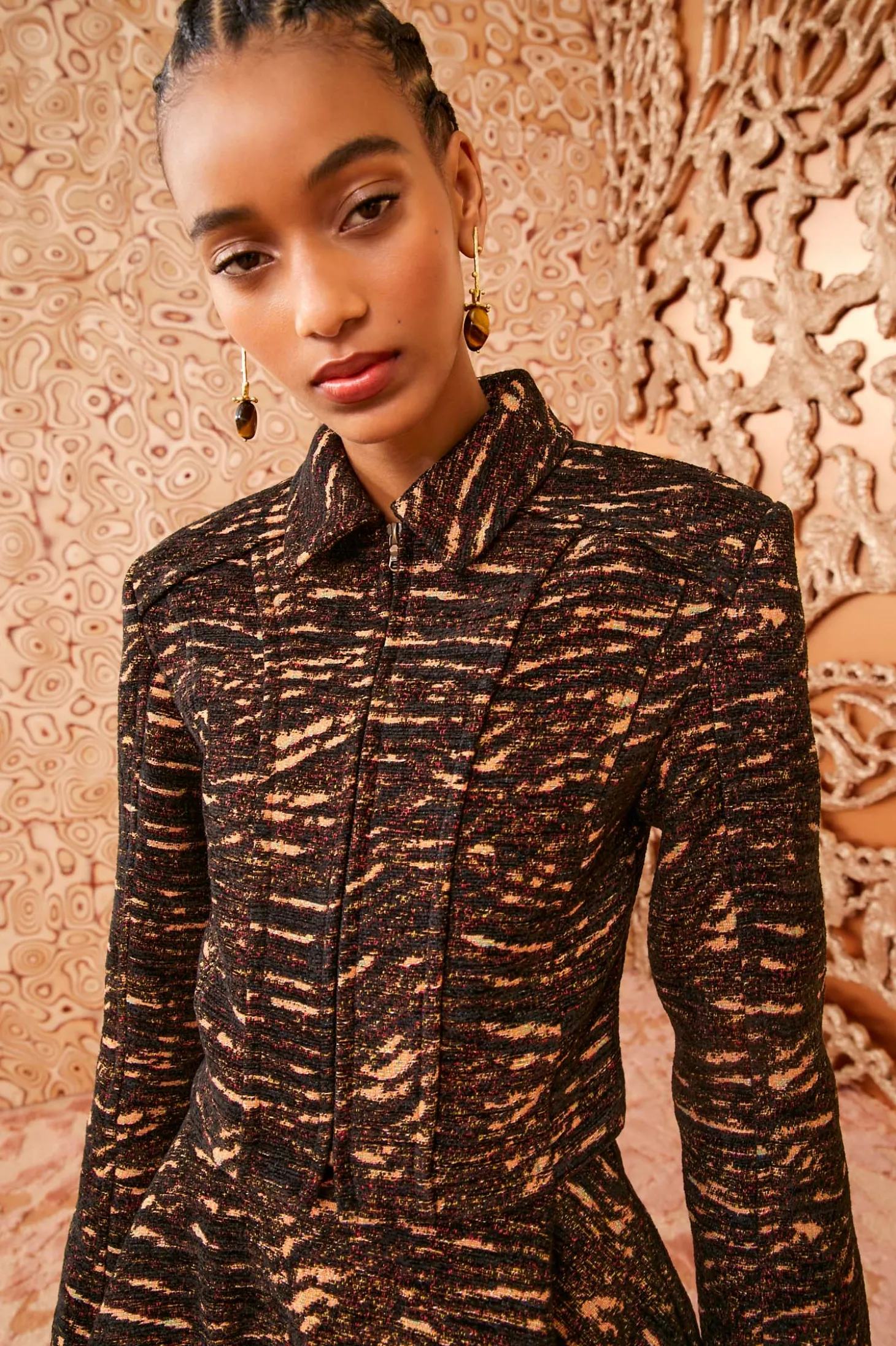 As featured in Look 29 of our Autumn/Winter 2024 runway show, the Adoni Jacket arrives in Italian-made, animalesque chenille coating that’s mid-weight and velvet-soft. This beautifully tailored black and tan jacket features a cropped silhouette with a classic collar, structural shoulders, and fastens with a front zipper. Coordinate with our Elise Skirt, as styled on the runway.